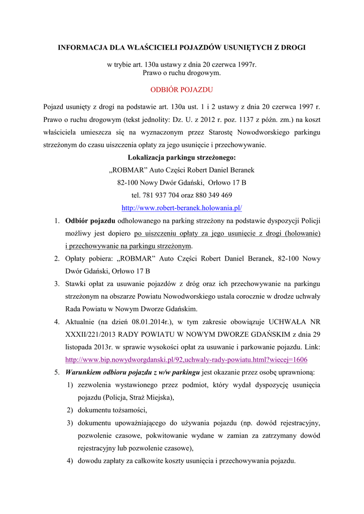 INFORMACJA DLA WŁAŚCICIELI POJAZDÓW USUNIĘTYCH Z DROGI w trybie art. 130a ustawy z dnia 20 czerwca 1997r. Prawo o ruchu drogowym. ODBIÓR POJAZDU Pojazd usunięty z drogi na podstawie art. 130a ust. 1 i 2 ustawy z dnia 20 czerwca 1997 r. Prawo o ruchu drogowym (tekst jednolity: Dz. U. z 2012 r. poz. 1137 z późn. zm.) na koszt właściciela umieszcza się na wyznaczonym przez Starostę Nowodworskiego parkingu strzeżonym do czasu uiszczenia opłaty za jego usunięcie i przechowywanie. Lokalizacja parkingu strzeżonego: „ROBMAR” Auto Części Robert Daniel Beranek 82-100 Nowy Dwór Gdański, Orłowo 17 B tel. 781 937 704 oraz 880 349 469 http://www.robert-beranek.holowania.pl/ 1. Odbiór pojazdu odholowanego na parking strzeżony na podstawie dyspozycji Policji możliwy jest dopiero po uiszczeniu opłaty za jego usunięcie z drogi (holowanie) i przechowywanie na parkingu strzeżonym. 2. Opłaty pobiera: „ROBMAR” Auto Części Robert Daniel Beranek, 82-100 Nowy Dwór Gdański, Orłowo 17 B 3. Stawki opłat za usuwanie pojazdów z dróg oraz ich przechowywanie na parkingu strzeżonym na obszarze Powiatu Nowodworskiego ustala corocznie w drodze uchwały Rada Powiatu w Nowym Dworze Gdańskim. 4. Aktualnie (na dzień 08.01.2014r.), w tym zakresie obowiązuje UCHWAŁA NR XXXII/221/2013 RADY POWIATU W NOWYM DWORZE GDAŃSKIM z dnia 29 listopada 2013r. w sprawie wysokości opłat za usuwanie i parkowanie pojazdu. Link: http://www.bip.nowydworgdanski.pl/92,uchwaly-rady-powiatu.html?wiecej=1606 5. Warunkiem odbioru pojazdu z w/w parkingu jest okazanie przez osobę uprawnioną: 1) zezwolenia wystawionego przez podmiot, który wydał dyspozycję usunięcia pojazdu (Policja, Straż Miejska), 2) dokumentu tożsamości, 3) dokumentu upoważniającego do używania pojazdu (np. dowód rejestracyjny, pozwolenie czasowe, pokwitowanie wydane w zamian za zatrzymany dowód rejestracyjny lub pozwolenie czasowe), 4) dowodu zapłaty za całkowite koszty usunięcia i przechowywania pojazdu. 6. Po uiszczeniu opłaty, w celu odbioru pojazdu należy udać się na parking strzeżony prowadzony przez Firmę „ROBMAR” Auto Części Robert Daniel Beranek, 82-100 Nowy Dwór Gdański, Orłowo 17 B. 7. Pojazd z parkingu odbiera właściciel (posiadacz) wskazany w dowodzie rejestracyjnym (pozwoleniu czasowym) lub w pokwitowaniu za zatrzymany dowód rejestracyjny (pozwolenie czasowe). WAŻNE Zgodnie z art. 130a ust. 10 ustawy z dnia 20 czerwca 1997 r. Prawo o ruchu drogowym, nieodebranie pojazdu w terminie 3 miesięcy od dnia jego usunięcia z drogi (w przypadkach określonych w art. 130a ust. 1 lub 2 w/w ustawy) spowoduje, że Starosta Nowodworski wystąpi do sądu z wnioskiem o orzeczenie przepadku przedmiotowego pojazdu na rzecz Powiatu Nowodworskiego. W przypadku orzeczenia przepadku pojazdu na rzecz Powiatu nowodworskiego koszty związane z usunięciem, przechowywaniem, oszacowaniem, sprzedażą lub zniszczeniem pojazdu powstałe od momentu wydania dyspozycji jego usunięcia do zakończenia postępowania zostaną ściągnięte od właściciela pojazdu w trybie i na zasadach określonych w ustawie z dnia 17 czerwca 1966 r. o postępowaniu egzekucyjnym w administracji (tekst jednolity: Dz. U. z 2012 r. poz. 1015). Decyzję o zapłacie tych kosztów wydaje Starosta Nowodworski. W związku z powyższym, jeżeli Twój pojazd w trybie art. 130a ust. 1 lub 2 ustawy z dnia 20 czerwca 1997 r. Prawo o ruchu drogowym (tekst jednolity: Dz. U. z 2012 r. poz. 1137 z późn. zm) został usunięty na parking strzeżony, nie czekaj aż kwota na rachunku za jego usunięcie i przechowanie przekroczy wartość pojazdu. Odbierz go i pokryj należność, póki rachunek nie sięgnie tysięcy złotych! Postępowanie może trwać wiele miesięcy - przez cały czas rosną koszty, które obciążają właściciela (posiadacza) pojazdu.