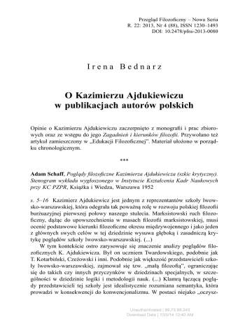 Przegląd Filozoficzny – Nowa Seria R. 22: 2013, Nr 4 (88), ISSN 1230–1493 DOI: 10.2478/pfns-2013-0080 Irena Bednarz O Kazimierzu Ajdukiewiczu w publikacjach autorów polskich Opinie o Kazimierzu Ajdukiewiczu zaczerpnięto z monografii i prac zbiorowych oraz ze wstępu do jego Zagadnień i kierunków filozofii. Przywołano też artykuł zamieszczony w „Edukacji Filozoficznej”. Materiał ułożono w porządku chronologicznym. *** Adam Schaff, Poglądy filozoficzne Kazimierza Ajdukiewicza (szkic krytyczny). Stenogram wykładu wygłoszonego w Instytucie Kształcenia Kadr Naukowych przy KC PZPR, Książka i Wiedza, Warszawa 1952 s. 5–16 Kazimierz Ajdukiewicz jest jednym z reprezentantów szkoły lwowsko-warszawskiej, która odegrała tak poważną rolę w rozwoju polskiej filozofii burżuazyjnej pierwszej połowy naszego stulecia. Marksistowski ruch filozoficzny, dążąc do upowszechnienia w masach filozofii marksistowskiej, musi ocenić podstawowe kierunki filozoficzne okresu międzywojennego i jako jeden z głównych swych celów w tej dziedzinie wysuwa głęboką i zasadniczą krytykę poglądów szkoły lwowsko-warszawskiej. (...) W tym kontekście ostro zarysowuje się znaczenie analizy poglądów filozoficznych K. Ajdukiewicza. Był on uczniem Twardowskiego, podobnie jak T. Kotarbiński, Czeżowski i inni. Podobnie jak większość przedstawicieli szkoły lwowsko-warszawskiej, zajmował się tzw. „małą filozofią”, ograniczając się do takich czy innych przyczynków w dziedzinach specjalnych, w szczególności w dziedzinie logiki i metodologii nauk. (...) Klamrą łączącą poglądy przedstawicieli tej szkoły jest idealistycznie rozumiana semantyka, która prowadzi w konsekwencji do konwencjonalizmu. W postaci niejako „oczyszUnauthenticated | 89.73.89.243 Download Date | 7/25/14 10:40 AM 146 Irena Bednarz czonej” znajdujemy te poglądy właśnie u Ajdukiewicza. Nie musimy u niego idealistycznej semantyki i konwencjonalizmu dopiero wyłuskiwać spod powłoki bardziej lub mniej skomplikowanych poglądów filozoficznych, jak to ma miejsce np. u Kotarbińskiego. Ajdukiewicz jest konwencjonalistą tout court i konwencjonalistą radykalnym. Jego linia rozwojowa jest wyraźna i bez załamań. (...) Prof. Ajdukiewicz z pewnością zgodziłby się z twierdzeniem, że hołduje w swoich rozważaniach metodzie semantycznej. Z pewnością też odrzuciłby twierdzenie, że jest to semantyka idealistyczna, dodając prawdopodobnie, iż kto wysuwa podobne zarzuty, nie rozumie w ogóle, co to jest metoda semantyczna. Ten spór o charakter filozoficzny semantyki zarówno K. Ajdukiewicza jak i innych przedstawicieli szkoły lwowsko-warszawskiej jest centralnym problemem w analizie szkoły jako takiej. (...) Tak więc koncepcja idealistycznej semantyki, zwłaszcza przyodziana w szaty logistyki, stała się bardzo wygodnym środkiem kamuflażu dla idealizmu, który miał wyglądać „czcigodnie” i „naukowo”. (...) krok dalej, a znajdziemy się w królestwie konwencjonalizmu. (...) Szkoła lwowsko-warszawska może „pochlubić się” tym, że doprowadziła do najskrajniejszej jego odmiany w postaci „radykalnego konwencjonalizmu” K. Ajdukiewicza. (...) błędem [szkoły lwowsko-warszawskiej] a w szczególności błędem Ajdukiewicza, jest natomiast dodanie do postulatu analizy znaczeniowej języka dodatkowego założenia, iż język jest jedynym przedmiotem badania, i uczynienie z analizy semantycznej – pojętej w dodatku opacznie, idealistycznie – radykalnego środka, swoistego panaceum na spory światopoglądowe. (...) Profesor Ajdukiewicz nigdy i nigdzie – musimy to stwierdzić lojalnie po skrupulatnej lekturze wszystkich jego prac – nie powiedział expressis verbis, że jedynym przedmiotem badania jest język. (...) s. 27 (...) grzech pierworodny semantycznej koncepcji Ajdukiewicza: od błędnej teorii języka droga prowadzi prosto do subiektywnego idealizmu. Potwierdzenie tej tezy znajdziemy w teorii „radykalnego konwencjonalizmu”, który jest konsekwentną kontynuacją semantycznej koncepcji Ajdukiewicza. (...) s. 33 (...) Spekulatywny i idealistyczny charakter semantyki prowadzi do wniosku, który Ajdukiewicz wysnuwa z logiczną konsekwencją ze swych fałszywych założeń wyjściowych w teorii tzw. radykalnego konwencjonalizmu. s. 35–50 K. Ajdukiewicz stawia sprawę od razu na wstępie niezwykle jasno i wyraźnie. Stary konwencjonalizm typu Poincarégo uciekał się tylko w niektórych wypadkach do pomocy dowolnie zawieranych umów jako narzędzi Unauthenticated | 89.73.89.243 Download Date | 7/25/14 10:40 AM O Kazimierzu Ajdukiewiczu w publikacjach autorów polskich 147 poznania; konwencjonalizm Ajdukiewicza jest zradykalizowany w tym sensie, że widzi on ich potrzebę w przypadku każdego sądu. (...) Na nic tu się zdadzą finezje i subtelności; Ajdukiewicz po prostu stwierdza, że obraz świata jest zawsze subiektywnym tworem i to zupełnie dowolnym, zależnym od dowolnego wyboru „aparatury pojęciowej”, tzn. od wyboru „języka” w swoistym rozumieniu tego słowa. (...) „Język” Ajdukiewicza nie jest bynajmniej rezultatem „naukowych zaostrzeń” – jak to głosi radykalny konwencjonalizm, twierdząc, że w przeciwieństwie do języków potocznych jednoznacznie przyporządkowuje sensy słowom – lecz opacznych, spekulacyjnych, nienaukowych konstrukcji opartych na oderwaniu języka od materiału przyrodoznawstwa, od obiektywnej rzeczywistości, od rozwoju społeczeństwa. Rzecz jasna, że operując takim pojęciem „języka”, dochodzi się do zupełnie opacznych, nienaukowych wniosków. (...) Ajdukiewicz uważa, że przy badaniu jego teorii może grozić pewne nieporozumienie i próbuje się odeń odgrodzić; ale jak to zwykle bywa w takich wypadkach, grzęźnie jeszcze dalej i tylko zaostrza swe pierwotne stanowisko. (...) Zagadnienie języków nieprzetłumaczalnych rozwinął K. Ajdukiewicz w pracy Sprache und Sinn. [Język i 
