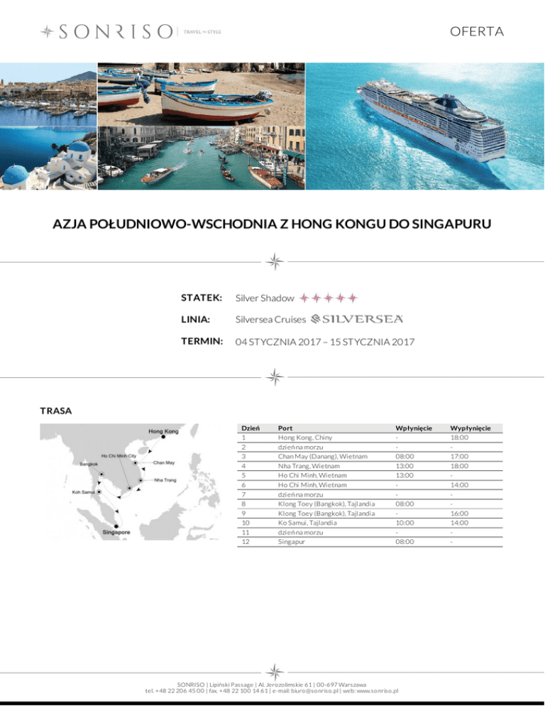 OFERTA AZJA POŁUDNIOWO-WSCHODNIA Z HONG KONGU DO SINGAPURU STATEK: Silver Shadow LINIA: Silversea Cruises TERMIN: 04 STYCZNIA 2017 – 15 STYCZNIA 2017 TRASA Dzień 1 2 3 4 5 6 7 8 9 10 11 12 Port Hong Kong, Chiny dzień na morzu Chan May (Danang), Wietnam Nha Trang, Wietnam Ho Chi Minh, Wietnam Ho Chi Minh, Wietnam dzień na morzu Klong Toey (Bangkok), Tajlandia Klong Toey (Bangkok), Tajlandia Ko Samui, Tajlandia dzień na morzu Singapur Wpłynięcie 08:00 13:00 13:00 08:00 10:00 08:00 SONRISO | Lipiński Passage | Al. Jero zo limskie 61 | 00-697 Warszawa tel. +48 22 206 45 00 | fax. +48 22 100 14 61 | e-mail: biuro @so nriso .pl | web: www.so nriso .pl Wypłynięcie 18:00 17:00 18:00 14:00 16:00 14:00 - OFERTA CENA Typ kabiny Cena z osobę Vista Suite od 4 095 EUR Terrace Suite od 4 365 EUR Veranda suite od 5 085 EUR CENA ZAWIERA DOTATKOWE OPŁATY zakwaterowanie w 2 - os apartamencie wybranej kategorii pełne wyżywienie: 3 posiłki, przekąski między posiłakmi, bufet o północy open bar: wybrane wina i szampany, alkohole premium, różnorodne kawy i herbaty, wodę mineralną butelkowaną, napoje bezalkoholowe oraz soki dostępne w barach i restauracjach korzystanie z mini baru w apartamencie serwis bagażowy podczas wejścia i zejścia ze statku obsługa kamerdynerska 24 godzinny serwis kabinowy korzystanie z urządzeń sportowo - rekreacyjnych dostępnych na pokładzie (baseny, jacuzzi, boiska sportowe, itp.) udział we wszystkich imprezach organizowanych na pokładzie (przedstawienia, pokazy, aukcje, animacje i inne) opłatę serwisową (napiwki) dla obsługi statku transfer pomiędzy portem a miastem (uzależniony od lokalnych przepisów) obowiązkowe opłaty portowe dojazd/przelot do portu rozpoczęcia i zakończenia rejsu transfery (lotnisko - port - lotnisko) ewentualne noclegi przed lub po rejsie wycieczki fakultatywne korzystanie z usług typu: SPA, salon piękności, pralnia itp. wydatki osobiste tj. zakupy w butikach, internet, kasyno itp. obowiązkowe ubezpieczenie turystyczne koszt wymaganych wiz ewentualna opłata paliwowa (linia w momencie wzrotu cen ropy zastrzega sobie prawo do dodania oplaty paliwowej do każdej rezerwacji) Na życzenie świadczymy dodatkowo usługi: rezerwacje hotelowe na całym świecie rezerwacje biletów lotniczych, trasferów oraz parkingu w porcie rezerwacje wycieczek fakultatywnych i innych atrakcji SONRISO | Lipiński Passage | Al. Jero zo limskie 61 | 00-697 Warszawa tel. +48 22 206 45 00 | fax. +48 22 100 14 61 | e-mail: biuro @so nriso .pl | web: www.so nriso .pl