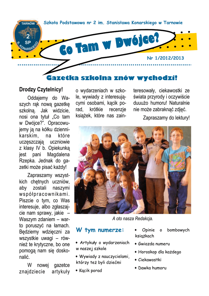 Szkoła Podstawowa nr 2 im. Stanisława Konarskiego w Tarnowie jce? ó w D w Co Tam Nr 1/2012/2013 Gazetka szkolna znów wychodzi! Drodzy Czytelnicy! Oddajemy do Waszych rąk nową gazetkę szkolną. Jak widzicie, nosi ona tytuł „Co tam w Dwójce?”. Opracowujemy ją na kółku dziennikarskim, na które uczęszczają uczniowie z klasy IV b. Opiekunką jest pani Magdalena Rzepka. Jednak do gazetki może pisać każdy! Zapraszamy wszystkich chętnych uczniów, aby zostali naszymi współpracownikami. Piszcie o tym, co Was interesuje, albo zgłaszajcie nam sprawy, jakie – Waszym zdaniem – warto poruszyć na łamach. Będziemy wdzięczni za wszystkie uwagi – również te krytyczne, bo one pomogą nam się doskonalić. W nowej gazetce znajdziecie artykuły o wydarzeniach w szkole, wywiady z interesującymi osobami, kącik porad, krótkie recenzje książek, które nas zain- teresowały, ciekawostki ze świata przyrody i oczywiście duuużo humoru! Naturalnie nie może zabraknąć zdjęć. Zapraszamy do lektury! A oto nasza Redakcja. W tym numerze: Opinie książkach o bombowych Artykuły o wydarzeniach w naszej szkole Gwiazda numeru Wywiady z nauczycielami, którzy też byli dziećmi Ciekawostki Kącik porad Horoskop dla każdego Dawka humoru Święto naszej szkoły 30 września przypada Święto Patrona Szkoły, czyli Stanisława Konarskiego. W tym roku obchodziliśmy je dwa dni wcześniej. Wzięli w nim udział wszyscy uczniowie, nauczyciele i rodzice pierwszoklasistów. Tego dnia najmłodsi koledzy i koleżanki zostali przyjęci do grona uczniów Dwójki. Pierwszaki z piórem Uroczystość zaczęła się od hymnu szkoły. Następnie ks. Stanisław Konarski (którego zagrał Filip Gacek z kl. VI a) zasiadł na krześle i sprawdził, czy pierwszaki mogą być pasowani na uczniów. Zadawał im wiele pytań, na które dobrze odpowiedzieli. Wreszcie uznał, że mogą zostać pasowani na uczniów. Wyglądało to tak, Uczniowie kl. I po raz pierwszy wystąpili przed całą szkołą. że pani wychowawczyni podchodziła do każdego ucznia...”. Potem pierw- piej wypełniać obowiązki. ucznia i dotykała jego raszoklasiści ślubowali, że Na koniec dzieci mienia zielonym piórem, będą się starali jak najle- z klasy IV b zaprezentomówiąc: „Pasuję cię na wały przedstawienie pt. „Czerwony Kapturek” w języku angielskim. Najważniejsze role zagrali: Czerwony Kapturek – Magdalena Grobecka, Wilk – Szymon Koral, Tato – Paweł Pawłowski, Babcia – Daria Kowal, Mama – Wiktoria Rakiej, narrator – Martyna Lisowska. Szymon Koral, Mikołaj Czernik, Kuba Olas 2 Święto naszej szkoły Drużyna z klasy VI a Konkurs o Patronie Po uroczystości ślubowania pierwszaków odbyła się część o Stanisławie Konarskim. Główną atrakcją był konkurs wiedzy o patronie naszej szkoły. Przedstawiciele klas IV, V i VI konkurowali ze sobą, kto więcej wie na jego temat. Najpierw drużyny dostały koperty z wyrażeniami, z których trzeba było ułożyć myśli Konarskiego. Następnie pani prowadząca konkurs zadawała przeróżne pytania. Stopień trudności był dostosowany do wieku. W następnym etapie uczniowie rozwiązywali krzyżówkę. Kiedy uzupeł- nili wszystkie wyrazy, dowiedzieliśmy się, że hasło to słowa „Sapere Auso”, to znaczy „temu, który odważył się być mądrym”. Warto wiedzieć, że taki napis znalazł się na medalu, jakim król Stanisław August Poniatowski uhonorował S. Konarskiego. Ślady Patrona w Dwójce Stanisław Konarski zostawił w naszej szkole swoje ślady. Ale nie myślcie, że są to odciski palców albo ślady stóp. Nie mógł ich tutaj zostawić, ponieważ szkołę wybudowano 132 lata po jego śmierci. Te ślady to: portret S. Konarskiego, jego złote myśli, medal Sapere Auso i oczywiście drzewo przed naszą szkołą. Portret Patrona jest dziełem Oli Stankiewicz, namalowała go w 2003 r. Wisi on na ścianie obok pokoju nauczycielskiego. Na starej szkole znajdują się także dwie drewniane tablice ze złotymi myślami Konarskiego oraz powiększona kopia medalu, jaki otrzymał on od króla Pol- Ci, którzy uczestniczyli w konkursie, byli zadowoleni, bo dużo się dowiedzieli o naszym patronie, a poza tym dobrze się bawili w czasie rywalizacji i w dodatku każdy otrzymał po 5 punktów. Patrycja Iwaniec, Daria Marut, ski za to, że „odważył się być mądrym”. Drzewo poświęcone Konarskiemu to dąb o imieniu Hieronim. Nosi taką nazwę, na pamiątkę imienia, jakie nasz patron otrzymał na chrzcie. Dąb został zasadzony z okazji 100-lecia naszej szkoły w Dniu Ziemi 2000 r. Może kiedyś odkryjemy jeszcze inne ślady Konarskiego... Redakcja 3 Gentleman Dwójki Kto jest gentelmanem naszej szkoły? Dowiedzieliśmy się tego podczas konkursu, który odbył się w dniu Święta Patrona Szkoły. Każda klasa wybrała wcześniej po dwóch kandydatów na gentlemana. Podczas spotkania na sali gimnastycznej wszyscy chłopcy dostali po kilka pytań, na które musieli odpowiedzieć – oczywiście jeśli umieli. Pytania dotyczyły kulturalnego zachowania w różnych sytuacjach. Kandydaci musieli też nakryć do stołu i złożyć życzenia nauczy- cielowi z okazji Dnia Na- naszej szkoły otrzymał uczyciela. Niestety, nie Przemek Kusyk z klasy wszystkim się to udało. 6a. Gratulujemy wygranej! Następnie komisja podliGabrysia Porosło, Ola czyła punkty i ogłosiła Panek, Magda Grobecka wyniki. Tytuł gentelmana Młodzi dżentelmeni. Mogliby tak wyglądać na co dzień... Co dżentelmen wiedzieć powinien? 1. Okazuję wszystkim życzliwość i szacunek. 2. Używam zwrotów grzecznościowych: dzień dobry, do widzenia, przepraszam, dziękuję itp. 3. Mówię językiem wolnym od wulgaryzmów. 4. Jestem prawdomówny, kłamstwo i tak obróci się przeciwko mnie. 5.Nie śmieję się z innych, pamiętam, że ja też mam trudne chwile. Daria Marut, Madzia Grobecka Nie tylko dla dżentelmenów Angielski wyraz „gentleman” przyjął si