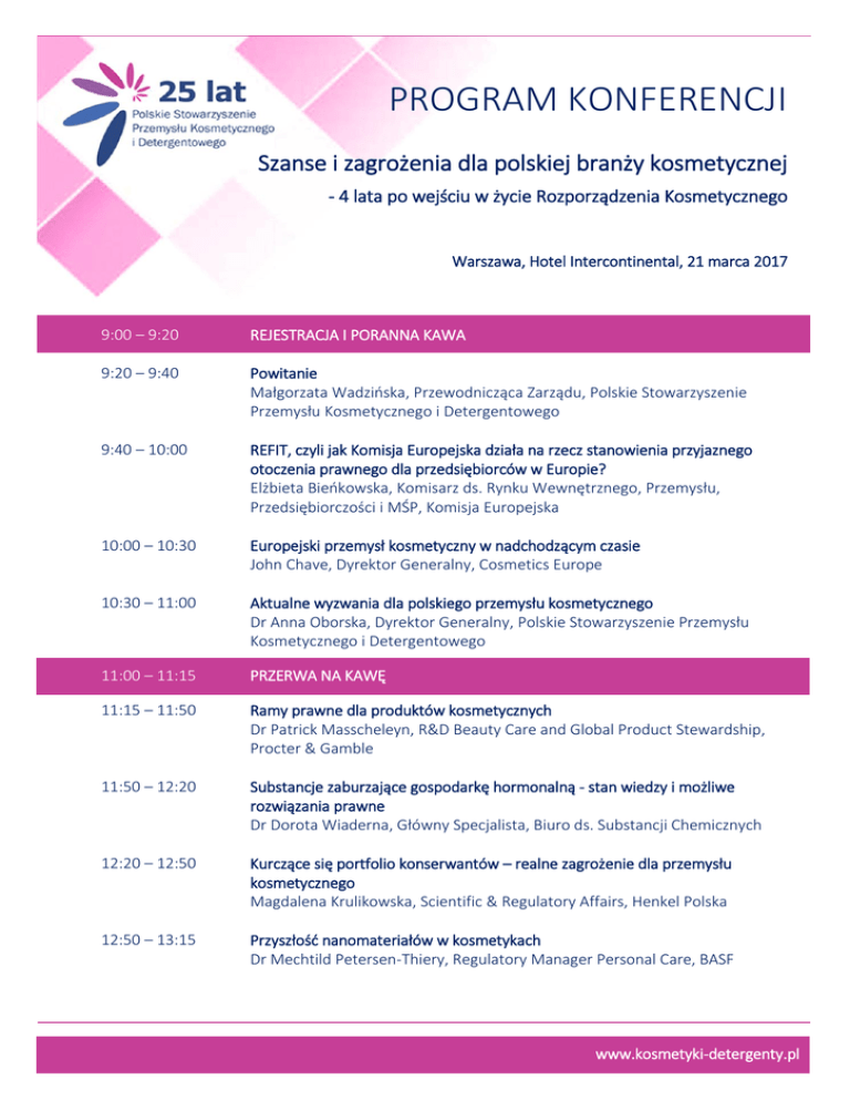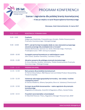 PROGRAM KONFERENCJI Szanse i zagrożenia dla polskiej branży kosmetycznej - 4 lata po wejściu w życie Rozporządzenia Kosmetycznego Warszawa, Hotel Intercontinental, 21 marca 2017 9:00 – 9:20 REJESTRACJA I PORANNA KAWA 9:20 – 9:40 Powitanie Małgorzata Wadzińska, Przewodnicząca Zarządu, Polskie Stowarzyszenie Przemysłu Kosmetycznego i Detergentowego 9:40 – 10:00 REFIT, czyli jak Komisja Europejska działa na rzecz stanowienia przyjaznego otoczenia prawnego dla przedsiębiorców w Europie? Elżbieta Bieńkowska, Komisarz ds. Rynku Wewnętrznego, Przemysłu, Przedsiębiorczości i MŚP, Komisja Europejska 10:00 – 10:30 Europejski przemysł kosmetyczny w nadchodzącym czasie John Chave, Dyrektor Generalny, Cosmetics Europe 10:30 – 11:00 Aktualne wyzwania dla polskiego przemysłu kosmetycznego Dr Anna Oborska, Dyrektor Generalny, Polskie Stowarzyszenie Przemysłu Kosmetycznego i Detergentowego 11:00 – 11:15 PRZERWA NA KAWĘ 11:15 – 11:50 Ramy prawne dla produktów kosmetycznych Dr Patrick Masscheleyn, R&D Beauty Care and Global Product Stewardship, Procter & Gamble 11:50 – 12:20 Substancje zaburzające gospodarkę hormonalną - stan wiedzy i możliwe rozwiązania prawne Dr Dorota Wiaderna, Główny Specjalista, Biuro ds. Substancji Chemicznych 12:20 – 12:50 Kurczące się portfolio konserwantów – realne zagrożenie dla przemysłu kosmetycznego Magdalena Krulikowska, Scientific & Regulatory Affairs, Henkel Polska 12:50 – 13:15 Przyszłość nanomateriałów w kosmetykach Dr Mechtild Petersen-Thiery, Regulatory Manager Personal Care, BASF www.kosmetyki-detergenty.pl 13:15 – 14:15 LUNCH 14:15 – 15:00 Ocena bezpieczeństwa produktów kosmetycznych Prof. Vera Rogiers, Cosmetics Europe Head of Department of Toxicology, Vrije Universiteit Brussel 15:00 – 15:30 Produkcja kosmetyków i GMP – sukcesy przemysłu i przyszłe wyzwania Irena Ozga, Cosmetosphera 15:30 – 15:45 PRZERWA NA KAWĘ 15:45 – 16:15 Eksport - Warunki wprowadzenia do obrotu na rynku chińskim John Chave, Dyrektor Generalny, Cosmetics Europe 16:15 – 16:40 Deklaracje marketingowe w świetle raportu Komisji Europejskiej 2016 Konrad Drozdowski, Dyrektor Generalny, Związek Stowarzyszeń Rada Reklamy 16:40 - 16:50 PODSUMOWANIE I ZAKOŃCZENIE 17:00 TOAST JUBILEUSZOWY Z OKAZJI 25-LECIA STOWARZYSZENIA www.kosmetyki-detergenty.pl