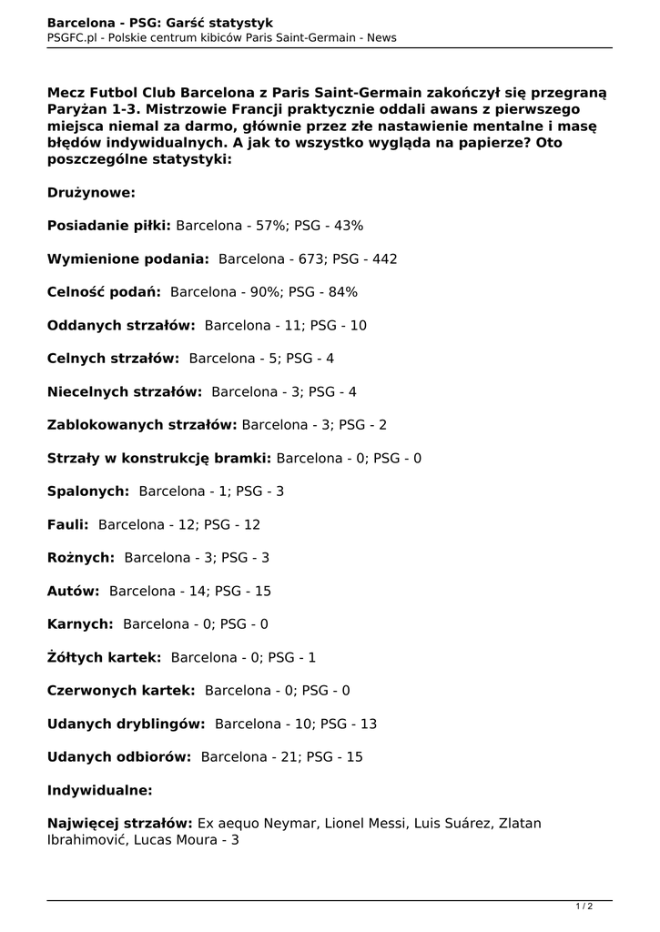 Barcelona - PSG: Garść statystyk PSGFC.pl - Polskie centrum kibiców Paris Saint-Germain - News Mecz Futbol Club Barcelona z Paris Saint-Germain zakończył się przegraną Paryżan 1-3. Mistrzowie Francji praktycznie oddali awans z pierwszego miejsca niemal za darmo, głównie przez złe nastawienie mentalne i masę błędów indywidualnych. A jak to wszystko wygląda na papierze? Oto poszczególne statystyki: Drużynowe: Posiadanie piłki: Barcelona - 57%; PSG - 43% Wymienione podania: Barcelona - 673; PSG - 442 Celność podań: Barcelona - 90%; PSG - 84% Oddanych strzałów: Barcelona - 11; PSG - 10 Celnych strzałów: Barcelona - 5; PSG - 4 Niecelnych strzałów: Barcelona - 3; PSG - 4 Zablokowanych strzałów: Barcelona - 3; PSG - 2 Strzały w konstrukcję bramki: Barcelona - 0; PSG - 0 Spalonych: Barcelona - 1; PSG - 3 Fauli: Barcelona - 12; PSG - 12 Rożnych: Barcelona - 3; PSG - 3 Autów: Barcelona - 14; PSG - 15 Karnych: Barcelona - 0; PSG - 0 Żółtych kartek: Barcelona - 0; PSG - 1 Czerwonych kartek: Barcelona - 0; PSG - 0 Udanych dryblingów: Barcelona - 10; PSG - 13 Udanych odbiorów: Barcelona - 21; PSG - 15 Indywidualne: Najwięcej strzałów: Ex aequo Neymar, Lionel Messi, Luis Suárez, Zlatan Ibrahimović, Lucas Moura - 3 1/2 Barcelona - PSG: Garść statystyk PSGFC.pl - Polskie centrum kibiców Paris Saint-Germain - News Najwięcej strzałów celnych: Ex aequo Neymar, Luis Suárez, Edinson Cavani - 2 Najwięcej podań: Gerard Piqué - 79 Najlepsza skuteczność podań: Gerard Piqué- 79 podań, 96% celność Najwięcej kontaktów z piłką: Gerard Piqué - 93 Najwięcej kluczowych podań: Ex aequo Andrés Iniesta, Blaise Matuidi - 2 Najwięcej udanych dryblingów: Ex aequo Lionel Messi, Lucas Moura - 6 Najwięcej dośrodkowań: Ex aequo Neymar, Gregory Van Der Wiel - 5 Najwięcej celnych dośrodkowań: Ex aequo Ezequiel Lavezzi, Lucas Moura - 2 Najwięcej długich piłek: Marc-André ter Stegen - 19 Najwięcej celnych długich podań: Javier Mascherano - 14 Najwięcej podań prostopadłych: Ex aequo Neymar, Maxwell - 1 Najwięcej celnych podań prostopadłych: Brak celnych podań prostopadłych w meczu Najwięcej odbiorów: Sergio Busquets - 6 Najwięcej przechwytów: Lucas Moura - 5 Najwięcej fauli: Ex aequo Javier Mascherano, Pedro, Luis Suárez, Lucas Moura - 3 Najbardziej faulowany: Neymar - 3 Najwięcej spalonych: Ex aequo Luis Suárez, Zlatan Ibrahimović, Blaise Matuidi, Lucas Moura - 1 Autor: Próżnia 2/2 Powered by TCPDF (www.tcpdf.org)