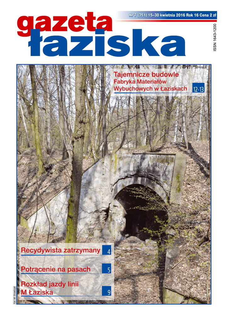 Nr 7 (351) 15–30 kwietnia 2016 Rok 16 Cena 2 zł Tajemnicze budowle Fot. M. Strzelczyk Fabryka Materiałów Wybuchowych w Łaziskach Recydywista zatrzymany 4 Potrącenie na pasach 5 Rozkład jazdy linii M Łaziska 9 12-13 informator gazeta łaziska NUMERY ALARMOWE Państwowa Straż Pożarna (998) 32 326 23 10 OSP Ł. Górne 32 224 21 20 OSP Ł. Średnie 32 224 21 22 OSP Ł. Dolne 32 224 21 21 Policja (997) 32 226 85 10 Straż Miejska (986) 32 224 44 71 POGOTOWIA Ratunkowe (999) 32 226 21 00 32 226 26 65 Centrum Medyczne 32 325 76 00 Gazowe (992) 32 227 31 24 Energetyczne (991) 32 303 21 55 Ciepłownicze 32 226 21 36 Wodno-kanalizacyjne 32 224 18 37 32 224 14 52 PGKiM 32 224 10 88, 32 224 15 50 Punkt konsultacyjny Gminnej Komisji Rozwiązywania Problemów Alkoholowych 32 224 23 90 PRZYCHODNIE Proelmed (ul. Wyzwolenia 30)32 324 31 23 Przychodnia (ul. Staszica 4a)32 737 02 30 Przychodnia (ul. Chopina 17)32 736 76 70 32 736 76 55 APTEKI „Arnika” (os. Centrum 7) 32 224 38 39 „Novum” (ul. Dworcowa 10) 32 224 10 18 „Moja Apteka” (ul. Staszica 2/2) 32 736 80 90 „Moja Apteka” (ul. Barlickiego 2) 32 738 90 90 „Dbam o Zdrowie” (ul. Wiejska 1) 32 322 70 95 „Dbam o Zdrowie” (ul. Chopina 17) 32 736 76 37 „Apteka św. Anny” (ul. Wyrska 12B) 32 216 11 14 INNE Urząd Miasta 32 324 80 00 Starostwo Powiatowe 32 324 81 00 MDK Ł. Górne 32 224 10 33 MDK Ł. Średnie 32 224 48 18 MDK Ł. Dolne 32 322 94 46 PiMBP (biblioteka) 32 224 14 12 Parafia Ł. Górne 32 224 10 13 Parafia Ł. Średnie 32 224 10 03 Parafia Ł. Dolne 32 224 18 42 MOSiR 32 221 11 38 ORS „Żabka” 32 322 93 82 Środowiskowy Dom 32 737 00 46 Samopomocy 698 639 036 OPS 32 326 23 40, 32 326 23 42 SZKOŁY Szkoła Podstawowa nr 1 32 224 10 44 Szkoła Podstawowa nr 5 32 224 12 07 Szkoła Podstawowa nr 6 32 224 32 46 Gimnazjum nr 1 32 224 10 66 Gimnazjum nr 3 32 737 01 17 Zespół Szkół im. Piastów Śląskich 32 224 10 12 Zespół Szkół Energetycznych i Usługowych 32 224 24 15 2 15 - 30 kwietnia 2016 MDK zaprasza... …22 kwietnia o godz. 18.00 na wernisaż wystawy „Wszystko z niczego” prac uczestników warsztatów plastycznych działających przy Miejskim Domu Kultury. …23 kwietnia o godz. 16.00 na koncert „Camerton i jego goście”. Poza grupą wokalną Camerton wystąpią również Capela Nicopolensis oraz chór dziecięcy Giocoso. Wstęp wolny! …25 kwietnia od godz. 10.00 na eliminacje rejonowe XXIII Regionalnego Przeglądu Pieśni „Śląskie Śpiewanie” im. Adolfa Dygacza. ...25 kwietnia o godz. 15.00 na kolejny Turniej Bowlingowy dla seniorów. Zapisy oraz wpłaty w wysokości 12 zł są przyjmowane w sekretariacie MDK do 22 kwietnia. …2 maja od godz. 11.00 na Święto Flagi organizowane przez łaziskich harcerzy na tarasie przed MDK. Szczegóły poniżej. Serdecznie zapraszamy! Zapraszamy na wyjazdy! Wszystkich członków Uniwersytetu Trzeciego Wieku, ale również innych chętnych, zapraszamy na kolejne wyjazdy organizowane przez Miejski Dom Kultury. 27 kwietnia (w środę) zapraszamy na zwiedzanie Browarów Książęcych w Tychach. Zwiedzanie będzie połączone z degustacją. Koszt wyjazdu dla członków UTW – 15 zł, pozostali – 20 zł. Wyjazd z Łazisk Górnych o godz. 16.15. Powrót w godzinach wieczornych. Zapisy i wpłaty są przyjmowane w sekretariacie MDK do wyczerpania miejsc. 23 maja (w poniedziałek) zapraszamy na biesiadę w Wiśle. W programie: czas wolny w Ustroniu, obiad oraz grillowanie przy muzyce w ośrodku „U Fojta”. Koszt wyjazdu dla członków UTW – 60 zł, pozostali – 80 zł. Cena obejmuje transport, obiad i grilla przy muzyce. Wyjazd z Łazisk Górnych o godz. 10.30. Zapisy oraz wpłaty – 30 zł przy zapisie przyjmowane są w sekretariacie MDK w Łaziskach Górnych, tel. 32 224 10 33. Pozostała kwota płatna do 15 maja. Święto Flagi 1 Szczep Drużyn Harcerskich i Zuchowych „ŁAZISKA” oraz Urząd Miejski zapraszają mieszkańców miasta 2 maja o godzinie 11.00 przed Miejski Dom Kultury na happening z okazji Święta Flagi. W programie: gry i zabawy dla najmłodszych, malowanie na twarzach barw narodowych, biało-czerwone stoisko plastyczne. Duże bańki mydlane. Duże memory – „Łaziska do pary.” Odpowiedź za flagę – w trakcie trwania festynu mieszkańcy będą mogli odebrać flagę udzieliwszy prawidłowej odpowiedzi na proste pytanie związane z historią Polski, flagą, godłem oraz hymnem. Rozstrzygnięcie konkursu biało-czerwona szkoła. Rozstrzygnięcie konkursu „Nuty i rytmy w odcieniach bieli i czerwieni”. Zapraszamy! Fot. z arch. J. Kudli INFORMATOR Od kilku lat harcerze organizują w Łaziskach Święto Flagi z życia miasta gazeta łaziska Rewitalizacja linii kolejowej Pociągiem do Tychów, Oświęcimia, a nawet Krakowa Podpisano porozumienie w sprawie rewitalizacji linii kolejowej łączącej m.in. Orzesze Jaśkowice, Tychy, Bieruń i Oświęcim. Dokumentacja przedprojektowa ma powstać do pierwszego kwartału 2018 roku, a sama inwestycja – warta 170 mln zł – ma być gotowa w roku 2020 500 plus 1 kwietnia ruszył rządowy program „Rodzina 500 plus”. W Łaziskach to zadanie realizuje Ośrodek Pomocy Społecznej. Przygotowaliśmy kilka stanowisk, gdzie można odbierać i składać wnioski. W pierwszych dniach zjawiło sie sporo osób, ale kolejki szybko udawało się rozładować. Do 11 kwietnia zostało złożonych 725 wnisoków, z czego 476 osobiście, natomiast 249 elektronicznie – informuje Joanna Młyńczak. Trwa weryfikacja wniosków. Zgodnie z ustawą ośrodek ma trzy miesiące na rozpoczęcie wypłacania świadczenia, ale jak nas zapewniono, pierwsze kwoty powinny trafić do odbiorów szybciej. mms Fot. M. Strzelczyk Czy chcemy do metropolii? Podpisano porozumienie w sprawie rewitalizacji linii kolejowej na trasie Orzesze – Oświęcim 5 kwietnia o godz. 11.00 w Urzędzie Miejskim w Bieruniu odbyło się spotkanie przedstawicieli władz Tychów, Orzesza, Łazisk Górnych, Wyr, Oświęcimia i Bier
