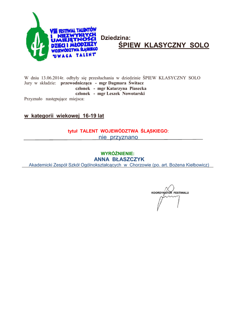 Dziedzina: ŚPIEW KLASYCZNY SOLO W dniu 13.06.2014r. odbyły się przesłuchania w dziedzinie ŚPIEW KLASYCZNY SOLO Jury w składzie: przewodnicząca - mgr Dagmara Świtacz członek - mgr Katarzyna Piasecka członek - mgr Leszek Nowotarski Przyznało następujące miejsca: w kategorii wiekowej 16-19 lat tytuł TALENT WOJEWÓDZTWA ŚLĄSKIEGO: nie przyznano WYRÓŻNIENIE: ANNA BŁASZCZYK Akademicki Zespół Szkół Ogólnokształcących w Chorzowie (po. art. Bożena Kiełbowicz)