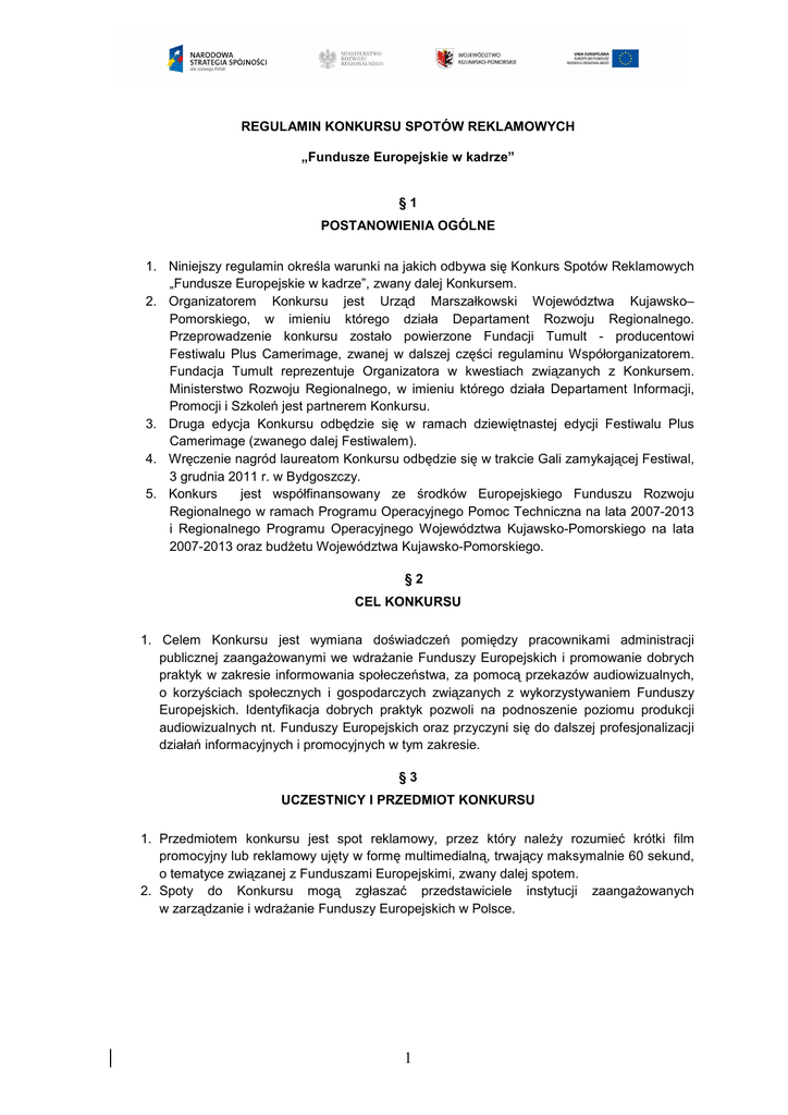 REGULAMIN KONKURSU SPOTÓW REKLAMOWYCH „Fundusze Europejskie w kadrze” §1 POSTANOWIENIA OGÓLNE 1. Niniejszy regulamin określa warunki na jakich odbywa się Konkurs Spotów Reklamowych „Fundusze Europejskie w kadrze”, zwany dalej Konkursem. 2. Organizatorem Konkursu jest Urząd Marszałkowski Województwa Kujawsko– Pomorskiego, w imieniu którego działa Departament Rozwoju Regionalnego. Przeprowadzenie konkursu zostało powierzone Fundacji Tumult - producentowi Festiwalu Plus Camerimage, zwanej w dalszej części regulaminu Współorganizatorem. Fundacja Tumult reprezentuje Organizatora w kwestiach związanych z Konkursem. Ministerstwo Rozwoju Regionalnego, w imieniu którego działa Departament Informacji, Promocji i Szkoleń jest partnerem Konkursu. 3. Druga edycja Konkursu odbędzie się w ramach dziewiętnastej edycji Festiwalu Plus Camerimage (zwanego dalej Festiwalem). 4. Wręczenie nagród laureatom Konkursu odbędzie się w trakcie Gali zamykającej Festiwal, 3 grudnia 2011 r. w Bydgoszczy. 5. Konkurs jest współfinansowany ze środków Europejskiego Funduszu Rozwoju Regionalnego w ramach Programu Operacyjnego Pomoc Techniczna na lata 2007-2013 i Regionalnego Programu Operacyjnego Województwa Kujawsko-Pomorskiego na lata 2007-2013 oraz budŜetu Województwa Kujawsko-Pomorskiego. §2 CEL KONKURSU 1. Celem Konkursu jest wymiana doświadczeń pomiędzy pracownikami administracji publicznej zaangaŜowanymi we wdraŜanie Funduszy Europejskich i promowanie dobrych praktyk w zakresie informowania społeczeństwa, za pomocą przekazów audiowizualnych, o korzyściach społecznych i gospodarczych związanych z wykorzystywaniem Funduszy Europejskich. Identyfikacja dobrych praktyk pozwoli na podnoszenie poziomu produkcji audiowizualnych nt. Funduszy Europejskich oraz przyczyni się do dalszej profesjonalizacji działań informacyjnych i promocyjnych w tym zakresie. §3 UCZESTNICY I PRZEDMIOT KONKURSU 1. Przedmiotem konkursu jest spot reklamowy, przez który naleŜy rozumieć krótki film promocyjny lub reklamowy ujęty w formę multimedialną, trwający maksymalnie 60 sekund, o tematyce związanej z Funduszami Europejskimi, zwany dalej spotem. 2. Spoty do Konkursu mogą zgłaszać przedstawiciele instytucji zaangaŜowanych w zarządzanie i wdraŜanie Funduszy Europejskich w Polsce. 1 3. Spoty zgłoszone do Konkursu muszą dotyczyć: Narodowej Strategii Spójności, wybranego programu/priorytetu/działania współfinansowanego z Funduszy Europejskich w ramach perspektywy finansowej 2007-2013. 4. Do drugiej edycji Konkursu mogą być zgłaszane spoty, które nie były prezentowane podczas pierwszej edycji Konkursu w 2010 roku. 5. W ramach Konkursu zaprezentowane mogą być zarówno spoty animowane, jak i filmy realizowane przy uŜyciu rozmaitych technik mieszanych. 6. Jedna Instytucja ma prawo do zgłoszenia po jednym spocie reklamowym dla kaŜdego z wdraŜanych przez siebie programów. 7. Warunkiem dopuszczenia spotu do Konkursu jest terminowe przesłanie kompletu wymaganych materiałów, wymienionych w § 4. 8. Ostateczny termin zgłaszania spotów do Konkursu oraz przesłania wszystkich wymaganych materiałów upływa 28 października 2011 r. Zgłoszenia dostarczone po terminie nie będą rozpatrywane. 9. Odpowiedzialność za tytuł prawny do moŜliwości zgłoszenia i prezentacji spotu na Festiwalu leŜy po stronie Zgłaszającego. Zgłaszający przyjmuje odpowiedzialność za naruszenie praw autorskich i pokrewnych, wynikających z bezprawnego zgłoszenia i pokazu spotu na Festiwalu. §4 WYMAGANIA TECHNICZNE 1. Zgłaszający przekaŜe Organizatorowi: a) dwie kopie spotu na płytach DVD w formacie QuickTime HD, QuickTime HDh.264, QuickTime SD h.264 lub QuickTime DV PAL, b) jedną kopię przeglądową w formacie DVD, c) informacje dotyczące podmiotu zgłaszającego oraz twórców (w wersji elektronicznej na załączonym do regulaminu formularzu) 2. Materiały nadesłane do Konkursu nie będą zwracane. 3. Płyty DVD naleŜy dostarczyć na adres: Fundacja Tumult Konkurs „Fundusze Europejskie w kadrze” Rynek Nowomiejski 28 87-100 Toruń, Polska a formularz zgłoszeniowy w formacie Word oraz PDF z podpisem i pieczęcią pocztą elektroniczną na adres email: [email protected] 4. Zgłaszający pokrywa koszt dostarczenia wszystkich materiałów. 5. Organizator ma prawo nie przyjąć do Konkursu prac niespełniających warunków wymienionych w § 3, a takŜe nie uwzględnić prac posiadających zły format i/lub wady, np. złą jakość lub uszkodzenia wynikające np. z nieodpowiedniego zabezpieczenia przesyłki. §5 JURY 1. Spoty zgłoszone na Konkurs zostaną poddane ocenie jury, które następnie wyłoni zwycięzcę oraz przyzna wyróŜnienia. 2. W skład jury Konkursu wchodzą przedstawiciele branŜy marketingu i reklamy oraz twórcy filmowi, zaproszeni przez organizatorów Festiwalu. 3. Wszystkie zgłoszone na Konkurs spoty będą oceniane w jednej kategorii. 4. Jury Konkursu oceni zaprezentowane prace i przyzna nagrodę główną oraz wyróŜnienie/a. 5. Jury ma prawo przyznać nie więcej niŜ 3 wyróŜnienia lub nie przyznać Ŝadnego. 2 6. Wyłaniając zwycięzcę Konkursu oraz przyznając wyróŜnienia, jury weźmie przede wszystkim pod uwagę oryginalne/nowatorskie/kreatywne podejście do promocji Funduszy Europejskich. Istotnym elementem, podczas oceny spotów, będzie zaprezentowany pomysł i idea. Technika wykonania czy budŜet przeznaczony na produkcję spotu nie będzie czynnikiem decydującym. 7. Jury obradować będzie 1 grudnia 2011 roku. Jury dokona wyboru laureatów i ogłosi wyniki podczas spotkania z uczestnikami Konkursu 2 grudnia 2011 r., a nagroda i wyróŜnienie/a zostaną wręczone laureatom podczas Gali zamykającej Festiwal, 3 grudnia 2011 r. w Bydgoszczy. 8. Werdykt jury jest ostateczny i nie przysługuje od niego odwołanie. §6 NAGRODY 1. Nagrodą dla zwycięzcy w Konkursie jest statuetka konkursowa oraz szkolenie dla grupy osób biorących u