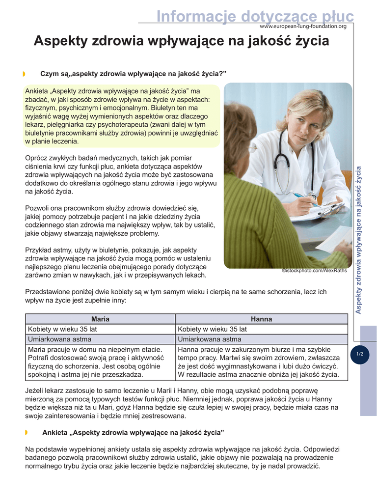 Informacje dotyczące płuc www.european-lung-foundation.org Aspekty zdrowia wpływające na jakość życia Czym są„aspekty zdrowia wpływające na jakość życia?” Oprócz zwykłych badań medycznych, takich jak pomiar ciśnienia krwi czy funkcji płuc, ankieta dotycząca aspektów zdrowia wpływających na jakość życia może być zastosowana dodatkowo do określania ogólnego stanu zdrowia i jego wpływu na jakość życia. Pozwoli ona pracownikom służby zdrowia dowiedzieć się, jakiej pomocy potrzebuje pacjent i na jakie dziedziny życia codziennego stan zdrowia ma największy wpływ, tak by ustalić, jakie objawy stwarzają największe problemy. Przykład astmy, użyty w biuletynie, pokazuje, jak aspekty zdrowia wpływające na jakość życia mogą pomóc w ustaleniu najlepszego planu leczenia obejmującego porady dotyczące zarówno zmian w nawykach, jak i w przepisywanych lekach. ©istockphoto.com/AlexRaths Przedstawione poniżej dwie kobiety są w tym samym wieku i cierpią na te same schorzenia, lecz ich wpływ na życie jest zupełnie inny: Maria Kobiety w wieku 35 lat Umiarkowana astma Maria pracuje w domu na niepełnym etacie. Potrafi dostosować swoją pracę i aktywność fizyczną do schorzenia. Jest osobą ogólnie spokojną i astma jej nie przeszkadza. Aspekty zdrowia wpływające na jakość życia Ankieta „Aspekty zdrowia wpływające na jakość życia” ma zbadać, w jaki sposób zdrowie wpływa na życie w aspektach: fizycznym, psychicznym i emocjonalnym. Biuletyn ten ma wyjaśnić wagę wyżej wymienionych aspektów oraz dlaczego lekarz, pielęgniarka czy psychoterapeuta (zwani dalej w tym biuletynie pracownikami służby zdrowia) powinni je uwzględniać w planie leczenia. Hanna Kobiety w wieku 35 lat Umiarkowana astma Hanna pracuje w zakurzonym biurze i ma szybkie tempo pracy. Martwi się swoim zdrowiem, zwłaszcza że jest dość wygimnastykowana i lubi dużo ćwiczyć. W rezultacie astma znacznie obniża jej jakość życia. Jeżeli lekarz zastosuje to samo leczenie u Marii i Hanny, obie mogą uzyskać podobną poprawę mierzoną za pomocą typowych testów funkcji płuc. Niemniej jednak, poprawa jakości życia u Hanny będzie większa niż ta u Mari, gdyż Hanna będzie się czuła lepiej w swojej pracy, będzie miała czas na swoje zainteresowania i będzie mniej zestresowana. Ankieta „Aspekty zdrowia wpływające na jakość życia” Na podstawie wypełnionej ankiety ustala się aspekty zdrowia wpływające na jakość życia. Odpowiedzi badanego pozwolą pracownikowi służby zdrowia ustalić, jakie objawy nie pozwalają na prowadzenie normalnego trybu życia oraz jakie leczenie będzie najbardziej skuteczne, by je nadal prowadzić. 1/2 Informacje dotyczące płuc www.european-lung-foundation.org Ankiety zawierają szereg pytań, w tym: 1. Jak oceniasz swój obecny stan zdrowia? 2. Czy problemy w obrębie klatki piersiowej wpływają na wykonywaną pracę? 3. Jaki rodzaj aktywności fizycznej powoduje u Ciebie zadyszkę? ©istockphoto.com/Mableen Zastanówmy się, w jaki sposób mogłyby na to odpowiedzieć Hanna i Maria? W jaki sposób mogłyby się różnić ich odpowiedzi? Aspekty zdrowia wpływające na jakość życia Dlaczego aspekty zdrowia wpływające na jakość życia są tak istotne? Zastosowanie wyników ankiety aspektów zdrowia wpływających na jakość życia ułatwia również podejmowanie wspólnych decyzji. Możliwość współdecydowania, jakie leczenie byłoby najbardziej skuteczne zwiększa zaangażowanie w zmianę stanu zdrowia. Poprawia to również samopoczucie poprzez możliwość kontrolowania postępów prowadzonego leczenia. „Zastosowanie aspektów zdrowia wpływających na jakość życia sprawia, że dotychczasowy zwykły proces leczenia prowadzony przez lekarza przeradza się w udaną współpracę. Takie podejście zasadniczo zmienia sposób konsultacji i pozwala pacjentowi przekazać, co według niego mogłoby najlepiej sprawdzić się w danej sytuacji.” Są to słowa profesora Davida Price’a, pulmonologa stosującego metodę badania aspektów zdrowia wpływających na jakość życia w diagnostyce i praktyce klinicznej. W jaki sposób wyniki ankiet mają zastosowanie w badaniach? Stają się one szczególnie przydatne przy sprawdzaniu nowych metod leczenia, gdy chodzi o poprawę jakości życia pacjentów. Ta forma badań znana jest również jako ankiety PRO (patient-reported outcome). Dla przeprowadzających badania istotne jest ustalenie, w jaki sposób nowe leczenie wpływa na pacjenta. Wyniki ankiet często znajdują zastosowanie w badaniach naukowych i pozwalają dowiedzieć się, czy opracowywane nowe leczenie będzie korzystne dla osób z określonymi schorzeniami. Niektóre metody leczenia mogą nie łagodzić niektórych objawów, ale znacznie poprawiają jakość życia - lub na odwrót. Zastosowanie ankiet PRO w badaniach nad przewlekłą obturacyjną chorobą płuc (POChP). Powstały przy wsparciu Unii Europejskiej projekt PROactive jest dobrym przykładem rozwoju zastosowania ankiet PRO w lecznictwie. Zespół projektowy pracuje obecnie nad utworzeniem zestawu ankiet PRO, jako narzędzia rejestrującego, w jaki sposób leczenie wpływa na aktywność fizyczną osób z POChP. By udoskonalić to narzędzie, zespół współpracuje bezpośrednio z pacjentami z POChP, by poznać wpływ choroby na aktywność fizyczną. 2/2 Po zakończeniu projektu, powstanie nowe narzędzie, podobnie jak to było w ankiecie dotyczącej astmy, do badania wpływu choroby na sposób życia pacjenta. Ankietę będzie można wypełniać przy pomocy elektronicznego urządzenia podobnego do telefonu komórkowego. Pacjent będzie mógł codziennie wpisywać swoją aktywność fizyczną („Co robię?“), objawy („Jak duże odczuwam duszności czy zmęczenie?“) oraz w jaki sposób musi zareagować („Czy muszę zwolnić lub zrobić sobie przerwę?“). Dla pacjenta będzie również dostępny monitor aktyw