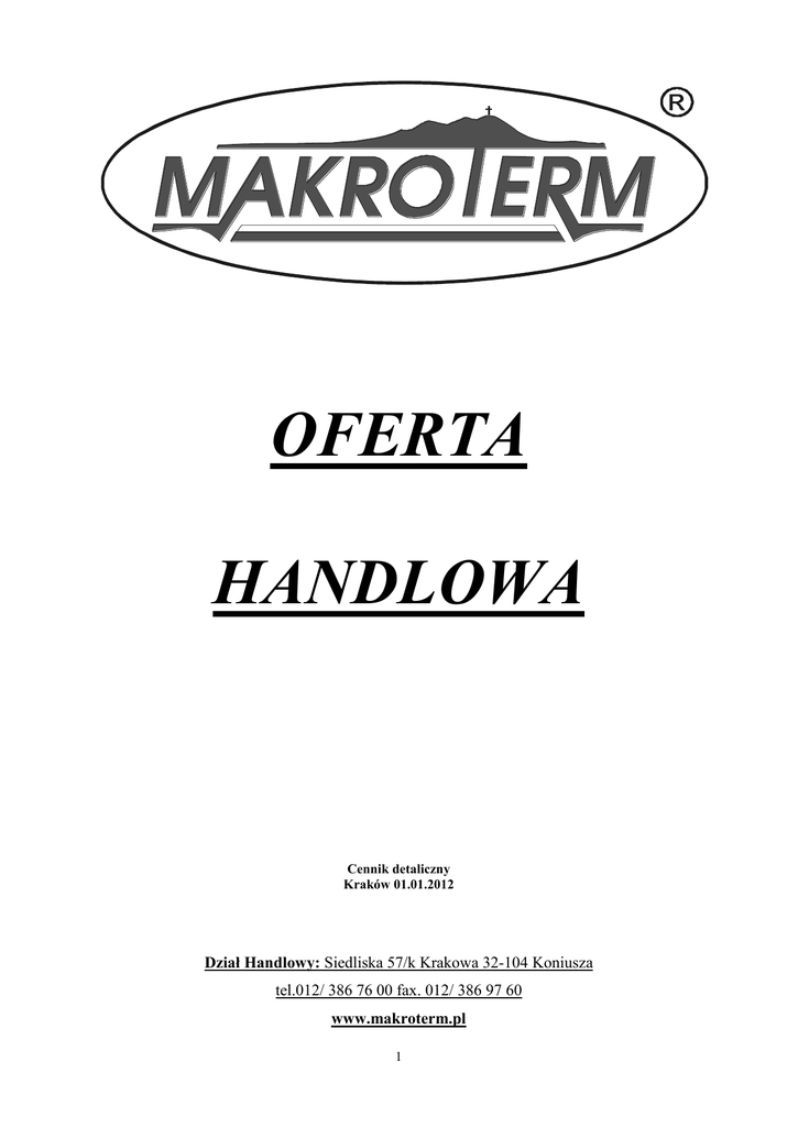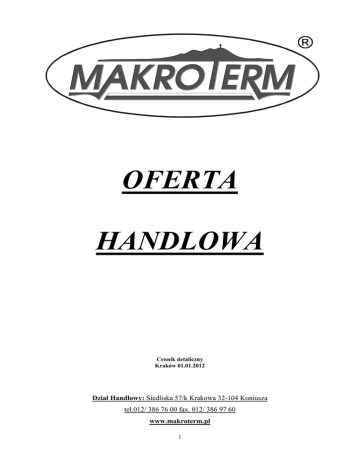 OFERTA HANDLOWA Cennik detaliczny Kraków 01.01.2012 Dział Handlowy: Siedliska 57/k Krakowa 32-104 Koniusza tel.012/ 386 76 00 fax. 012/ 386 97 60 www.makroterm.pl 1 TURBOKOMINEK® I do układów zamkniętych ................................ 3 Wkładki wermikulitowe do TKI …………………………………………………………………………………. 3 TURBOKOMINEK® II do układów zamkniętych .............................. 4 TURBOKOMINEK® III do układów zamkniętych ............................. 5 TURBOKOMINEK® dwustronny “DUO” do układów zamkniętych . 6 TURBOKOMINEK® narożny do układów zamkniętych eLka ........... 7 TURBOKOMINEK®do układów zamkniętych wersja GLASS……....8 Gotowe obudowy GLASS SYSTEM ………………………………...9 TURBOKOMINEK® do układów otwartych ..................................... 10 WYPOSAŻENIE DODATKOWE do Turbokominków® .................. 11 TURBOSOLAR - pakiety ................................................................... 12 LINIA I IZOLACJA SOLARNA ........................................................ 14 INTEGRATORY ................................................................................. 15 MODUŁY ROZDZIELACZY KOTŁOWYCH ................................. 16 NACZYNIE WYRÓWNAWCZE....................................................... 16 ZINTEGROWANE OGRZEWANIE z Integratorem ......................... 17 ZINTEGROWANE OGRZEWANIE z buforem ................................ 24 ZINTEGROWANE OGRZEWANIE Pakiety Mieszane .................... 27 PODGRZEWACZE CWU .................................................................. 33 ZESTAWY POMPOWE ..................................................................... 34 2 TURBOKOMINEK® „I” kontrolowany proces spalania wbudowany wymiennik do pracy w układzie zamkniętym Wyposażenie TURBOKOMINKA® „I” : Wbudowany wymiennik ze stali nierdzewnej do pracy w układzie zamkniętym. T - com - sterownik cyfrowy zarządzający procesem spalania, pompami, programowalne progi wyłączania innych urządzeń. Turbina powietrza z wbudowanym zaworem stopowym. Czopuch odprowadzający spaliny wykonany ze stali nierdzewnej żaroodpornej. Kolano z wyczystką (kąt 45º) wykonane ze stali nierdzewnej żaroodpornej. Naczynie wzbiorcze wykonane ze stali nierdzewnej z automatycznym uzupełnianiem wody w płaszczu. Zestaw pompowy (pompa Willo NXL 53-25P, zawór zwrotny, 2 × zawór odcinający, filtr, 2 × śrubunki). Ręczna regulacja przepływu spalin. Szyba R, szuflada do popielnika, płotek, ruszt, regulowana wysokość nóg kominka. AKANT moc/rama CARO NEO MIGO PANORAMIX* rama formowana rama formowana rama formowana maszynowo maszynowo ręcznie rama formowana rama formowana maszynowo maszynowo Promocyjne ceny - moc Netto 6 200 zł Netto 5 800 zł Netto 6 400 zł Netto 6 600 zł Netto 7 100 zł 14 kW Brutto 7 626 zł Brutto 7 134 zł Brutto 7 872 zł Brutto 8 118 zł Brutto 8 733 zł Netto 7 450 zł Netto 7 047 zł Netto 7 870 zł Netto 7 950 zł Netto 9 030 zł 18 kW Brutto 9 164 zł Brutto 8 668 zł Brutto 9 680 zł Brutto 9 778 zł Brutto 11 107 zł - moc Netto 8 080 zł Netto 7 627 zł Netto 8 500 zł Netto 8 580 zł Netto 9 970 zł 24 kW Brutto 9 938 zł Brutto 9 381 zł Brutto 10 455 zł Brutto 10 553 zł Brutto 12 263 zł - moc Netto 9 130 zł Netto 8 593 zł Netto 9 550 zł Netto 9 630 zł Netto 10 810 zł 32 kW Brutto 11 230 zł Brutto 10 596 zł Brutto 11 746 zł Brutto 11 845 zł Brutto 13 296 zł - moc * w odlewach formowanych ręcznie mogą wystąpić drobne odchylenia w kształcie frontu żeliwnego, szyba z efektem pyrolizy do Turbokominka® I - 300 zł netto dopłaty do ceny zestawu, szyba z efektem pyrolizy nie występuje jako szyba Panoramix Wkładki wermikulitowe do Turbokominków® I Płyty wermikulitowe zmniejszają wytrącanie się substancji smolistych w komorze spalania. Zastosowanie tych płyt wpływa korzystnie na wypalanie się gazów oraz ogranicza osadzanie się substancji na szybie, ułatwiając utrzymanie jej w czystości. Moc Turbokominka® 18 kW 24 kW 32 kW Wielkość wkładki 1,00 m2 1,25 m2 1,50 m2 500 zł/615 zł 550 zł/676 zł 600 zł/738 zł Cena wkładki netto/brutto 3 TURBOKOMINEK® „I” - szklane ramy - moc - moc - moc - moc 14 kW 18 kW 24 kW 32 kW Netto 6 900 zł Netto 8 500 zł Netto 9 130 zł Netto 10 180 zł rama szklana Brutto 8 487 zł Brutto 10 455 zł Brutto 11 230 zł Brutto 12 521 zł VETRO Netto 7 000 zł Netto 8 700 zł Netto 9 300 zł Netto 10 300 zł rama szklana Brutto 8 610 zł Brutto 10 701 zł Brutto 11 439 zł Brutto 12 669 zł PLAZMO Netto 7 200 zł - - - rama szklana Brutto 8 856 zł - - - rama/moc MIGO GLASS TURBOKOMINEK® „II” kontrolowany proces spalania gładka rama panoramicza wbudowany wymiennik do pracy w układzie zamkniętym Kompletne wyposażenie TURBOKOMINKA® „II” daje gwarancję jakości wykorzystanych materiałów, jak również eliminuje problemy nieodpowiedniego doboru komponentów do montażu, ponieważ są one dobierane przez producenta. Wbudowany wymiennik ze stali nierdzewnej do pracy w układzie zamkniętym. T - com - sterownik cyfrowy zarządzający procesem spalania, pompami, programowalne progi wyłączania innych urządzeń. Turbina powietrza z wbudowanym zaworem stopowym. Kolano czarne, nastawne z wyczystką (kąt 45º). Naczynie wzbiorcze wykonane ze stali nierdzewnej z automatycznym uzupełnianiem wody w płaszczu kominka. Zestaw pompowy (pompa grupy Willo NXL 53-25P, zawór zwrotny, 2 × zawór odcinający, filtr, 2 × śrubunki). Ręczna regulacja przepływu spalin. Szyba R, szuflada do popielnika, płotek, ruszt. Regulowana wysokość nóg kominka. moc- moc- NOWA CENA Netto 7 100 zł 6 299 zł 14 kW Brutto 8 733 zł 7 748 zł Netto 7 700 zł 6 824 zł 16 kW Brutto 9 471 zł 4 8 394 zł TURBOKOMINEK® „III” kontrolowany proces spalania wbudowany wymiennik do pracy w układzie zamkniętym Kompletne wyposażenie TURBOKOMINKA® „III” daje gwarancję j