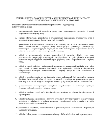 ZAKRES OBOWIĄZKÓW INSPEKTORA BEZPIECZEŃSTWA I HIGIENY PRACY SĄDU REJONOWEGO GDAŃSK-PÓŁNOC W GDAŃSKU Do zakresu obowiązków inspektora słuŜby bezpieczeństwa i higieny pracy naleŜy w szczególności: 1. przeprowadzanie kontroli warunków pracy oraz przestrzegania przepisów i zasad bezpieczeństwa i higieny pracy, 2. bieŜące informowanie pracodawcy o stwierdzonych zagroŜeniach zawodowych, wraz z wnioskami zmierzającymi do usuwania tych zagroŜeń, 3. sporządzanie i przedstawianie pracodawcy, co najmniej raz w roku, okresowych analiz stanu bezpieczeństwa i higieny pracy zawierających propozycje przedsięwzięć technicznych i organizacyjnych mających na celu zapobieganie zagroŜeniom Ŝycia i zdrowia pracowników oraz poprawę warunków pracy, 4. udział w opracowywaniu planów modernizacji i rozwoju zakładu pracy oraz przedstawianie propozycji dotyczących uwzględnienia w tych planach rozwiązań techniczno-organizacyjnych zapewniających poprawę stanu bezpieczeństwa i higieny pracy, 5. udział w ocenie załoŜeń i dokumentacji dotyczących modernizacji zakładu pracy albo jego części, a takŜe nowych inwestycji, oraz zgłaszanie wniosków dotyczących uwzględnienia wymagań bezpieczeństwa i higieny pracy w tych załoŜeniach i dokumentacji, 6. udział w przekazywaniu do uŜytkowania nowo budowanych lub przebudowywanych obiektów budowlanych albo ich części, w których przewiduje się pomieszczenia pracy oraz innych urządzeń mających wpływ na warunki pracy i bezpieczeństwo pracowników, 7. opracowywanie wewnętrznych zarządzeń, dotyczących bezpieczeństwa i higieny pracy, regulaminów i instrukcji ogólnych 8. udział w ustalaniu zadań osób kierujących pracownikami w zakresie bezpieczeństwa i higieny pracy, 9. udział w ustalaniu okoliczności i przyczyn wypadków przy pracy oraz w opracowywaniu wniosków wynikających z badania przyczyn i okoliczności tych wypadków, a takŜe kontrola realizacji tych wniosków, 10. prowadzenie rejestrów, kompletowanie i przechowywanie dokumentów dotyczących wypadków przy pracy, 11. udział w dokonywaniu oceny ryzyka zawodowego, które wiąŜe się z wykonywaną pracą, 12. współpraca z właściwymi komórkami organizacyjnymi lub osobami, w szczególności w zakresie organizowania i zapewnienia odpowiedniego poziomu szkoleń w dziedzinie bezpieczeństwa i higieny pracy oraz zapewnienia właściwej adaptacji zawodowej nowo zatrudnionych pracowników, 13. współdziałanie z lekarzem sprawującym profilaktyczną opiekę zdrowotną, nad pracownikami, a w szczególności przy organizowaniu okresowych badań lekarskich pracowników, 14. uczestniczenie w pracach komisji bezpieczeństwa i higieny pracy, 15. Inspektor BHP podlega bezpośrednio Kierownikowi Finansowemu.