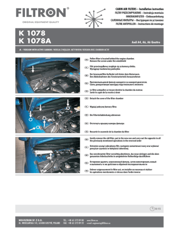 CABIN AIR FILTERS – Installation instruction FILTRY PRZECIWPYŁKOWE – Instrukcja montażu INNERAUMFILTER – Einbauanleitung САЛОННЫЕ ФИЛЬТРЫ – Инструкция по установке FILTRE ANTIPOLLEN – Instructions de montage K 1078 K 1078A Audi A4, A6, A6 Quattro A – VERSION WITH ACTIVE CARBON / WERSJA Z WĘGLEM AKTYWNYM/ VERSION AVEC CHARBON ACTIF Pollen filter is located behind the engine chamber. Remove the screen under the windshield Filtr przeciwpyłkowy znajduje się za komorą silnika. Wyciągnąć maskownicę podszybia Der Inneraumfilter befindet sich hinter dem Motorraum. Den Abdeckrahmen des Fensterunterteils herausnehmen Противопыльцевой фильтр находится за камерой двигателя. Снять декоративную накладку подстекольного элемента Le filtre antipollen se trouve derrière la chambre du moteur. Sortir le capot de la recette à tiroir Detach the cover of the filter chamber Wypiąć pokrywę komory filtra Die Filterteilabdeckung abtrennen Отстегнуть крышку камеры фильтра Ressortir le couvercle de la chambre du filtre Gently remove the old filter, put in the new one and carry out the opposite to all the previously mentioned operations in the reversed order Ostrożnie usunąć zabrudzony filtr, następnie zamontować nowy oraz wykonać powyższe czynności w kolejności odwrotnej Das verschmutzte Filter vorsichtig abnehmen, das neue einlegen und die oben genannten Arbeitsschritte in umgekehrter Reihenfolge durchführen Осторожно удалить загрязненный фильтр, затем вмонтировать новый и выполнить те же действия в обратной последовательности Enlever soigneusement le filtre usé, en installer un nouveau et réaliser les opérations mentionnées ci-dessus dans l’ordre inverse 0:15 WIX-FILTRON SP. Z O.O. TEL.:+48 65 572 89 00 www.filtron.eu UL. WROCŁAWSKA 145, 63-800 GOSTYŃ, POLAND FAX: +48 65 572 89 22 e-mail: [email protected]
