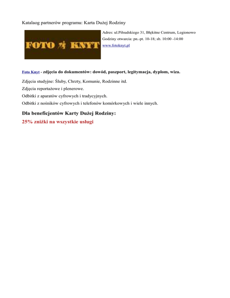 Katalaog partnerów programu: Karta Dużej Rodziny Adres: ul.Piłsudskiego 31, Błękitne Centrum, Legionowo Godziny otwarcia: pn.-pt. 10-18; sb. 10:00 -14:00 www.fotoknyt.pl Foto Knyt - zdjęcia do dokumentów: dowód, paszport, legitymacja, dyplom, wiza. Zdjęcia studyjne: Śluby, Chrzty, Komunie, Rodzinne itd. Zdjęcia reportażowe i plenerowe. Odbitki z aparatów cyfrowych i tradycyjnych. Odbitki z nośników cyfrowych i telefonów komórkowych i wiele innych. Dla beneficjentów Karty Dużej Rodziny: 25% zniżki na wszystkie usługi