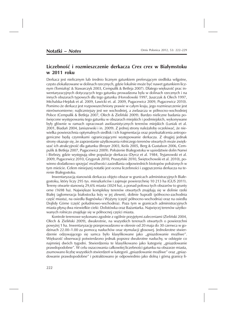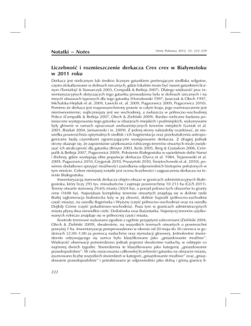 Notatki – Notes Ornis Polonica 2012, 53: 222–229 Liczebność i rozmieszczenie derkacza Crex crex w Białymstoku w 2011 roku Derkacz jest nielicznym lub średnio licznym gatunkiem preferującym siedliska wilgotne, często zlokalizowane w dolinach rzecznych, gdzie lokalnie może być nawet gatunkiem licznym (Tomiałojć & Stawarczyk 2003, Cempulik & Betleja 2007). Dlatego większość prac inwentaryzacyjnych dotyczących tego gatunku prowadzona była w dolinach rzecznych i na innych obszarach typowych dla tego gatunku (Horodowski 1997, Juszczak & Olech 1997, Michalska-Hejduk et al. 2009, Ławicki et. al. 2009, Pugacewicz 2009, Pugacewicz 2010). Pomimo że derkacz jest rozpowszechniony prawie w całym kraju, jego rozmieszczenie jest nierównomierne; najliczniejszy jest we wschodniej, a zwłaszcza w północno-wschodniej Polsce (Cempulik & Betleja 2007, Olech & Zieliński 2009). Bardzo nieliczne badania poświęcone występowaniu tego gatunku w obszarach miejskich i podmiejskich, wykonywane były głównie w ramach opracowań awifaunistycznych terenów miejskich (Luniak et al. 2001, Biaduń 2004, Janiszewski i in. 2009). Z jednej strony należałoby oczekiwać, że niewielka powierzchnia optymalnych siedlisk i ich fragmentacja oraz przekształcenia antropogeniczne będą czynnikami ograniczającymi występowanie derkacza. Z drugiej jednak strony okazuje się, że zaprzestanie użytkowania rolniczego terenów otwartych może zwiększać ich atrakcyjność dla gatunku (Broyer 2003, Keišs 2005, Berg & Gustafson 2006, Cempulik & Betleja 2007, Pugacewicz 2009). Położenie Białegostoku w sąsiedztwie dolin Narwi i Biebrzy, gdzie występują silne populacje derkacza (Dyrcz et al. 1984, Tryjanowski et al. 2009, Pugacewicz 2010, Grygoruk 2010, Pruszyński 2010, Świętochowski et al. 2010), powinno dodatkowo sprzyjać możliwości zasiedlania odpowiednich biotopów położonych w tym mieście. Celem niniejszej notatki jest ocena liczebności i zagęszczenia derkacza na terenie Białegostoku. Inwentaryzacją stanowisk derkacza objęto obszar w granicach administracyjnych Białegostoku, który liczy 295 tys. mieszkańców i zajmuje powierzchnię 10 213 ha (GUS 2011). Tereny otwarte stanowią 29,6% miasta (3024 ha), a ponad połowa tych obszarów to grunty orne (1698 ha). Największe kompleksy terenów otwartych znajdują się w dolinie rzeki Białej (aglomeracja białostocka leży w jej zlewni), dolinie Supraśli (północno-zachodnia część miasta), na osiedlu Bagnówka i Wyżyny (część północno-wschodnia) oraz na osiedlu Dojlidy Górne (część południowo-wschodnia). Poza tym w granicach administracyjnych miasta płyną dwa niewielkie cieki: Dolistówka oraz Bażantarka. Najwięcej terenów użytkowanych rolniczo znajduje się w północnej części miasta. Kontrole terenowe wykonano zgodnie z ogólnie przyjętymi zaleceniami (Zieliński 2004, Olech & Zieliński 2009), dwukrotnie, na wszystkich terenach otwartych o powierzchni powyżej 1 ha. Inwentaryzację przeprowadzono w okresie od 20 maja do 30 czerwca w godzinach 22.00–1.00 za pomocą nasłuchów oraz stymulacji głosowej. Jednokrotne stwierdzenie odzywającego się samca było klasyfikowane jako „gniazdowanie możliwe”. Większość obserwacji potwierdzono jednak poprzez dwukrotne nasłuchy, w odstępie co najmniej dwóch tygodni. Stwierdzenia te klasyfikowano jako kategorię „gniazdowanie prawdopodobne”. W celu oszacowania całkowitej liczebności gatunku na obszarze miasta, zsumowano liczbę wszystkich stwierdzeń w kategorii „gniazdowanie możliwe” oraz „gniazdowanie prawdopodobne” i potraktowano je odpowiednio jako dolną i górną granicę li222 czebności. Otrzymane wyniki uzupełniono o stwierdzenia innych obserwatorów z bieżącego i poprzedniego sezonu – w sumie 5 stanowisk. Zagęszczenia obliczono na podstawie dolnej i górnej liczebności samców. Frekwencję występowania derkacza na obszarze miasta obliczono dzieląc ten obszar na kwadraty o wielkości 1×1 km. Obecność derkacza w granicach kwadratów rejestrowano w dwóch kategoriach: „występuje”, gdy w danych kwadratach stwierdzono odzywającego się samca oraz „w zasięgu terytorium”, gdy w odległości mniejszej niż 100 metrów od granic kwadratu stwierdzono odzywającego się samca, a jednocześnie w danym kwadracie siedlisk z sąsiadującego zajętego kwadratu. Dolny zakres frekwencji obliczono na podstawie udziału kwadratów sklasyfikowanych wyłącznie w pierwszej z tych kategorii, a górny zakres obliczono na podstawie udziału kwadratów obydwu kategorii. Łącznie w granicach administracyjnych Białegostoku odnotowano 38–43 stanowisk der2 kacza. Zagęszczenie wynosiło 0,37–0,42 samca/km powierzchni całkowitej miasta oraz 2 1,25–1,42 samca/km powierzchni otwartej. Frekwencja występowania derkacza w kwadratach 1×1 km wynosiła 23–30% (rys. 1). Większość stanowisk odnotowano w zachodniej części miasta w dolinie rzeki Białej, a także w północno-wschodniej części w dolinie rzeki Dolistówki oraz na osiedlu Dojlidy Górne. Najmniejszy zajęty przez derkacza fragment otwartego terenu o roślinności półnaturalnej, ograniczonego zabudową, miał powierzchnię około 3 ha. Najmniejsza odległość pomiędzy jednocześnie odzywającymi się samcami wynosiła około 200 m, a największa odległość do najbliższego sąsiada wynosiła 2250 m. Aż 31 stanowisk znajdowało się w dolinach rzecznych, w pobliżu cieków. Pozostałych 12 było zlokalizowanych na wilgotnych łąkach, polach uprawnych i nieużytkach. Prawie wszystkie stanowiska derkacza znajdowały się na terenach nieużytkowanych rolniczo – porzuconych łąkach, pastwiskach, gruntach ornych. W trakcie sezonu lęgowego roślinność na tych obszarach nie zmieniała się. Jedynie w dłuższym okresie tego typu siedliska mogą ulegać sukcesji roślinności wysokiej. Na obszarach regularnie koszonych łąk w dolinie Supraśli, w granicach miasta,