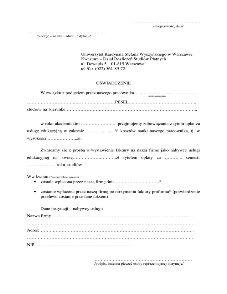 …………………………………………. /miejscowość, data/ …..……………………………………………. /pieczęć – nazwa i adres instytucji/ Uniwersytet Kardynała Stefana Wyszyńskiego w Warszawie Kwestura – Dział Rozliczeń Studiów Płatnych ul. Dewajtis 5 01-815 Warszawa tel./fax (022) 561-89-72 OŚWIADCZENIE W związku z podjęciem przez naszego pracownika …..……………………………… /imię, nazwisko/ ………………………….………………………PESEL….………………………………….. studiów na kierunku …………………………………………………………………………., w roku akademickim ……………….….. przejmujemy zobowiązania z tytułu opłat za usługę edukacyjną w zakresie ……….............% kosztów nauki naszego pracownika, tj. w wysokości ………………..zł. Zwracamy się z prośbą o wystawienie faktury na naszą firmę jako nabywcę usługi edukacyjnej na kwotę……………….……….zł tytułem opłaty za ………... semestr …………….… roku studiów. Ww kwota: (*niepotrzebne skreślić). • została wpłacona przez naszą firmę dnia ……………….……….*, • zostanie wpłacona przez naszą firmę po otrzymaniu faktury proforma* (potwierdzenie przelewu zostanie przesłane faksem) Dane instytucji – nabywcy usługi: Nazwa firmy …………………………………………………………………………….….. ………………………………………………………………………………………………. Adres:……….……………………………………………………………………………….. ………………………………………………………………………………………………. NIP ……………………………………………………… ………………………………………………………. /podpis, imienna pieczęć osoby reprezentującej instytucję/