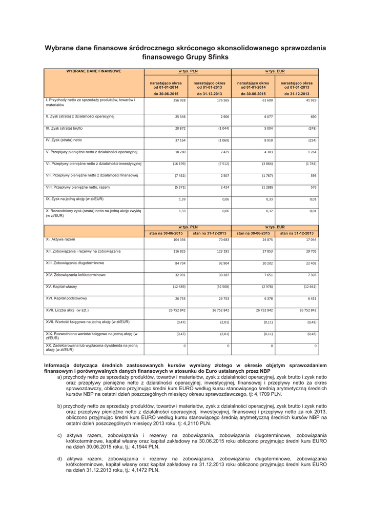 Wybrane dane finansowe Ğródrocznego skróconego skonsolidowanego sprawozdania finansowego Grupy Sfinks WYBRANE DANE FINANSOWE I. Przychody netto ze sprzedaĪy produktów, towarów i materiałów w tys. PLN w tys. EUR narastająco okres od 01-01-2014 narastająco okres od 01-01-2013 narastająco okres od 01-01-2014 narastająco okres od 01-01-2013 do 30-06-2015 do 31-12-2013 do 30-06-2015 do 31-12-2013 ϮϱϲϵϮϴ ϭϳϲϱϲϱ ϲϭϲϬϬ ϰϭϵϮϵ II. Zysk (strata) z działalnoĞci operacyjnej Ϯϱϯϰϲ ϮϵϬϲ ϲϬϳϳ ϲϵϬ III. Zysk (strata) brutto ϮϬϴϳϮ ;ϭϬϰϰͿ ϱϬϬϰ ;ϮϰϴͿ IV. Zysk (strata) netto ϯϳϭϲϰ ;ϭϬϲϵͿ ϴϵϭϬ ;ϮϱϰͿ V. Przepływy pieniĊĪne netto z działalnoĞci operacyjnej ϭϴϮϴϬ ϳϰϮϵ ϰϯϴϯ ϭϳϲϰ ;ϭϲϭϵϵͿ ;ϳϱϭϮͿ ;ϯϴϴϰͿ ;ϭϳϴϰͿ VII. Przepływy pieniĊĪne netto z działalnoĞci finansowej ;ϳϰϱϮͿ ϮϱϬϳ ;ϭϳϴϳͿ ϱϵϱ VIII. Przepływy pieniĊĪne netto, razem ;ϱϯϳϭͿ ϮϰϮϰ ;ϭϮϴϴͿ ϱϳϲ IX. Zysk na jedną akcjĊ (w zł/EUR) ϭ͕ϯϵ Ϭ͕Ϭϲ Ϭ͕ϯϯ Ϭ͕Ϭϭ X. Rozwodniony zysk (strata) netto na jedną akcjĊ zwykłą (w zł/EUR) ϭ͕ϯϯ Ϭ͕Ϭϲ Ϭ͕ϯϮ Ϭ͕Ϭϭ VI. Przepływy pieniĊĪne netto z działalnoĞci inwestycyjnej w tys. PLN stan na 30-06-2015 w tys. EUR stan na 31-12-2013 stan na 30-06-2015 stan na 31-12-2013 XI. Aktywa razem ϭϬϰϯϯϲ ϳϬϲϴϯ Ϯϰϴϳϱ ϭϳϬϰϰ XII. Zobowiązania i rezerwy na zobowiązania ϭϭϲϴϮϱ ϭϮϯϭϵϭ Ϯϳϴϱϯ ϮϵϳϬϱ XIII. Zobowiązania długoterminowe ϴϰϳϯϰ ϵϮϵϬϰ ϮϬϮϬϮ ϮϮϰϬϮ XIV. Zobowiązania krótkoterminowe ϯϮϬϵϭ ϯϬϮϴϳ ϳϲϱϭ ϳϯϬϯ ;ϭϮϰϴϵͿ ;ϱϮϱϬϴͿ ;ϮϵϳϴͿ ;ϭϮϲϲϭͿ Ϯϲϳϱϯ Ϯϲϳϱϯ ϲϯϳϴ ϲϰϱϭ ϮϲϳϱϮϴϰϮ ϮϲϳϱϮϴϰϮ ϮϲϳϱϮϴϰϮ ϮϲϳϱϮϴϰϮ XVII. WartoĞü ksiĊgowa na jedną akcjĊ (w zł/EUR) ;Ϭ͕ϰϳͿ ;Ϯ͕ϬϭͿ ;Ϭ͕ϭϭͿ ;Ϭ͕ϰϴͿ XIX. Rozwodniona wartoĞü ksiĊgowa na jedną akcjĊ (w zł/EUR) ;Ϭ͕ϰϳͿ ;Ϯ͕ϬϭͿ ;Ϭ͕ϭϭͿ ;Ϭ͕ϰϴͿ XX. Zadeklarowana lub wypłacona dywidenda na jedną akcjĊ (w zł/EUR) Ϭ Ϭ Ϭ Ϭ XV. Kapitał własny XVI. Kapitał podstawowy XVII. Liczba akcji (w szt.) Informacja dotycząca Ğrednich zastosowanych kursów wymiany złotego w okresie objĊtym sprawozdaniem finansowym i porównywalnych danych finansowych w stosunku do Euro ustalanych przez NBP a) przychody netto ze sprzedaĪy produktów, towarów i materiałów, zysk z działalnoĞci operacyjnej, zysk brutto i zysk netto oraz przepływy pieniĊĪne netto z działalnoĞci operacyjnej, inwestycyjnej, finansowej i przepływy netto za okres sprawozdawczy, obliczono przyjmując Ğredni kurs EURO według kursu stanowiącego Ğrednią arytmetyczną Ğrednich kursów NBP na ostatni dzieĔ poszczególnych miesiĊcy okresu sprawozdawczego, tj: 4,1709 PLN. b) przychody netto ze sprzedaĪy produktów, towarów i materiałów, zysk z działalnoĞci operacyjnej, zysk brutto i zysk netto oraz przepływy pieniĊĪne netto z działalnoĞci operacyjnej, inwestycyjnej, finansowej i przepływy netto za rok 2013, obliczono przyjmując Ğredni kurs EURO według kursu stanowiącego Ğrednią arytmetyczną Ğrednich kursów NBP na ostatni dzieĔ poszczególnych miesiĊcy 2013 roku, tj: 4,2110 PLN. c) aktywa razem, zobowiązania i rezerwy na zobowiązania, zobowiązania długoterminowe, zobowiązania krótkoterminowe, kapitał własny oraz kapitał zakładowy na 30.06.2015 roku obliczono przyjmując Ğredni kurs EURO na dzieĔ 30.06.2015 roku, tj.: 4,1944 PLN. d) aktywa razem, zobowiązania i rezerwy na zobowiązania, zobowiązania długoterminowe, zobowiązania krótkoterminowe, kapitał własny oraz kapitał zakładowy na 31.12.2013 roku obliczono przyjmując Ğredni kurs EURO na dzieĔ 31.12.2013 roku, tj.: 4,1472 PLN. GRUPA KAPITAŁOWA SFINKS POLSKA S.A. Skonsolidowane skrócone Ğródroczne sprawozdanie finansowe za okres od 1 stycznia 2014r. do 30 czerwca 2015r. roku obrotowego trwającego od 1 stycznia 2014r. do 30 listopada 2015r. SFINKS POLSKA S.A. Skonsolidowane skrócone Ğródroczne sprawozdanie finansowe za okres sprawozdawczy zakoĔczony 30 czerwca 2015r. Dla akcjonariuszy Sfinks Polska S.A. Zgodnie z przepisami Rozporządzenia Ministra Finansów z dnia 19.02.2009 r. Zarząd jest zobowiązany zapewniü sporządzenie Ğródrocznego skonsolidowanego sprawozdania finansowego dającego prawidłowy i rzetelny obraz sytuacji majątkowej i finansowej Grupy Kapitałowej na koniec czerwca 2015 roku oraz wyniku finansowego za ten okres. Elementy skonsolidowanego skróconego kwartalnego sprawozdania przedstawione w niniejszym dokumencie w nastĊpującej kolejnoĞci: finansowego zostały Strona ĝródroczne skonsolidowane zestawienie całkowitych dochodów za okres od 1 stycznia 2014r. do 30 czerwca 2015r. wykazujące zysk netto w kwocie 37.164 tys. zł oraz całkowity dochód ogółem w kwocie 37.174 tys. zł 3 Skonsolidowany bilans na dzieĔ 30 czerwca 2015r. wykazujący po stronie aktywów i pasywów kwotĊ 104.336 tys.zł 5 Zestawienie zmian w skonsolidowanym kapitale własnym za okres sprawozdawczy od 1 stycznia 2014r. do 30 czerwca 2015r., wykazujący wzrost kapitałów własnych o kwotĊ 40.019 tys. zł 7 Skonsolidowany rachunek przepływów pieniĊĪnych za okres sprawozdawczy od 1 stycznia 2014r. do 30 czerwca 2015r. wykazujący spadek stanu Ğrodków pieniĊĪnych o kwotĊ 5.371 tys. zł Noty do skonsolidowanego Ğródrocznego skróconego sprawozdania finansowego 9 Sprawozdanie Zarządu z działalnoĞci stanowi załącznik sprawozdania finansowego. 10 do niniejszego skonsolidowanego Skonsolidowane sprawozdanie finansowe zostało zatwierdzone do publikacji przez Zarząd Spółki dominującej dnia 14 sierpnia 2015 r. oraz podpisane w imieniu Zarządu przez: Prezes Zarządu Sylwester Cacek Wiceprezes Zarządu Dorota Cacek Wiceprezes Zarządu Tomasz Gryn Wiceprezes Zarządu Jacek KuĞ Wiceprezes Zarządu Sławomir Pawłowski Osoba, której powierzo