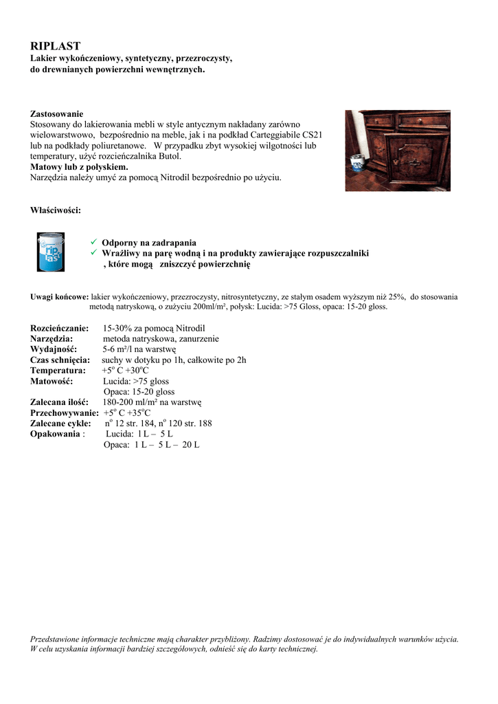 RIPLAST Lakier wykończeniowy, syntetyczny, przezroczysty, do drewnianych powierzchni wewnętrznych. Zastosowanie Stosowany do lakierowania mebli w style antycznym nakładany zarówno wielowarstwowo, bezpośrednio na meble, jak i na podkład Carteggiabile CS21 lub na podkłady poliuretanowe. W przypadku zbyt wysokiej wilgotności lub temperatury, użyć rozcieńczalnika Butol. Matowy lub z połyskiem. Narzędzia należy umyć za pomocą Nitrodil bezpośrednio po użyciu. Właściwości: Odporny na zadrapania Wrażliwy na parę wodną i na produkty zawierające rozpuszczalniki , które mogą zniszczyć powierzchnię Uwagi końcowe: lakier wykończeniowy, przezroczysty, nitrosyntetyczny, ze stałym osadem wyższym niż 25%, do stosowania metodą natryskową, o zużyciu 200ml/m², połysk: Lucida: >75 Gloss, opaca: 15-20 gloss. Rozcieńczanie: Narzędzia: Wydajność: Czas schnięcia: Temperatura: Matowość: 15-30% za pomocą Nitrodil metoda natryskowa, zanurzenie 5-6 m²/l na warstwę suchy w dotyku po 1h, całkowite po 2h +5o C +30oC Lucida: >75 gloss Opaca: 15-20 gloss Zalecana ilość: 180-200 ml/m² na warstwę Przechowywanie: +5o C +35oC Zalecane cykle: no 12 str. 184, no 120 str. 188 Opakowania : Lucida: l L – 5 L Opaca: 1 L – 5 L – 20 L Przedstawione informacje techniczne mają charakter przybliżony. Radzimy dostosować je do indywidualnych warunków użycia. W celu uzyskania informacji bardziej szczegółowych, odnieść się do karty technicznej.