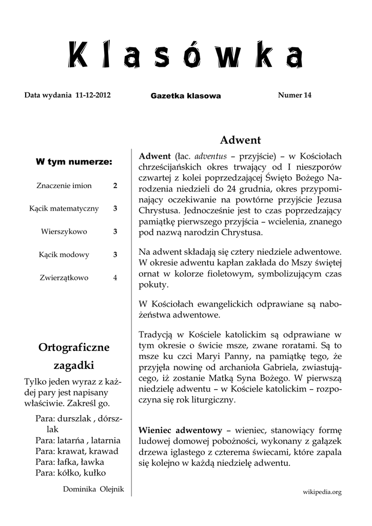 Klasówka Gazetka klasowa Data wydania 11-12-2012 Numer 14 Adwent W tym numerze: Znaczenie imion 2 Kącik matematyczny 3 Wierszykowo 3 Kącik modowy 3 Zwierzątkowo 4 Adwent (łac. adventus – przyjście) – w Kościołach chrześcijańskich okres trwający od I nieszporów czwartej z kolei poprzedzającej Święto Bożego Narodzenia niedzieli do 24 grudnia, okres przypominający oczekiwanie na powtórne przyjście Jezusa Chrystusa. Jednocześnie jest to czas poprzedzający pamiątkę pierwszego przyjścia – wcielenia, znanego pod nazwą narodzin Chrystusa. Na adwent składają się cztery niedziele adwentowe. W okresie adwentu kapłan zakłada do Mszy świętej ornat w kolorze fioletowym, symbolizującym czas pokuty. W Kościołach ewangelickich odprawiane są nabożeństwa adwentowe. Ortograficzne zagadki Tylko jeden wyraz z każdej pary jest napisany właściwie. Zakreśl go. Tradycją w Kościele katolickim są odprawiane w tym okresie o świcie msze, zwane roratami. Są to msze ku czci Maryi Panny, na pamiątkę tego, że przyjęła nowinę od archanioła Gabriela, zwiastującego, iż zostanie Matką Syna Bożego. W pierwszą niedzielę adwentu – w Kościele katolickim – rozpoczyna się rok liturgiczny. Para: durszlak , dórszlak Para: latarńa , latarnia Para: krawat, krawad Para: łafka, ławka Para: kółko, kułko Wieniec adwentowy – wieniec, stanowiący formę ludowej domowej pobożności, wykonany z gałązek drzewa iglastego z czterema świecami, które zapala się kolejno w każdą niedzielę adwentu. Dominika Olejnik wikipedia.org Str. 2 Klasówka Znaczenie imion Już dziś poznaj znaczenie imienia swojego lub swojej koleżanki/kolegi. Zobacz, czy opis do niej/niego pasuje. Pamiętajcie, by traktować to, co przeczytacie z przymrużeniem oka ;-) Znaczenie imion będziemy drukować cyklicznie tak, by imię każdego ucznia z naszej klasy znalazło się w tej rubryce. Dziś podajemy znaczenie imion: Adam - imię pochodzi z wielu źródeł: z języka hebrajskiego adam (ludzie) lub adhamah (ziemia), sumeryjskiego ada-mu (mój ojciec), akadyjskiego ad-mu (stworzony, zrodzony, dziecko) lub arabskiego adama (łączyć się). Najczęściej przyjęte jest znaczenie biblijne: pierwszy człowiek stworzony przez Boga. Adam bardzo ceni sobie przyjaźń, uważnie dobiera przyjaciół i jest im bardzo oddany. Adam jest jednak zaborczy. Patrzy na świat bardzo realistycznie, ceni jednak uczucia. Szczęśliwy kolor - czerwony, liczba: 1. Maciej - imię pochodzenia hebrajskiego, od słowa Mattijjah (dar Jahwe). Oznacza: ten, który jest darem Boga. Maciej jest osobą nerwową, pobudliwą i bardzo szybko reagującą. Charakteryzuje się bogatym i uporządkowanym życiem wewnętrznym, ale jest również otwarty na świat. Jest wrażliwy, zawsze stanie po stronie niesłusznie atakowanych. Szczęśliwy kolor: ceglasty, liczba: 5. Mariusz - imię pochodzenia łacińskiego, wywodzi się od imienia boga wojny Marsa lub nazwy rzymskiego rodu Mariaszów. Mariusz jest to osoba na ogół aktywna i ruchliwa. Do dobrego samopoczucia potrzebuje uczestnictwa w życiu świata, musi się do wszystkiego mieszać, doradzać. Mariusz jest również pracowity, zaradny i lubi spokój. Szczęśliwy kolor: czerwony, liczba: 8. Mikołaj - imię pochodzące od greckiego słowa Nikolaos "zwycięstwo" i "lud". Mikołaj bardzo troszczy się o sprawy finansowe i doskonale wie, jak o nie zadbać. Zazwyczaj bierze aktywny udział w życiu społecznym. Priorytetem jest dla niego rodzina, do której jest mocno przywiązany i za którą czuje się odpowiedzialny. Chętnie pomaga innym, udziela wsparcia każdemu, kto tego potrzebuje. Odważny, nie boi się ryzyka, ani ciężkiej pracy. Szczęśliwy kolor: purpurowy, liczba: 8. Opracowała: Julka Michlińska na podstawie http://www.ksiegaimion.com oraz www.imiona.org (10.12.2012)29 Str. 3 Numer 14 Kącik matematyczny Wierszykowo "Cuda i dziwy" Oblicz: 100x100= 200x300= 800x1= 100x1+800= 100:2= 80+80+100= 2+1000= 80x2= 1+1+80+40+0= 0+0+0+0+0= 100x0= 1000x0= 2+2+0+0+0= 800+800= Małpa siedzi w Internecie I tak sobie bzdury plecie. Że kura znosi złote jaja, Że wiewiórki grają w cymbergaja, Że krowa muczy w lesie, Że krasnoludek echo niesie. Że mysz w odzie pływa, Że jezioro do morza wpływa, Że na niebie są czerwone chmury, A wszystko to bzdury, bzdury. Sebastian Smaruj Autor wiersza: Julia Michlińska Kącik modowy Rada 1: ubieraj się stosownie do pogody. Gdy na dworze jest mróz, noś czapkę, szalik i rękawiczki. Teraz noszenie stylowych czapek i rękawiczek, w najróżniejszych kolorach i fasonach, jest bardzo trendy. Rada 2: noś ciepłą kurtkę. Teraz w temacie kurtek jest pełna dowolność. Możesz nosić kożuszki, kurtki puchowe, płaszcze, kurtki jednokolorowe, a nawet w kratkę - wszystko jest modne. A im rzadsze, tym jesteś oryginalniejsza/-y. Teraz więc nawet kurtka po starszej siostrze czy bracie, to już nie jest obciach. Rada 3: modne są teraz ciepłe getry i legginsy oraz grube rajstopy. Najfajniejsze są te we wzorki: cętki, paski, ale również kwiatki, esy-floresy. Ważne, by nam było ciepło w chłodne dni, gdy na dworze mróz i śnieg. Julka Michlińska Zwierzątkowo Gazetka klasowa Klasówka Marcin Pastuszak Piotr Pastuszak [email protected] [email protected] Pogoda według zwierząt Zwierzęta mają tzw. zmysł barometryczny, chociaż dokładnie nie wiadomo, które organy za to odpowiadają. Potrafią one jednak przewidzieć pogodę o wiele dokładniej niż przyrządy meteorologiczne skonstruowane przez ludzi. Morsy – dokładne wskazania temperatur Jeden z urzędów morskich na dalekim wschodzie był w bardzo trudnej sytuacji. Zbliżał się czerwiec, a jedna z tras żeglugowych była jeszcze zablokowana przez grube warstwy lodu, których nie był wstanie przebić nawet lodołamacz o napędzie jądrowym. Poza tym meteorolodzy byli zgodni co do tego, że w najbliższym czasie nie ma widoków na uruchomienie komunikacji morskie