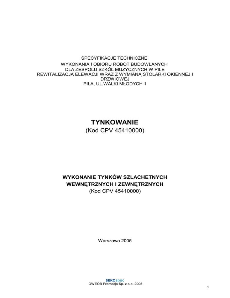 SPECYFIKACJE TECHNICZNE WYKONANIA I OBIORU ROBÓT BUDOWLANYCH DLA ZESPOŁU SZKÓŁ MUZYCZNYCH W PILE REWITALIZACJA ELEWACJI WRAZ Z WYMIANĄ STOLARKI OKIENNEJ I DRZWIOWEJ PIŁA, UL.WALKI MŁODYCH 1 TYNKOWANIE (Kod CPV 45410000) WYKONANIE TYNKÓW SZLACHETNYCH WEWNĘTRZNYCH I ZEWNĘTRZNYCH (Kod CPV 45410000) Warszawa 2005 SEKOspec OWEOB Promocja Sp. z o.o. 2005 1 SPIS TREŚCI 1. CZĘŚĆ OGÓLNA ...................................................... 3 1.1. Nazwa nadana zamówieniu przez zamawiającego 3 1.2. Przedmiot ST ...................................................... 3 1.3. Zakres stosowania ST ......................................... 3 1.4. Przedmiot i zakres robót objętych ST ................. 3 1.5. Określenia podstawowe, definicje ....................... 3 1.6. Ogólne wymagania dotyczące robót ................... 4 1.7. Dokumentacja robót malarskich ........................... 4 1.8. Nazwy i kody ........................................................ 5 2. WYMAGANIA DOTYCZĄCE WŁAŚCIWOŚCI MATERIAŁÓW 3. WYMAGANIA DOTYCZĄCE SPRZĘTU, MASZYN I NARZĘDZI 4. WYMAGANIA DOTYCZĄCE TRANSPORTU ........... 9 5. WYMAGANIA DOTYCZĄCE WYKONANIA ROBÓT 9 6. KONTROLA JAKOŚCI ROBÓT ............................... 13 7. WYMAGANIA DOTYCZĄCE PRZEDMIARU I OBMIARU ROBÓT 8. SPOSÓB ODBIORU ROBÓT .................................. 16 9. PODSTAWA ROZLICZENIA ROBÓT ..................... 18 10. DOKUMENTY ODNIESIENIA ............................... 19 5 8 15 Najważniejsze oznaczenia i skróty: ST – Specyfikacja Techniczna SST – Szczegółowa Specyfikacja Techniczna ITB – Instytut Techniki Budowlanej PZJ – Program Zabezpieczenia Jakości Jednostka autorska, opracowanie edytorskie i rozpowszechnianie: Ośrodek Wdrożeń Ekonomiczno-Organizacyjnych Budownictwa „Promocja” Sp. z o.o. 02-548 Warszawa, ul. Grażyny 15, tel. (22) 440-84-00, fax (22) 440-84-01 www.sekocenbud.pl e-mail: [email protected] ISBN 83-89756-42-0 Copyright by OWEOB PROMOCJA Sp. z o.o. Wydanie 1, Warszawa 2005 Wszelkie prawa zastrzeżone! Wykorzystanie treści niniejszej specyfikacji technicznej dozwolone jest wyłącznie do przygotowania dokumentacji budowlanej. Kopiowanie, przedrukowywanie i rozpowszechnianie całości lub fragmentów niniejszej publikacji w celach komercyjnych bez pisemnej zgody wydawcy zabronione. SEKOspec OWEOB Promocja Sp. z o.o. 2005 2 CZĘŚĆ OGÓLNA 1.1. Nazwa nadana zamówieniu przez zamawiającego ..................................................................................... 1. 1.2. Przedmiot ST Przedmiotem niniejszej standardowej specyfikacji technicznej (ST) są wymagania dotyczące wykonania i odbioru tynków szlachetnych wewnętrznych i zewnętrznych. 1.3. Zakres stosowania ST Standardowa specyfikacja techniczna (ST) stanowi podstawę opracowania szczegółowej specyfikacji technicznej (SST) stosowanej jako dokument przetargowy i kontraktowy przy zlecaniu i realizacji robót wymienionych w pkt. 1.2. Projektant sporządzający dokumentację projektową i odpowiednie szczegółowe specyfikacje techniczne wykonania i odbioru robót budowlanych może wprowadzać do niniejszej standardowej specyfikacji zmiany, uzupełnienia lub uściślenia, odpowiednie dla przewidzianych projektem robót, uwzględniające wymagania Zamawiającego oraz konkretne warunki realizacji robót, niezbędne do uzyskania wymaganego standardu i jakości tych robót. Odstępstwa od wymagań podanych w niniejszej specyfikacji mogą mieć miejsce tylko w przypadkach prostych robót o niewielkim znaczeniu, dla których istnieje pewność, że podstawowe wymagania będą spełnione przy zastosowaniu metod wykonania wynikających z doświadczenia oraz uznanych reguł i zasad sztuki budowlanej. 1.4. Przedmiot i zakres robót objętych ST Specyfikacja dotyczy wszystkich czynności mających na celu wykonanie wewnętrznych i zewnętrznych tynków szlachetnych na podkładach z tynków zwykłych. Przedmiotem opracowania jest określenie wymagań odnośnie właściwości materiałów, wymagań w zakresie sposobów oceny podkładów, wymagań dotyczących wykonania tynków szlachetnych oraz ich odbiorów. Specyfikacja nie obejmuje wymagań dotyczących wykonania podkładów z tynków zwykłych, tynków zwykłych, pocienionych z fabrycznie przygotowanych mieszanek tynkarskich, specjalnych (np. akustycznych, przeciwpożarowych), renowacyjnych, stiuków, sgrafitto i suchych tynków. Wymagania dla podkładów z tynków zwykłych określono w specyfikacji technicznej Tynkowanie. Kod CPV 45410000. Wykonanie tynków zwykłych wewnętrznych i zewnętrznych. Kod CPV 45411000. 1.5. Określenia podstawowe, definicje Określenia podane w niniejszej Specyfikacji są zgodne z odpowiednimi normami oraz określeniami podanymi w ST „Wymagania ogólne” Kod CPV 45000000-7, pkt 1.4. Podłoże – powierzchnia elementu konstrukcyjnego lub podkład, na który nakłada się wyprawę. Podkład – warstwa ochronna lub wyrównująca nałożona na powierzchnię elementu budowlanego. Masa tynkarska – masa otrzymywana przez zarobienie wodą lub specjalną substancją suchej mieszanki tynkarskiej. Sucha mieszanka tynkarska – mieszanka spoiw mineralnych, wypełniaczy, domieszek SEKOspec OWEOB Promocja Sp. z o.o. 2005 3 lub dodatków modyfikujących, ewentualnie pigmentów, przygotowana fabrycznie lub na placu budowy. Pigment – naturalna lub sztuczna substancja barwna lub barwiąca, która nadaje kolor masie tynkarskiej. Tynk szlachetny – powłoka z zaprawy szlachetnej mająca określoną barwę i fakturę, nanoszona ręcznie lub mechanicznie na podkład z tynku zwykłego, ściśle z nim związana i stanowiąca ostateczne wykończenie plastyczne powierzchni, na której została wykonana. Ze względu na technikę wykonania powłoki z zaprawy szlachetnej i sposób obrobienia jej powierzchni (fakturę) rozróżnia się następujące rodzaje i odmiany tynków szlachetnych: a)o fakturze wynikającej z techniki nanoszenia zaprawy – n