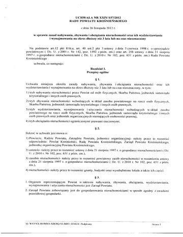 UCHWALA NR XXIV/157/2012 RADY POWIATU KROŚNIEŃSKIEGO z dnia 26 listopada 2012 r. w sprawie zasad nabywania, zbywania i obciążania nieruchomości oraz ich wydzierżawiania i wynajmowania na okres dłuższy niż 3 lata lub na czas nieoznaczony Na podstawie art.12 pkt 8 lit.a, art. 40 ust.2 pkt 3 ustawy z dnia 5 czerwca 1998 r. o samorządzie powiatowym (Dz. U. z2001 r. Nr 142, poz. 1592 zpóźn. zm.) oraz art. 25b ustawy z dnia 21 sierpnia 1997 r. o gospodarce nieruchomościami ( Dz. U. z 20 I Or. Nr I 02, poz. 651 z późn. zm.) Rada Powiatu Krośnieńskiego uchwala, co następuje: Rozdział 1. Przepisy ogólne § 1. Uchwała n1111e.1sza określa zasady nabywania, zbywania i obciążania nieruchomości i wynajmowania na okres dłuższy niż 3 Iata lub na czas nieoznaczony, w tym: oraz ich wydzierżawiania nieruchomości przez Powiat od osób fizycznych, Skarbu terytorialnego i innych osób prawnych, I) tryb nabywania Państwa, jednostek samorządu 2) tryb zbywania nieruchomości wchodzących w skład zasobu powiatowego na rzecz osób fizycznych, Skarbu Pai'lstwa, jednostek samorządu terytorialnego i innych osób prawnych, 3) tryb wydzierżawiania, wynajmowania i użyczania nieruchomości wchodzących w skład zasobu powiatowego na rzecz osób fizycznych, Skarbu Państwa, jednostek samorządu terytorialnego i innych osób prawnych oraz jednostek organizacyjnych niemających osobowości prawnej, 4) tryb obciążania nieruchomości ograniczonymi prawami rzeczowymi. § 2. Ilekroć w uchwale jest mowa o: I) Powiecie, Radzie Powiatu, Zarządzie Powiatu, jednostce organizacyjnej- należy przez to rozum1ec odpowiednio: Powiat Krośnieński, Radę Powiatu Krośnieńskiego, Zarząd Powiatu Krośnie1'lskiego, jednostkę organizacyjną Powiatu Krośnieńskiego, 2) ustawie- należy przez to rozumieć ustawę z dnia 21 sierpnia 1997 r. o gospodarce U. z 20 I Or. Nr I 02, poz. 651 z późn. zm.), nieruchomościami ( Dz. 3) zasobie nieruchomości- należy przez to rozumieć powiatowy zasób nieruchomości w rozumieniu ustawy z dnia 21 sierpnia 1997 r. o gospodarce nieruchomościami ( Dz. U. z 20 I O r. Nr I 02, poz. 651 z późn. zm. ), 4) nieruchomości- należy przez to rozumieć grunty, budynki oraz wyodrębnione lokale a także ich części. § 3. I. Organem reprezentującym Powiat w zakresie nabywania, zbywania, wynajmowania i użyczania nieruchomości jest Zarząd Powiatu. 2. Zarząd Powiatu zobowiązany jest do gospodarowania gospodarki. nieruchomościami obciążania, wydzierżawiania. w sposób zgodny z zasadami prawidłowej Id: WSYNX-ROMSO-XBOIQ-VLMBT -TFHGY. Podpisany Strona I Rozdział Nabywanie 2. nieruchomości § 4. 1. Zarząd Powiatu może nabywać prawo własności bądź prawo użytkowania wieczystego nieruchomości na cele: 1) związane z 2) związane z tworzeniem zasobu 3) związane z zadaniami nieruchomości 2. Nabycie I) realizacją zadań nieodpłatnego nieruchomości, wynikającymi z innych przepisów. na rzecz Powiatu przekazania następuje w drodze: decyzją administracyjną nieruchomości, 2) zakupu 3) przyjęcia 4) wywłaszczenia 5) innych Powiatu, darowizny, zamiany, spadku lub zapisu, na rzecz Powiatu, czynności prawnych. § 5. O nabyciu nieruchomości decyduje Zarząd Powiatu w drodze uchwały, z zastrzeżeniem § 6. § 6. Zgody Rady Powiatu wyrażonej w formie uchwały wymaga nabycie nieruchomości, której przekracza 50 OOO zł. Nie dotyczy to przypadku określonego w§ 4 ust. 2 pkt 1. wartość § 7. I. Odpłatne nieruchomości następuje po cenie ustalonej w wyniku negocjacji ze zbywcą, jednak nie ustalona przez rzeczoznawcę majątkowego, chyba że za nabyciem za v,yższą cenę szczególne okoliczności. nabycie wyższej niż wartość przemawiają 2. Uzgodnienie ceny i spisanie protokołu w sprawie nabycia umowy w formie aktu notarialnego. Zbywanie nieruchomości nieruchomości Rozdział 3. i oddawanie w użytkowanie stanowi podstawę do zawarcia wieczyste § 8. 1. Zarząd Powiatu może zbywać i oddawać w użytkowanie wieczyste zasobu, jeżeli nieruchomości te są zbędne do realizacji zadań Powiatu. 2. Zbycie I) nieruchomości może nastąpić nieruchomości wchodzące w skład w drodze: sprzedaży nieruchomości, 2) darowizny lub zamiany, 3) innych czynności prawnych. § 9. 1. O zbyciu nieruchomości i oddaniu nieruchomości w w drodze uchwały z zastrzeżeniem § I O i § 11. 2. W uchwale określa się warunki zbycia nieruchomości, użytkowanie w tym wieczyste decyduje Zarząd Powiatu cenę wywoławczą. ·------------ Id: WSYNX-ROMSO-XBOIQ-VLMBT-TFHGV. Podpisany Strona 2 § 10. Jeżeli wartość nieruchomości przekracza 50 OOO zł, do jej zbycia lub oddania w użytkowanie wieczyste wymagana jest zgoda Rady Powiatu wyrażona w formie uchwały.Zasada powyższa obowiązuje również przy zamianie nieruchomości. § 11. W przypadku zbycia nieruchomości w formie darowizny, wymagana jest w formie uchwały. każdorazowo zgoda Rady Powiatu wyrażona § 12. Zbycie nieruchomości i oddanie w oraz jej przepisach wykonawczych. użytkowanie następuje według wieczyste zasad określonych w ustawie § 13. Koszty przygotowania nieruchomości do przez rzeczoznawcę majątkowego. sprzedaży doliczane będą do wartości nieruchomości określonej § 14. I. Zarząd Powiatu może dokonać zamiany nieruchomości w przypadku, gdy jest to uzasadnione potrzebami Powiatu lub uzasadnionymi potrzebami innych osób prawnych lub fizycznych 2. Warunki zamiany nieruchomości uzgadnia się rokowań. w drodze Rozdział Obciążanie nieruchomości 4. ograniczonymi prawami rzeczowymi § 15. 1. Zarząd Powiatu może na nieruchomościach ustanawiać ograniczone prawa rzeczowe: 1) użytkowanie, 2) służebność gruntową- w szczególności gdy jest to niezbędne dla zapewnienia do drogi publicznej oraz urządzeń infrastruktury technicznej, 3) służebność przesyłu stanowią urządzenia, użytkowanie na rzecz przedsiębiorcy, który zamierza wybudować lub którego o których mowa
