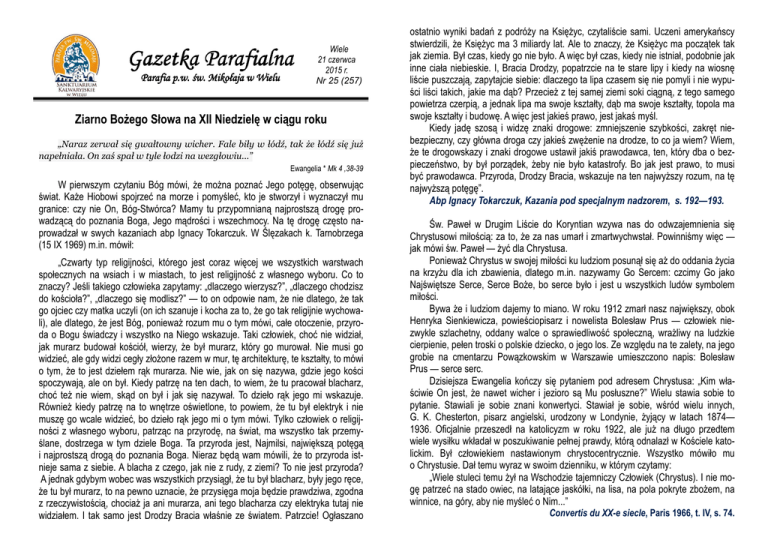Gazetka Parafialna Parafia p.w. św. Mikołaja w Wielu Wiele 21 czerwca 2015 r. Nr 25 (257) Ziarno Bożego Słowa na XII Niedzielę w ciągu roku „Naraz zerwał się gwałtowny wicher. Fale biły w łódź, tak że łódź się już napełniała. On zaś spał w tyle łodzi na wezgłowiu…” Ewangelia * Mk 4 ,38-39 W pierwszym czytaniu Bóg mówi, że można poznać Jego potęgę, obserwując świat. Każe Hiobowi spojrzeć na morze i pomyśleć, kto je stworzył i wyznaczył mu granice: czy nie On, Bóg-Stwórca? Mamy tu przypomnianą najprostszą drogę prowadzącą do poznania Boga, Jego mądrości i wszechmocy. Na tę drogę często naprowadzał w swych kazaniach abp Ignacy Tokarczuk. W Ślęzakach k. Tarnobrzega (15 IX 1969) m.in. mówił: „Czwarty typ religijności, którego jest coraz więcej we wszystkich warstwach społecznych na wsiach i w miastach, to jest religijność z własnego wyboru. Co to znaczy? Jeśli takiego człowieka zapytamy: „dlaczego wierzysz?”, „dlaczego chodzisz do kościoła?”, „dlaczego się modlisz?” — to on odpowie nam, że nie dlatego, że tak go ojciec czy matka uczyli (on ich szanuje i kocha za to, że go tak religijnie wychowali), ale dlatego, że jest Bóg, ponieważ rozum mu o tym mówi, całe otoczenie, przyroda o Bogu świadczy i wszystko na Niego wskazuje. Taki człowiek, choć nie widział, jak murarz budował kościół, wierzy, że był murarz, który go murował. Nie musi go widzieć, ale gdy widzi cegły złożone razem w mur, tę architekturę, te kształty, to mówi o tym, że to jest dziełem rąk murarza. Nie wie, jak on się nazywa, gdzie jego kości spoczywają, ale on był. Kiedy patrzę na ten dach, to wiem, że tu pracował blacharz, choć też nie wiem, skąd on był i jak się nazywał. To dzieło rąk jego mi wskazuje. Również kiedy patrzę na to wnętrze oświetlone, to powiem, że tu był elektryk i nie muszę go wcale widzieć, bo dzieło rąk jego mi o tym mówi. Tylko człowiek o religijności z własnego wyboru, patrząc na przyrodę, na świat, ma wszystko tak przemyślane, dostrzega w tym dziele Boga. Ta przyroda jest, Najmilsi, największą potęgą i najprostszą drogą do poznania Boga. Nieraz będą wam mówili, że to przyroda istnieje sama z siebie. A blacha z czego, jak nie z rudy, z ziemi? To nie jest przyroda? A jednak gdybym wobec was wszystkich przysiągł, że tu był blacharz, były jego ręce, że tu był murarz, to na pewno uznacie, że przysięga moja będzie prawdziwa, zgodna z rzeczywistością, chociaż ja ani murarza, ani tego blacharza czy elektryka tutaj nie widziałem. I tak samo jest Drodzy Bracia właśnie ze światem. Patrzcie! Ogłaszano ostatnio wyniki badań z podróży na Księżyc, czytaliście sami. Uczeni amerykańscy stwierdzili, że Księżyc ma 3 miliardy lat. Ale to znaczy, że Księżyc ma początek tak jak ziemia. Był czas, kiedy go nie było. A więc był czas, kiedy nie istniał, podobnie jak inne ciała niebieskie. I, Bracia Drodzy, popatrzcie na te stare lipy i kiedy na wiosnę liście puszczają, zapytajcie siebie: dlaczego ta lipa czasem się nie pomyli i nie wypuści liści takich, jakie ma dąb? Przecież z tej samej ziemi soki ciągną, z tego samego powietrza czerpią, a jednak lipa ma swoje kształty, dąb ma swoje kształty, topola ma swoje kształty i budowę. A więc jest jakieś prawo, jest jakaś myśl. Kiedy jadę szosą i widzę znaki drogowe: zmniejszenie szybkości, zakręt niebezpieczny, czy główna droga czy jakieś zwężenie na drodze, to co ja wiem? Wiem, że te drogowskazy i znaki drogowe ustawił jakiś prawodawca, ten, który dba o bezpieczeństwo, by był porządek, żeby nie było katastrofy. Bo jak jest prawo, to musi być prawodawca. Przyroda, Drodzy Bracia, wskazuje na ten najwyższy rozum, na tę najwyższą potęgę”. Abp Ignacy Tokarczuk, Kazania pod specjalnym nadzorem, s. 192—193. Św. Paweł w Drugim Liście do Koryntian wzywa nas do odwzajemnienia się Chrystusowi miłością: za to, że za nas umarł i zmartwychwstał. Powinniśmy więc — jak mówi św. Paweł — żyć dla Chrystusa. Ponieważ Chrystus w swojej miłości ku ludziom posunął się aż do oddania życia na krzyżu dla ich zbawienia, dlatego m.in. nazywamy Go Sercem: czcimy Go jako Najświętsze Serce, Serce Boże, bo serce było i jest u wszystkich ludów symbolem miłości. Bywa że i ludziom dajemy to miano. W roku 1912 zmarł nasz największy, obok Henryka Sienkiewicza, powieściopisarz i nowelista Bolesław Prus — człowiek niezwykle szlachetny, oddany walce o sprawiedliwość społeczną, wrażliwy na ludzkie cierpienie, pełen troski o polskie dziecko, o jego los. Ze względu na te zalety, na jego grobie na cmentarzu Powązkowskim w Warszawie umieszczono napis: Bolesław Prus — serce serc. Dzisiejsza Ewangelia kończy się pytaniem pod adresem Chrystusa: „Kim właściwie On jest, że nawet wicher i jezioro są Mu posłuszne?” Wielu stawia sobie to pytanie. Stawiali je sobie znani konwertyci. Stawiał je sobie, wśród wielu innych, G. K. Chesterton, pisarz angielski, urodzony w Londynie, żyjący w latach 1874— 1936. Oficjalnie przeszedł na katolicyzm w roku 1922, ale już na długo przedtem wiele wysiłku wkładał w poszukiwanie pełnej prawdy, którą odnalazł w Kościele katolickim. Był człowiekiem nastawionym chrystocentrycznie. Wszystko mówiło mu o Chrystusie. Dał temu wyraz w swoim dzienniku, w którym czytamy: „Wiele stuleci temu żył na Wschodzie tajemniczy Człowiek (Chrystus). I nie mogę patrzeć na stado owiec, na latające jaskółki, na lisa, na pola pokryte zbożem, na winnice, na góry, aby nie myśleć o Nim...” Convertis du XX-e siecle, Paris 1966, t. IV, s. 74. Ogłoszenia duszpasterskie 1. 1. Dziś – dwunasta niedziela w ciągu roku. W Ewangelii słyszeliśmy o tym, że tłumy, które obserwowały działalność Pana Jezusa, zastanawiały się nad tym, kim On jest. I nam też nie wolno przejść obo