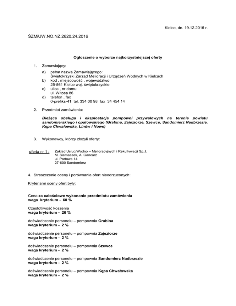 Kielce, dn. 19.12.2016 r. ŚZMiUW.NO.NZ.2620.24.2016 Ogłoszenie o wyborze najkorzystniejszej oferty 1. Zamawiający: a) b) c) d) 2. pełna nazwa Zamawiającego: Świętokrzyski Zarząd Melioracji i Urządzeń Wodnych w Kielcach kod , miejscowość , województwo 25-561 Kielce woj. świętokrzyskie ulica , nr domu ul. Witosa 86 telefon , fax 0-prefiks-41 tel. 334 00 98 fax 34 454 14 Przedmiot zamówienia: Bieżąca obsługa i eksploatacja pompowni przywałowych na terenie powiatu sandomierskiego i opatowskiego (Grabina, Zajeziorze, Szewce, Sandomierz Nadbrzezie, Kępa Chwałowska, Linów i Nowe) 3. Wykonawcy, którzy złożyli oferty: oferta nr 1 : Zakład Usług Wodno – Melioracyjnych i Rekultywacji Sp.J. M. Siemaszek, A. Gancarz ul. Portowa 14 27-600 Sandomierz 4. Streszczenie oceny i porównania ofert nieodrzuconych: Kryteriami oceny ofert były: Cena za całościowe wykonanie przedmiotu zamówienia waga kryterium - 60 % Częstotliwość koszenia waga kryterium - 26 % doświadczenie personelu – pompownia Grabina waga kryterium - 2 % doświadczenie personelu – pompownia Zajeziorze waga kryterium - 2 % doświadczenie personelu – pompownia Szewce waga kryterium - 2 % doświadczenie personelu – pompownia Sandomierz Nadbrzezie waga kryterium - 2 % doświadczenie personelu – pompownia Kępa Chwałowska waga kryterium - 2 % doświadczenie personelu – pompownia Linów waga kryterium - 2 % doświadczenie personelu – pompownia Nowe waga kryterium - 2 % punktacja w kryterium numer oferty 1 cena częstotliwość koszenia 60 0 doświadczenie personelu łączna pompownia pompownia pompownia pompownia pompownia pompownia pompownia punktacja Grabina Zajeziorze Szewce Sandomierz Kępa Linów Nowe Nadbrzezie Chwałowska 2 2 2 2 2 2 2 74 5. Wykonawca, którego ofertę wybrano, jako ofertę najkorzystniejszą: - oferta nr 1 tj. Zakład Usług Wodno – Melioracyjnych i Rekultywacji Sp.J. M. Siemaszek, A. Gancarz ul. Portowa 14 27-600 Sandomierz – oferta z najwyższą ilością punktów. 6. Świętokrzyski Zarząd Melioracji i Urządzeń Wodnych w Kielcach zawiadamia, że umowa w sprawie zamówienia publicznego może być zawarta po dniu 19-12-2016 r.