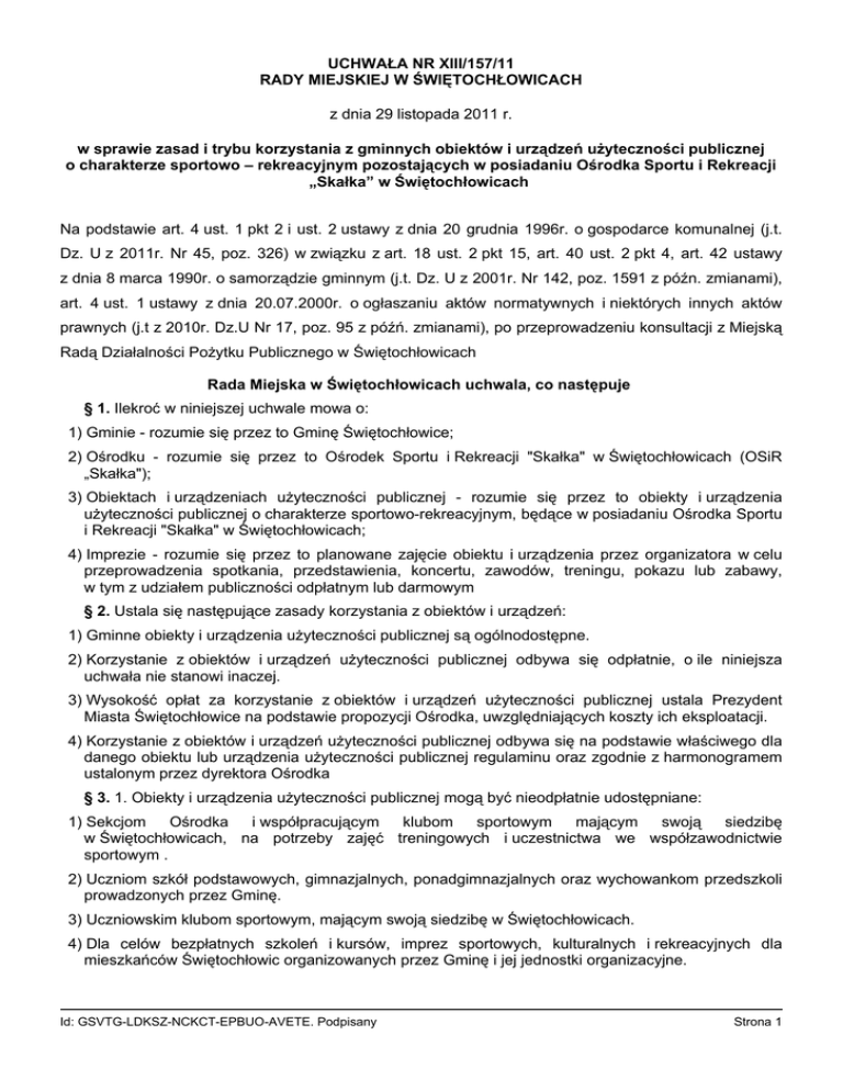 UCHWAŁA NR XIII/157/11 RADY MIEJSKIEJ W ŚWIĘTOCHŁOWICACH z dnia 29 listopada 2011 r. w sprawie zasad i trybu korzystania z gminnych obiektów i urządzeń użyteczności publicznej o charakterze sportowo – rekreacyjnym pozostających w posiadaniu Ośrodka Sportu i Rekreacji „Skałka” w Świętochłowicach Na podstawie art. 4 ust. 1 pkt 2 i ust. 2 ustawy z dnia 20 grudnia 1996r. o gospodarce komunalnej (j.t. Dz. U z 2011r. Nr 45, poz. 326) w związku z art. 18 ust. 2 pkt 15, art. 40 ust. 2 pkt 4, art. 42 ustawy z dnia 8 marca 1990r. o samorządzie gminnym (j.t. Dz. U z 2001r. Nr 142, poz. 1591 z późn. zmianami), art. 4 ust. 1 ustawy z dnia 20.07.2000r. o ogłaszaniu aktów normatywnych i niektórych innych aktów prawnych (j.t z 2010r. Dz.U Nr 17, poz. 95 z późń. zmianami), po przeprowadzeniu konsultacji z Miejską Radą Działalności Pożytku Publicznego w Świętochłowicach Rada Miejska w Świętochłowicach uchwala, co następuje § 1. Ilekroć w niniejszej uchwale mowa o: 1) Gminie - rozumie się przez to Gminę Świętochłowice; 2) Ośrodku - rozumie się przez to Ośrodek Sportu i Rekreacji "Skałka" w Świętochłowicach (OSiR „Skałka"); 3) Obiektach i urządzeniach użyteczności publicznej - rozumie się przez to obiekty i urządzenia użyteczności publicznej o charakterze sportowo-rekreacyjnym, będące w posiadaniu Ośrodka Sportu i Rekreacji "Skałka" w Świętochłowicach; 4) Imprezie - rozumie się przez to planowane zajęcie obiektu i urządzenia przez organizatora w celu przeprowadzenia spotkania, przedstawienia, koncertu, zawodów, treningu, pokazu lub zabawy, w tym z udziałem publiczności odpłatnym lub darmowym § 2. Ustala się następujące zasady korzystania z obiektów i urządzeń: 1) Gminne obiekty i urządzenia użyteczności publicznej są ogólnodostępne. 2) Korzystanie z obiektów i urządzeń użyteczności publicznej odbywa się odpłatnie, o ile niniejsza uchwała nie stanowi inaczej. 3) Wysokość opłat za korzystanie z obiektów i urządzeń użyteczności publicznej ustala Prezydent Miasta Świętochłowice na podstawie propozycji Ośrodka, uwzględniających koszty ich eksploatacji. 4) Korzystanie z obiektów i urządzeń użyteczności publicznej odbywa się na podstawie właściwego dla danego obiektu lub urządzenia użyteczności publicznej regulaminu oraz zgodnie z harmonogramem ustalonym przez dyrektora Ośrodka § 3. 1. Obiekty i urządzenia użyteczności publicznej mogą być nieodpłatnie udostępniane: 1) Sekcjom Ośrodka i współpracującym klubom sportowym mającym swoją siedzibę w Świętochłowicach, na potrzeby zajęć treningowych i uczestnictwa we współzawodnictwie sportowym . 2) Uczniom szkół podstawowych, gimnazjalnych, ponadgimnazjalnych oraz wychowankom przedszkoli prowadzonych przez Gminę. 3) Uczniowskim klubom sportowym, mającym swoją siedzibę w Świętochłowicach. 4) Dla celów bezpłatnych szkoleń i kursów, imprez sportowych, kulturalnych i rekreacyjnych dla mieszkańców Świętochłowic organizowanych przez Gminę i jej jednostki organizacyjne. Id: GSVTG-LDKSZ-NCKCT-EPBUO-AVETE. Podpisany Strona 1 5) Organizacjom pozarządowym w rozumieniu ustawy z dnia 24 kwietnia 2003r. o działalności pożytku publicznego i o wolontariacie, działającym na terenie Gminy, na potrzeby niekomercyjnych imprez sportowych, kulturalnych i rekreacyjnych. 2. Korzystanie z krytej pływalni i lodowiska odbywa się odpłatnie z zastrzeżeniem pkt 1-3 1) Posiadający Kartę „Trzy Plus” na mocy uchwały Nr VI/62/11 Rady Miejskiej w Świętochłowicach z dnia 30.03.2011r. w sprawie uchwalenia Programu "Trzy Plus", mogą korzystać z krytej pływalni bezpłatnie przez 1,5 h dziennie. 2) Posiadający Kartę „Trzy Plus” na mocy uchwały Nr VI/62/11 Rady Miejskiej w Świętochłowicach z dnia 30.03.2011r. w sprawie uchwalenia Programu "Trzy Plus", mogą korzystać z lodowiska bezpłatnie przez 45 min. dziennie. 3) Uczniowie korzystają bezpłatnie z krytej pływalni na potrzeby szkolnego współzawodnictwa sportowego dzieci i młodzieży z terenu Gminy. § 4. Obiekty i urządzenia użyteczności publicznej mogą być udostępniane na cele inne niż sportoworekreacyjne na podstawie Umowy zawartej z Ośrodkiem. § 5. Podstawą zawarcia Umowy o korzystanie z obiektów i urządzeń użyteczności publicznej jest pisemny wniosek składany do Ośrodka, który winien zawierać dane o zakresie i częstotliwości wykorzystania obiektów i urządzeń użyteczności publicznej, w tym udostępnieniu podmiotom korzystającym z obiektów i urządzeń użyteczności publicznej miejsca na ekspozycję reklam. § 6. Podmioty, które nieodpłatnie korzystają z obiektów i urządzeń użyteczności publicznej, organizując niekomercyjne imprezy sportowe, kulturalne i rekreacyjne, mają prawo w czasie trwania imprez do sprzedaży własnych materiałów promocyjnych (pamiątek i artykułów sportowych) w miejscu i zakresie uzgodnionym z Ośrodkiem. § 7. Wykonanie uchwały powierza się Prezydentowi Miasta Świętochłowice. § 8. Traci moc uchwała Nr XXVII/235/2000 Rady Miejskiej w Świętochłowicach z dnia 20 grudnia 2000r. w sprawie korzystania przez Świętochłowicki Klub Sportowy "Naprzód" Lipiny z obiektu sportowego przy ulicy Łagiewnickiej 80 w Świętochłowicach będącego w zarządzie Ośrodka Sportu i Rekreacji "Skałka" § 9. Uchwała wchodzi w życie po upływie 14 dni od dnia ogłoszenia w Dzienniku Urzędowym Województwa Śląskiego. Przewodniczący Rady Miejskiej w Świętochłowicach Marek Palka Id: GSVTG-LDKSZ-NCKCT-EPBUO-AVETE. Podpisany Strona 2