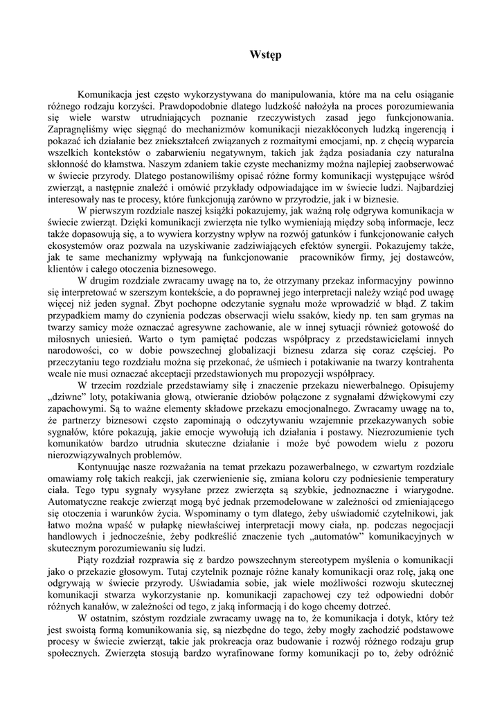Wstęp Komunikacja jest często wykorzystywana do manipulowania, które ma na celu osiąganie różnego rodzaju korzyści. Prawdopodobnie dlatego ludzkość nałożyła na proces porozumiewania się wiele warstw utrudniających poznanie rzeczywistych zasad jego funkcjonowania. Zapragnęliśmy więc sięgnąć do mechanizmów komunikacji niezakłóconych ludzką ingerencją i pokazać ich działanie bez zniekształceń związanych z rozmaitymi emocjami, np. z chęcią wyparcia wszelkich kontekstów o zabarwieniu negatywnym, takich jak żądza posiadania czy naturalna skłonność do kłamstwa. Naszym zdaniem takie czyste mechanizmy można najlepiej zaobserwować w świecie przyrody. Dlatego postanowiliśmy opisać różne formy komunikacji występujące wśród zwierząt, a następnie znaleźć i omówić przykłady odpowiadające im w świecie ludzi. Najbardziej interesowały nas te procesy, które funkcjonują zarówno w przyrodzie, jak i w biznesie. W pierwszym rozdziale naszej książki pokazujemy, jak ważną rolę odgrywa komunikacja w świecie zwierząt. Dzięki komunikacji zwierzęta nie tylko wymieniają między sobą informacje, lecz także dopasowują się, a to wywiera korzystny wpływ na rozwój gatunków i funkcjonowanie całych ekosystemów oraz pozwala na uzyskiwanie zadziwiających efektów synergii. Pokazujemy także, jak te same mechanizmy wpływają na funkcjonowanie pracowników firmy, jej dostawców, klientów i całego otoczenia biznesowego. W drugim rozdziale zwracamy uwagę na to, że otrzymany przekaz informacyjny powinno się interpretować w szerszym kontekście, a do poprawnej jego interpretacji należy wziąć pod uwagę więcej niż jeden sygnał. Zbyt pochopne odczytanie sygnału może wprowadzić w błąd. Z takim przypadkiem mamy do czynienia podczas obserwacji wielu ssaków, kiedy np. ten sam grymas na twarzy samicy może oznaczać agresywne zachowanie, ale w innej sytuacji również gotowość do miłosnych uniesień. Warto o tym pamiętać podczas współpracy z przedstawicielami innych narodowości, co w dobie powszechnej globalizacji biznesu zdarza się coraz częściej. Po przeczytaniu tego rozdziału można się przekonać, że uśmiech i potakiwanie na twarzy kontrahenta wcale nie musi oznaczać akceptacji przedstawionych mu propozycji współpracy. W trzecim rozdziale przedstawiamy siłę i znaczenie przekazu niewerbalnego. Opisujemy „dziwne” loty, potakiwania głową, otwieranie dziobów połączone z sygnałami dźwiękowymi czy zapachowymi. Są to ważne elementy składowe przekazu emocjonalnego. Zwracamy uwagę na to, że partnerzy biznesowi często zapominają o odczytywaniu wzajemnie przekazywanych sobie sygnałów, które pokazują, jakie emocje wywołują ich działania i postawy. Niezrozumienie tych komunikatów bardzo utrudnia skuteczne działanie i może być powodem wielu z pozoru nierozwiązywalnych problemów. Kontynuując nasze rozważania na temat przekazu pozawerbalnego, w czwartym rozdziale omawiamy rolę takich reakcji, jak czerwienienie się, zmiana koloru czy podniesienie temperatury ciała. Tego typu sygnały wysyłane przez zwierzęta są szybkie, jednoznaczne i wiarygodne. Automatyczne reakcje zwierząt mogą być jednak przemodelowane w zależności od zmieniającego się otoczenia i warunków życia. Wspominamy o tym dlatego, żeby uświadomić czytelnikowi, jak łatwo można wpaść w pułapkę niewłaściwej interpretacji mowy ciała, np. podczas negocjacji handlowych i jednocześnie, żeby podkreślić znaczenie tych „automatów” komunikacyjnych w skutecznym porozumiewaniu się ludzi. Piąty rozdział rozprawia się z bardzo powszechnym stereotypem myślenia o komunikacji jako o przekazie głosowym. Tutaj czytelnik poznaje różne kanały komunikacji oraz rolę, jaką one odgrywają w świecie przyrody. Uświadamia sobie, jak wiele możliwości rozwoju skutecznej komunikacji stwarza wykorzystanie np. komunikacji zapachowej czy też odpowiedni dobór różnych kanałów, w zależności od tego, z jaką informacją i do kogo chcemy dotrzeć. W ostatnim, szóstym rozdziale zwracamy uwagę na to, że komunikacja i dotyk, który też jest swoistą formą komunikowania się, są niezbędne do tego, żeby mogły zachodzić podstawowe procesy w świecie zwierząt, takie jak prokreacja oraz budowanie i rozwój różnego rodzaju grup społecznych. Zwierzęta stosują bardzo wyrafinowane formy komunikacji po to, żeby odróżnić obcych od swoich i skutecznie bronić się przed błędami w doborze partnerów czy niebezpieczeństwem utraty cennych zasobów. Przenosząc wiele milionów lat doświadczeń wprost ze świata zwierząt na grunt biznesowy, pokazujemy jak można wykorzystać je w realiach globalnej konkurencji, trudnych do monitorowania przepływów kapitału i nieograniczonej wymiany informacji. Każdy z rozdziałów książki stanowi zamkniętą całość i składa się z czterech części. Pierwsza część przedstawia wyniki badań nad mechanizmami komunikacji zwierząt, druga opisuje jak podobne mechanizmy działają w świecie ludzi, a w szczególności w biznesie, trzecia udostępnia linki do filmików pokazujących opisywane mechanizmy. Czwarta część, kończąca rozdział, to tabela analogii pomiędzy światem przyrody i biznesu. Dzięki takiej konstrukcji można czytać poszczególne rozdziały w wolnych chwilach oraz w szybki sposób wyciągać praktyczne wnioski z prezentowanych zagadnień. Zachęcamy oczywiście do przeczytania całej książki, mając przekonanie, że powstanie wtedy w głowie czytelnika pełny obraz zasad i metod skutecznej komunikacji. Oddawana do rąk czytelnika książka jest trzecią z serii “Zwierzeca recepta na sukces w biznesie”. Cała seria jest poświęcona praktycznym zastosowaniom coraz bardziej popularnych teorii behawioralnych. Prezentuje pewne zwyczaje funkcjonujące w świecie zwierząt i wskazuje, jak można praktycznie wykorzystać je w zarządzaniu firmą, b