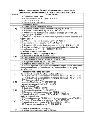 Zakres i harmonogram ćwiczeń laboratoryjnych z przedmiotu: Technologia robót drogowych w roku akademickim 2015/2016 Nr zajęć Wprowadzenie 1.1 Omówienie planu zajęć, 1.2 Przedstawienie metod i kryteriów oceny 1 1.3 Zapoznanie z BHP 1.4 Zapoznanie z sylabusem 2. Kruszywo, piasek 2.1. Skład ziarnowy wg PN-EN 933–1 2 (F) 2.2. Wskaźnik kształtu (ziaren nieforemnych) wg PN–EN 933–4 2.3. Gęstość i nasiąkliwość wg PN–EN 1097– 6:2002 2.4. Odporność na rozdrabnianie kruszywa grubego (w bębnie Los Angeles) wg PN–EN 1097–6 2.5. Odporność na działanie mrozu metodą zmodyfikowaną bezpośrednią wg PN–EN 1367–1 2.6. Odporność na szok termiczny wg PN-EN 1367-5 3 2.7. Zgorzel słoneczna bazaltu wg PN-EN 1367-3 2.8. Przyczepność asfaltu do powierzchni ziaren PN – EN 12697 – 11 2.9. Analiza wyników uzyskanych z bezpośrednich badań i ustalenie nazwy kruszywa wg PN – EN 13043 i WT-1 2014 3. Asfalty, emulsje asfaltowe Kolokwium 1 ( dział 2. Kruszywo, piasek) 3.1. Penetracja asfaltu wg PN–EN 1426 4 (F) 3.2. Temperatura mięknienia asfaltu wg PN–EN 1427 3.3. Temperatura łamliwości asfaltu wg PN–EN 12593 3.4. Ciągliwość asfaltu wg PN – EN 13589 3.5. Lepkość dynamiczna PN–EN 13302 5 3.6. Analiza wyników uzyskanych z przeprowadzonych badań, określenie rodzaju asfaltu oraz sporządzenie Karty Jakości Asfaltu (BTDC) wg PN–EN 12591 4. Mieszanki mineralno-asfaltowe Kolokwium 2 (dział 3. Asfalty, emulsje asfaltowe) 6 4.1 Projektowanie składu mieszanki mineralno-asfaltowej PN–EN–13108 7 4.2 Projektowanie składu mieszanki mineralno-asfaltowej PN–EN–13108 4.2 Wykonanie próbek MMA 8 (F) - w ubijaku Marshalla wg PN-EN 12697-30 - w prasie żyratorowej wg PN-EN- 12697-31 Badania próbek MMA 4.3 Gestość wg PN-EN 12697-5 9 (F) 4.4 Gęstość objętościowa PN-EN 12697-6 4.5 Zawartość wolnych przestrzeni wg PN-EN 12697-8 4.6 Moduł sztywnośći metodą IT-CY wg PN-EN 12697-26 Badania próbek MMA 4.7 Wodoodporność wg PN-EN 12697-12 oraz procedury wg WT 2 2014 4.8 Odporność na deformacje trwałe wg PN-EN 12697-22 10 4.9 Moduł sztywności metodą 4PB-PR wg PN-EN 12697-26 4.10 Trwałość zmęczeniowa wg PN-EN 12697-24 11 (F) 5. Mieszanki związana cementem. 5.1. Skład ziarnowy piasku wg PN–EN 933–1 12 (F) 13 14 15 5.2. Oznaczenie wilgotności materiału drogowego wg PN–EN 13286-1 5.3. Badanie Proctora piasku wg PN–EN 13286-2 oraz wskaźnika nośności CBR wg PN-EN13286-47 5.4. Projektowanie składu mieszanki cementowo-gruntowej wg PN–EN 14227-1 5.5. Wykonanie próbek walcowych wg PN–EN 13286-50 5.6. Wykonanie próby wytrzymałościowej PN-EN 13286-41 Kolokwium 3 ( Dział 4. Mieszanki mineralno-asfaltowe) 5.7. Ustalenie recepty mieszanki cementowej 6.Pokaz sprzętu do badania cech eksploatacyjnych nawierzchni Wyjaśnienia do tabeli: (F) – na zajęciach obowiązuje fartuch. Procedury laboratoryjne: "Wymagania techniczne" - WT-1 2014, WT-2 2015, WT-5 2015, GDDKiA 2010; "Nawierzchnie asfaltowe", WKŁ Warszawa 2010. Jerzy Piłat, Piotr Radziszewski "Technologia materiałów i nawierzchni drogowych", WPW Warszawa 2004. Maria Kalabińska, Jerzy Piłat, Piotr Radziszewski "Technologia warstw asfaltowych", WKŁ Warszawa 2004. Krzysztof Błażejowski, Stanisław Styk "Materiały pomocnicze do ćwiczeń z technologii materiałów i nawierzchni drogowych", WPL 1986. Zdzisław Misztal, Leon Świątczak Prowadzący zajęcia mgr inż. Agnieszka Woszuk