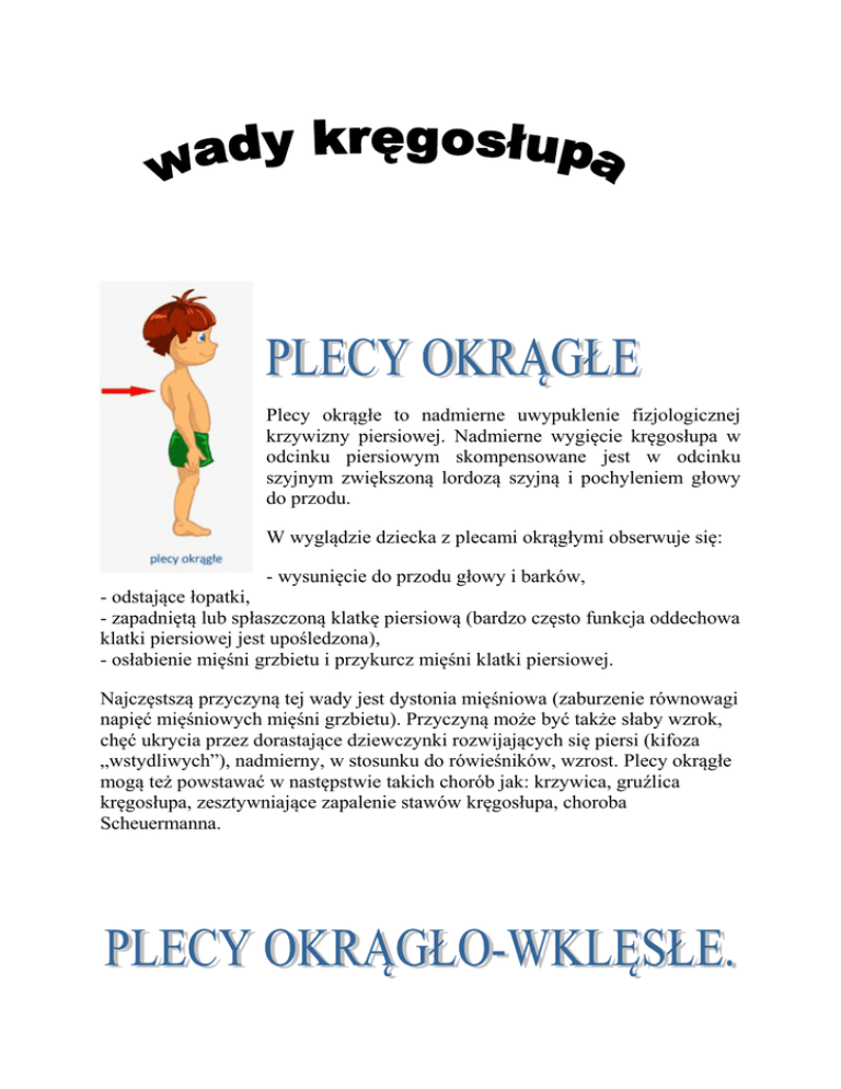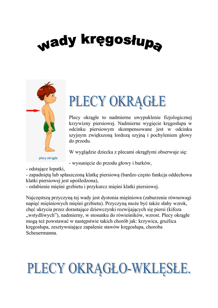 Plecy okrągłe to nadmierne uwypuklenie fizjologicznej krzywizny piersiowej. Nadmierne wygięcie kręgosłupa w odcinku piersiowym skompensowane jest w odcinku szyjnym zwiększoną lordozą szyjną i pochyleniem głowy do przodu. W wyglądzie dziecka z plecami okrągłymi obserwuje się: - wysunięcie do przodu głowy i barków, - odstające łopatki, - zapadniętą lub spłaszczoną klatkę piersiową (bardzo często funkcja oddechowa klatki piersiowej jest upośledzona), - osłabienie mięśni grzbietu i przykurcz mięśni klatki piersiowej. Najczęstszą przyczyną tej wady jest dystonia mięśniowa (zaburzenie równowagi napięć mięśniowych mięśni grzbietu). Przyczyną może być także słaby wzrok, chęć ukrycia przez dorastające dziewczynki rozwijających się piersi (kifoza „wstydliwych”), nadmierny, w stosunku do rówieśników, wzrost. Plecy okrągłe mogą też powstawać w następstwie takich chorób jak: krzywica, gruźlica kręgosłupa, zesztywniające zapalenie stawów kręgosłupa, choroba Scheuermanna. Zarówno kifoza piersiowa, jak i lordoza lędźwiowa są nadmiernie powiększone, głowa, barki i brzuch silnie wysunięte do przodu. Osłabieniu ulegają mięśnie grzbietu w odcinku piersiowym, mięśnie pośladkowe i brzucha. Przykurczone są mięśnie klatki piersiowej i mięśnie grzbietu – odcinka lędźwiowego. Wada ta charakteryzuje się spłaszczeniem lub brakiem fizjologicznych krzywizn kręgosłupa. W badaniu nie stwierdza się natomiast ograniczenia ruchomości w poszczególnych odcinkach kręgosłupa. U osób z wadą o typie pleców płaskich klatka piersiowa jest płaska, jej ruchomość i pojemność są ograniczone, barki opadnięte. Zmniejszenie fizjologicznych wygięć kręgosłupa powoduje wypadnięcie funkcji amortyzacyjnej kręgosłupa, sprzyja powstawaniu zmian przeciążeniowych i zwyrodnieniowych kręgosłupa, dlatego ludzie z tą wadą często uskarżają się na bóle głowy. W wyglądzie dziecka z plecami płaskimi obserwuje się: - sylwetkę wątłą, - układ mięśniowy słabo ukształtowany, - barki obniżone i wysunięte do przodu - spłaszczoną klatkę piersiową Istota tej wady polega na zwiększonym przodowy gięciu kręgosłupa w odcinku lędźwiowym (pogłębieniu lordozy lędźwiowej). Przyczyną jest najczęściej dystonia mięśniowa mięśni grzbietu, brzucha, pośladków i kończyn dolnych. Osoby z tą wadą postawy często uskarżają się na dolegliwości bólowe okolicy lędźwiowo - krzyżowej kręgosłupa. W wyglądzie dziecka z plecami okrągłymi obserwuje się: - silnie zaznaczony odcinek lędźwiowy kręgosłupa, - uwypuklenie pośladków, - wypięty brzuch, - zwiększenie przodopochylenia miednicy, WADY KLATKI PIERSIOWEJ KLATKA PIERSIOWA LEJKOWATA (tzw. szewska). Charakterystyczną cechą tej wady jest lejkowate zapadnięcie dolnej części mostka i przylegających do niego żeber. Przyczyną jest wrodzone zaburzenie rozwoju przepony lub nieprawidłowy rozwój chrząstek żebrowych. Osoby z tym schorzeniem mają upośledzony mechanizm oddychania i zaburzenia ze strony układu krążenia, są apatyczne, zmęczone i chorowite. KLATKA PIERSIOWA KURZA Charakterystyczny dla tej wady jest zniekształcony, silnie wysunięty do przodu mostek tworzący uwypuklenie w kształcie dziobu łodzi. Wada ta, podobnie jak klatka piersiowa lejkowata, silnie zaburza wydolność układu oddechowego i krążenia. WADY KOŃCZYN DOLNYCH KOLANA KOŚLAWE W tej wadzie kolana skierowane są do wewnątrz, oś podudzia tworzy z osią uda kąt rozwarty na zewnątrz, podudzie jest nadmiernie oddalone od osi środkowej ciała. Gdy dziecko stoi na baczność, kolana opierają się o siebie, a między kostkami stóp jest spora przerwa. Jeśli nie przekracza ona czterech centymetrów, nie trzeba się martwić, bo taka koślawość mija najczęściej, zanim dziecko skończy 10 lat (u dziewczynek szybciej). Gdy jednak wada ta się pogłębia, wskazana jest wizyta u ortopedy oraz odpowiednia gimnastyka. Przyczyną tej wady może być: krzywica, nadwaga, zmuszanie dziecka do zbyt wczesnego wstawania i chodzenia, częste siadanie w tzw. siadzie „W”. KOLANA SZPOTAWE W tej wadzie oś podudzia tworzy z osią uda kąt otwarty do wewnątrz. Gdy dziecko stoi prosto, ze złączonymi stopami, między kolanami tworzy mu się szczelina w kształcie litery O. Często też palce stóp skierowane są do wewnątrz. Wada ta zazwyczaj sama zanika, gdy dziecko kończy dwa lata. Jeżeli jednak maluch ze szpotawymi kolankami jest otyły lub zaczął chodzić przed ukończeniem roku, wtedy pomocne będzie odpowiednie leczenie i gimnastyka. WADY STÓP Stopa swoją budową i funkcją przystosowana jest do dźwigania i elastycznego przenoszenia ciężaru ciała w czasie chodu, do amortyzowania wstrząsów powstających w czasie poruszania się. Zdrowe stopy są ważnym elementem zdrowia całego organizmu. Stopy chore, zniekształcone utrudniają poruszanie się, sprawiają ból i powodują zmęczenie. STOPA PŁASKA (płaskostopie czynnościowe). Płaskostopie jest jedną z bardziej powszechnych dolegliwości stóp. Stopa ma niski lub obniżający się łuk podłużny, który jest wynikiem niewydolności układu mięśniowo-wiązadłowego. W młodszym wieku szkolnym nie musi dostarczać bodźców bólowych, jednak zaniedbanie i brak korektywy może nieść odległe, negatywne skutki. Jeśli utrzymuje się długo, może prowadzić do zniekształceń, bolesności oraz zaburzenia funkcji stóp. Warto pamiętać, u małego dziecka występuje tzw. Płaskostopie pozorne, wynikające z nieodpowiednio wykształconych mięśni, które znika, gdy skończy ono cztery lata. STOPA PŁASKO-KOŚLAWA. Jest to wada złożona, wynikająca z przeciążenia stopy oraz niewydolności jej układu mięśniowo-więzadłowego. Charakterystyczną cechą tej wady oprócz spłaszczenia wysklepienia stopy jest skręcenie pięty na zewnątrz. Pięta opiera się na podłożu brzegiem przyśrodkowy