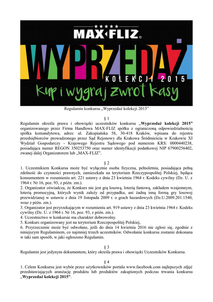 Regulamin konkursu „Wyprzedaż kolekcji 2015” - Max-Fliz