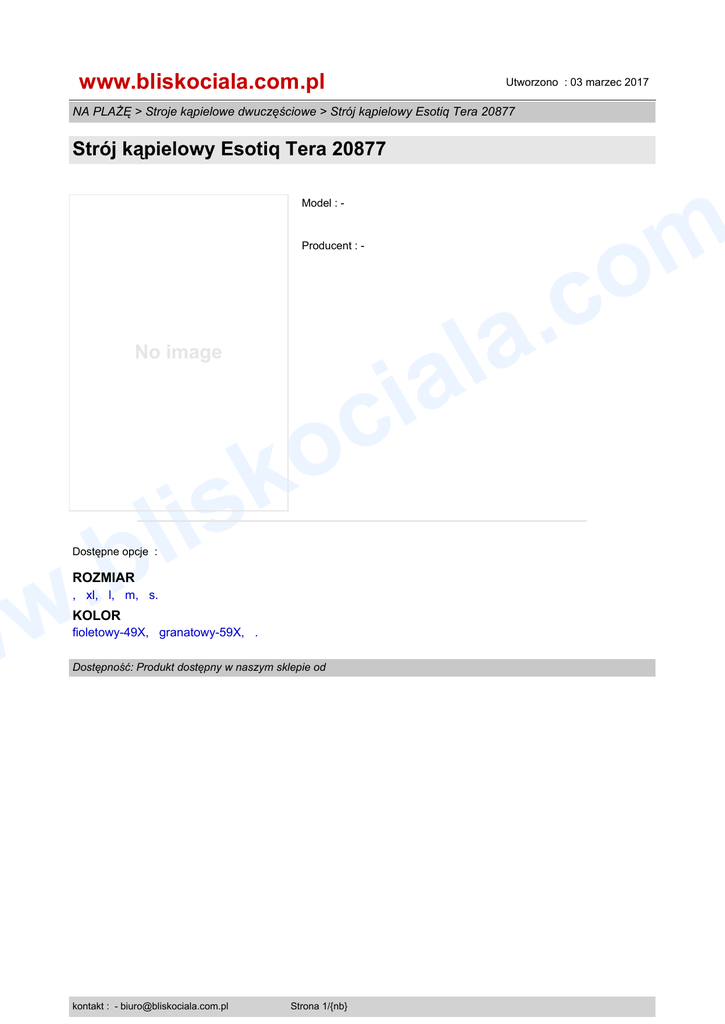 www.bliskociala.com.pl Utworzono : 03 marzec 2017 NA PLAŻĘ > Stroje kąpielowe dwuczęściowe > Strój kąpielowy Esotiq Tera 20877 Strój kąpielowy Esotiq Tera 20877 m o c . a l a Model : - Producent : - No image i c o k il s w b . w Dostępne opcje : ROZMIAR , xl, l, m, s. KOLOR fioletowy-49X, granatowy-59X, . Dostępność: Produkt dostępny w naszym sklepie od kontakt : - [email protected] Strona 1/{nb}