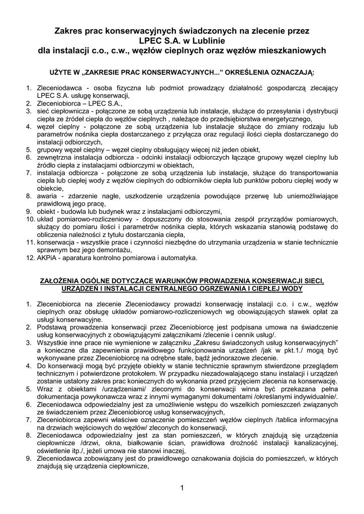 Zakres prac konserwacyjnych świadczonych na zlecenie przez LPEC S.A. w Lublinie dla instalacji c.o., c.w., węzłów cieplnych oraz węzłów mieszkaniowych UŻYTE W „ZAKRESIE PRAC KONSERWACYJNYCH...” OKREŚLENIA OZNACZAJĄ: 1. Zleceniodawca - osoba fizyczna lub podmiot prowadzący działalność gospodarczą zlecający LPEC S.A. usługę konserwacji, 2. Zleceniobiorca – LPEC S.A., 3. sieć ciepłownicza - połączone ze sobą urządzenia lub instalacje, służące do przesyłania i dystrybucji ciepła ze źródeł ciepła do węzłów cieplnych , należące do przedsiębiorstwa energetycznego, 4. węzeł cieplny - połączone ze sobą urządzenia lub instalacje służące do zmiany rodzaju lub parametrów nośnika ciepła dostarczanego z przyłącza oraz regulacji ilości ciepła dostarczanego do instalacji odbiorczych, 5. grupowy węzeł cieplny – węzeł cieplny obsługujący więcej niż jeden obiekt, 6. zewnętrzna instalacja odbiorcza - odcinki instalacji odbiorczych łączące grupowy węzeł cieplny lub źródło ciepła z instalacjami odbiorczymi w obiektach, 7. instalacja odbiorcza - połączone ze sobą urządzenia lub instalacje, służące do transportowania ciepła lub ciepłej wody z węzłów cieplnych do odbiorników ciepła lub punktów poboru ciepłej wody w obiekcie, 8. awaria - zdarzenie nagłe, uszkodzenie urządzenia powodujące przerwę lub uniemożliwiające prawidłową jego pracę, 9. obiekt - budowla lub budynek wraz z instalacjami odbiorczymi, 10. układ pomiarowo-rozliczeniowy - dopuszczony do stosowania zespół przyrządów pomiarowych, służący do pomiaru ilości i parametrów nośnika ciepła, których wskazania stanowią podstawę do obliczenia należności z tytułu dostarczania ciepła, 11. konserwacja - wszystkie prace i czynności niezbędne do utrzymania urządzenia w stanie technicznie sprawnym bez jego demontażu, 12. AKPiA - aparatura kontrolno pomiarowa i automatyka. ZAŁOŻENIA OGÓLNE DOTYCZĄCE WARUNKÓW PROWADZENIA KONSERWACJI SIECI, URZĄDZEŃ I INSTALACJI CENTRALNEGO OGRZEWANIA I CIEPŁEJ WODY 1. Zleceniobiorca na zlecenie Zleceniodawcy prowadzi konserwację instalacji c.o. i c.w., węzłów cieplnych oraz obsługę układów pomiarowo-rozliczeniowych wg obowiązujących stawek opłat za usługi konserwacyjne. 2. Podstawą prowadzenia konserwacji przez Zleceniobiorcę jest podpisana umowa na świadczenie usług konserwacyjnych z obowiązującymi załącznikami /zlecenie i cennik usług/. 3. Wszystkie inne prace nie wymienione w załączniku „Zakresu świadczonych usług konserwacyjnych” a konieczne dla zapewnienia prawidłowego funkcjonowania urządzeń /jak w pkt.1./ mogą być wykonywane przez Zleceniobiorcę na odrębne stałe, bądź jednorazowe zlecenie. 4. Do konserwacji mogą być przyjęte obiekty w stanie technicznie sprawnym stwierdzone przeglądem technicznym i potwierdzone protokołem. W przypadku niezadowalającego stanu instalacji i urządzeń zostanie ustalony zakres prac koniecznych do wykonania przed przyjęciem zlecenia na konserwację. 5. Wraz z obiektami /urządzeniami/ zleconymi do konserwacji winna być przekazana pełna dokumentacja powykonawcza wraz z innymi wymaganymi dokumentami /określanymi indywidualnie/. 6. Zleceniodawca odpowiedzialny jest za umożliwienie wstępu do wszelkich pomieszczeń związanych ze świadczeniem przez Zleceniobiorcę usług konserwacyjnych, 7. Zleceniobiorca zapewni właściwe oznaczenie pomieszczeń węzłów cieplnych /tablica informacyjna na drzwiach wejściowych do węzłów/ zleconych do konserwacji, 8. Zleceniodawca odpowiedzialny jest za stan pomieszczeń, w których znajdują się urządzenia ciepłownicze /drzwi, okna, białkowanie ścian, prawidłowa drożność instalacji kanalizacyjnej, oświetlenie itp./, jeżeli umowa nie stanowi inaczej, 9. Zleceniodawca zobowiązany jest do prawidłowego oznakowania dojścia do pomieszczeń, w których znajdują się urządzenia ciepłownicze, 1 10. Usuwanie awarii nieopisanych w poszczególnych zakresach konserwacyjnych /poniżej/ nie wchodzi w zakres świadczonych usług konserwacyjnych, 11. Zleceniobiorca zobowiązuje się do całodobowego świadczenia usług przez Pogotowie Cieplne. 12. Zleceniobiorca udostępnia Zleceniodawcy poprzez kierowników obwodów dane o ilości i zakresie wykonanych zgłoszeń w ustalonych terminach i formie nie częściej niż raz na kwartał. 13. Zleceniobiorca umożliwia Zleceniodawcy wglądu do bieżących parametrów pracy instalacji c.o. i c.w. oraz jeżeli jest to możliwe udostępni dane archiwalne. 14. Prace konserwacyjne poniżej nie obejmują żadnych prac ogólnobudowlanych, które są obowiązkiem Zleceniodawcy tj, w szczególności przygotowanie miejsca prowadzenia prac (np. rozkucia) oraz prac wykończeniowych (np. zamurowania i doprowadzenie do stanu pierwotnego). 15. Obsługa układów pomiarowo-rozliczeniowych nie oznacza przyjęcia na stan majątkowy Zleceniobiorcy tzn. koszty legalizacji i ewentualnych napraw pokrywa Zleceniodawca. ZAKRES KONSERWACJI INSTALACJI CENTRALNEGO OGRZEWANIA 1. Zapewnienie prawidłowego funkcjonowania instalacji c.o. w oparciu o właściwą regulację parametrów czynnika grzewczego, zgodnie z warunkami uzgodnionymi z Zleceniodawcą, 2. Zatrzymanie oraz ponowne uruchomienie instalacji centralnego ogrzewania związane z prowadzeniem prac konserwacyjnych. 3. Miejscowe udrażnianie pionów, poziomów , i zaworów na instalacji c.o. (udrażnianie rurociągów do 3 mb na m-c dla budynku o powierzchni użytkowej do 5 tys. m2) , 4. Usuwanie wszelkich przecieków na instalacji c.o.: - miejscowa wymiana odcinków rur /do 3 mb/, - wymiana szczeliwa w dławicach zaworów oraz w połączeniach gwintowanych, - wymiana uszczelek w nieszczelnych połączeniach kołnierzowych i w elementach grzejnikowych /grzejniki żeliwne/, - wymiana pojedynczych uszkodzonych elementów grzejnika /z materiałów powierzonych/ jeden grzejnik na miesiąc dla budynku o powierzchn