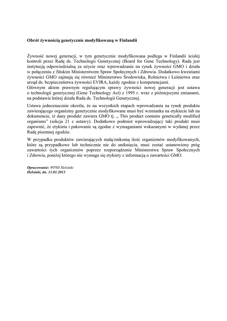 Obrót żywnością genetycznie modyfikowaną w Finlandii Żywność nowej generacji, w tym genetycznie modyfikowana podlega w Finlandii ścisłej kontroli przez Radę ds. Technologii Genetycznej (Board for Gene Technology). Rada jest instytucją odpowiedzialną za użycie oraz wprowadzanie na rynek żywności GMO i działa w połączeniu z fińskim Ministerstwem Spraw Społecznych i Zdrowia. Dodatkowo kwestiami żywności GMO zajmują się również Ministerstwo Środowiska, Rolnictwa i Leśnictwa oraz urząd ds. bezpieczeństwa żywności EVIRA, każdy zgodnie z kompetencjami. Głównym aktem prawnym regulującym sprawy żywności nowej generacji jest ustawa o technologii genetycznej (Gene Technology Act) z 1995 r. wraz z późniejszymi zmianami, na podstawie której działa Rada ds. Technologii Genetycznej. Ustawa jednoznacznie określa, że na wszystkich etapach wprowadzania na rynek produktu zawierającego organizmy genetycznie modyfikowane musi być wzmianka na etykiecie lub na dokumencie, iż dany produkt zawiera GMO tj. „ This product contains genetically modified organisms” (sekcja 21 c ustawy). Dodatkowo podmiot wprowadzający taki produkt musi zapewnić, że etykieta i pakowanie są zgodne z wymaganiami wskazanymi w wydanej przez Radę pisemnej zgodzie. W przypadku produktów zawierających małą/znikomą ilość organizmów modyfikowanych, które są przypadkowe lub technicznie nie do uniknięcia, musi zostać ustanowiony próg zawartości tych organizmów poprzez rozporządzenie Ministerstwa Spraw Społecznych i Zdrowia, poniżej którego nie wymaga się etykiety z informacją o zawartości GMO. Opracowanie: WPHI Helsinki Helsinki, dn. 11.01.2013