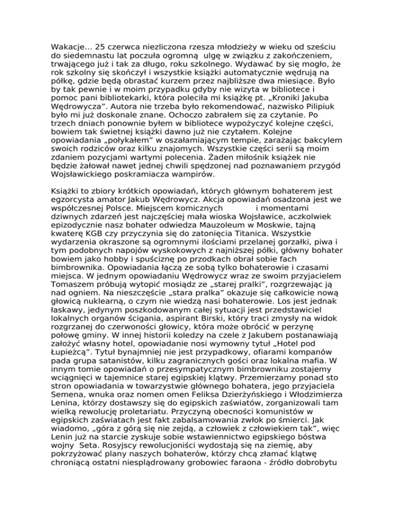 Wakacje… 25 czerwca niezliczona rzesza młodzieży w wieku od sześciu do siedemnastu lat poczuła ogromną ulgę w związku z zakończeniem, trwającego już i tak za długo, roku szkolnego. Wydawać by się mogło, że rok szkolny się skończył i wszystkie książki automatycznie wędrują na półkę, gdzie będą obrastać kurzem przez najbliższe dwa miesiące. Było by tak pewnie i w moim przypadku gdyby nie wizyta w bibliotece i pomoc pani bibliotekarki, która poleciła mi książkę pt. „Kroniki Jakuba Wędrowycza”. Autora nie trzeba było rekomendować, nazwisko Pilipiuk było mi już doskonale znane. Ochoczo zabrałem się za czytanie. Po trzech dniach ponownie byłem w bibliotece wypożyczyć kolejne części, bowiem tak świetnej książki dawno już nie czytałem. Kolejne opowiadania „połykałem” w oszałamiającym tempie, zarażając bakcylem swoich rodziców oraz kilku znajomych. Wszystkie części serii są moim zdaniem pozycjami wartymi polecenia. Żaden miłośnik książek nie będzie żałował nawet jednej chwili spędzonej nad poznawaniem przygód Wojsławickiego poskramiacza wampirów. Książki to zbiory krótkich opowiadań, których głównym bohaterem jest egzorcysta amator Jakub Wędrowycz. Akcja opowiadań osadzona jest we współczesnej Polsce. Miejscem komicznych i momentami dziwnych zdarzeń jest najczęściej mała wioska Wojsławice, aczkolwiek epizodycznie nasz bohater odwiedza Mauzoleum w Moskwie, tajną kwaterę KGB czy przyczynia się do zatonięcia Titanica. Wszystkie wydarzenia okraszone są ogromnymi ilościami przelanej gorzałki, piwa i tym podobnych napojów wyskokowych z najniższej półki, główny bohater bowiem jako hobby i spuściznę po przodkach obrał sobie fach bimbrownika. Opowiadania łączą ze sobą tylko bohaterowie i czasami miejsca. W jednym opowiadaniu Wędrowycz wraz ze swoim przyjacielem Tomaszem próbują wytopić mosiądz ze „starej pralki”, rozgrzewając ją nad ogniem. Na nieszczęście „stara pralka” okazuje się całkowicie nową głowicą nuklearną, o czym nie wiedzą nasi bohaterowie. Los jest jednak łaskawy, jedynym poszkodowanym całej sytuacji jest przedstawiciel lokalnych organów ścigania, aspirant Birski, który traci zmysły na widok rozgrzanej do czerwoności głowicy, która może obrócić w perzynę połowę gminy. W innej historii koledzy na czele z Jakubem postanawiają założyć własny hotel, opowiadanie nosi wymowny tytuł „Hotel pod Łupieżcą”. Tytuł bynajmniej nie jest przypadkowy, ofiarami kompanów pada grupa satanistów, kilku zagranicznych gości oraz lokalna mafia. W innym tomie opowiadań o przesympatycznym bimbrowniku zostajemy wciągnięci w tajemnice starej egipskiej klątwy. Przemierzamy ponad sto stron opowiadania w towarzystwie głównego bohatera, jego przyjaciela Semena, wnuka oraz nomen omen Feliksa Dzierżyńskiego i Włodzimierza Lenina, którzy dostawszy się do egipskich zaświatów, zorganizowali tam wielką rewolucję proletariatu. Przyczyną obecności komunistów w egipskich zaświatach jest fakt zabalsamowania zwłok po śmierci. Jak wiadomo, „góra z górą się nie zejdą, a człowiek z człowiekiem tak”, więc Lenin już na starcie zyskuje sobie wstawiennictwo egipskiego bóstwa wojny Seta. Rosyjscy rewolucjoniści wydostają się na ziemię, aby pokrzyżować plany naszych bohaterów, którzy chcą złamać klątwę chroniącą ostatni niesplądrowany grobowiec faraona - źródło dobrobytu w egipskim raju. Nasi bohaterowie jako środka transportu używają starego radzieckiego sterowca, eliminując po drodze kilka siedlisk wampirów ( z hrabią Draculą na czele ), kilku przedstawicieli włoskiej mafii oraz albańskiego „dresa” ze snajperką. Opowiadania aż kipią groteską, każda historia jest warta przeczytania. Jakub Wędrowycz, jeżeli akurat nie jest zalany w sztos, jest bardzo życzliwym i uczynnym obywatelem. Wypędza duchy, kołkuje wampiry, zabija przeróżne dżiny albo pije, próbując doprowadzić się do stanu nietrzeźwości. Wszystkie opowiadania są bardzo ciekawe, pisane swobodnym językiem, pełne humoru oraz groteski. „Kroniki Jakuba Wędrowycza” były literackim debiutem Andrzeja Pilipiuka. Debiutem na miarę wielkich mistrzów, bowiem książka z miejsca praktycznie stała się bestsellerem oraz zachwyciła czytelników w całej Polsce oraz Czechach. Sam autor był dwukrotnie nominowany do nagrody im. Janusza Zajdla, co tylko świadczy o kunszcie i umiejętnościach. Jakby tego było mało, promocją oraz wydaniem książki zajęła się popularna w dziedzinie fantasty „Fabryka Słów”, co musiało skończyć się sukcesem. Wszystkim miłośnikom groteski polecam książki o przygodach egzorcysty amatora. Ja już zająłem się „polowaniem” na następne części historii oraz inne książki tego utalentowanego polskiego autora. Tomasz Kaczmarek II miejsce