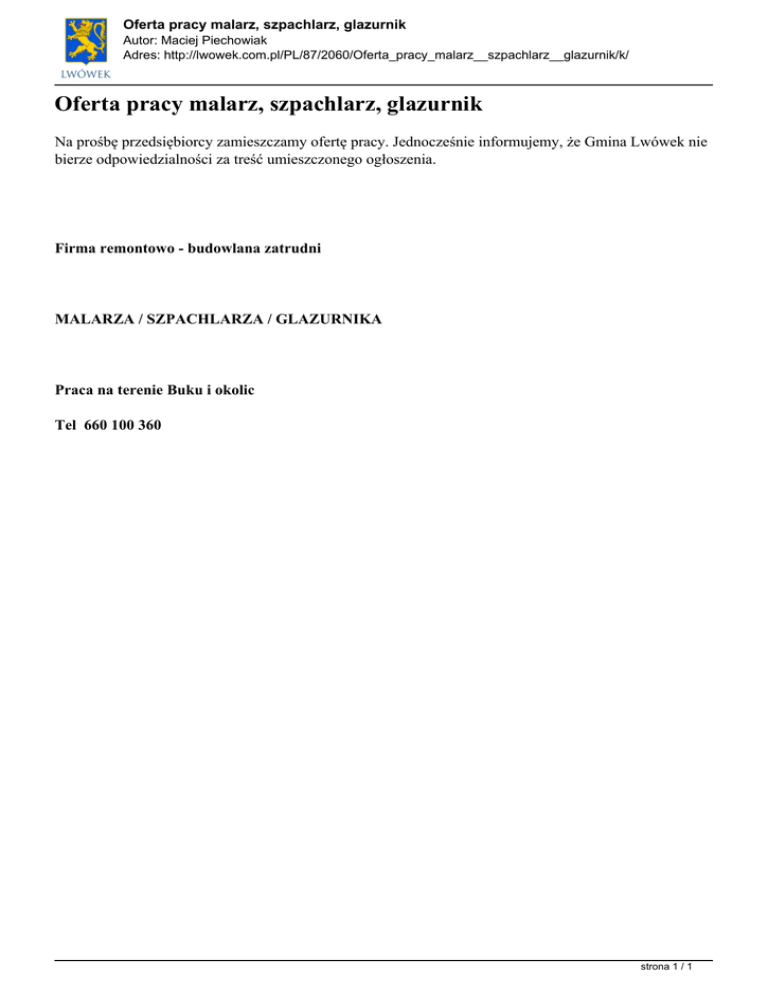 Oferta pracy malarz, szpachlarz, glazurnik Autor: Maciej Piechowiak Adres: http://lwowek.com.pl/PL/87/2060/Oferta_pracy_malarz__szpachlarz__glazurnik/k/ Oferta pracy malarz, szpachlarz, glazurnik Na prośbę przedsiębiorcy zamieszczamy ofertę pracy. Jednocześnie informujemy, że Gmina Lwówek nie bierze odpowiedzialności za treść umieszczonego ogłoszenia. Firma remontowo - budowlana zatrudni MALARZA / SZPACHLARZA / GLAZURNIKA Praca na terenie Buku i okolic Tel 660 100 360 strona 1 / 1 Powered by TCPDF (www.tcpdf.org)