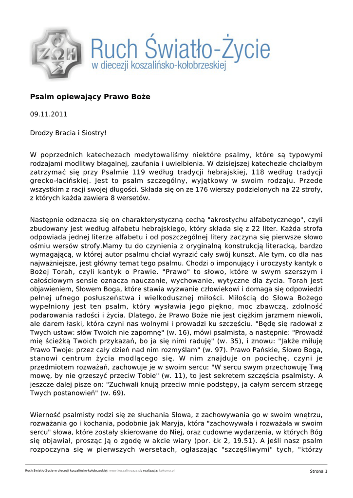 Psalm opiewający Prawo Boże 09.11.2011 Drodzy Bracia i Siostry! W poprzednich katechezach medytowaliśmy niektóre psalmy, które są typowymi rodzajami modlitwy błagalnej, zaufania i uwielbienia. W dzisiejszej katechezie chciałbym zatrzymać się przy Psalmie 119 według tradycji hebrajskiej, 118 według tradycji grecko-łacińskiej. Jest to psalm szczególny, wyjątkowy w swoim rodzaju. Przede wszystkim z racji swojej długości. Składa się on ze 176 wierszy podzielonych na 22 strofy, z których każda zawiera 8 wersetów. Następnie odznacza się on charakterystyczną cechą "akrostychu alfabetycznego", czyli zbudowany jest według alfabetu hebrajskiego, który składa się z 22 liter. Każda strofa odpowiada jednej literze alfabetu i od poszczególnej litery zaczyna się pierwsze słowo ośmiu wersów strofy.Mamy tu do czynienia z oryginalną konstrukcją literacką, bardzo wymagającą, w której autor psalmu chciał wyrazić cały swój kunszt. Ale tym, co dla nas najważniejsze, jest główny temat tego psalmu. Chodzi o imponujący i uroczysty kantyk o Bożej Torah, czyli kantyk o Prawie. "Prawo" to słowo, które w swym szerszym i całościowym sensie oznacza nauczanie, wychowanie, wytyczne dla życia. Torah jest objawieniem, Słowem Boga, które stawia wyzwanie człowiekowi i domaga się odpowiedzi pełnej ufnego posłuszeństwa i wielkodusznej miłości. Miłością do Słowa Bożego wypełniony jest ten psalm, który wysławia jego piękno, moc zbawczą, zdolność podarowania radości i życia. Dlatego, że Prawo Boże nie jest ciężkim jarzmem niewoli, ale darem łaski, która czyni nas wolnymi i prowadzi ku szczęściu. "Będę się radował z Twych ustaw: słów Twoich nie zapomnę" (w. 16), mówi psalmista, a następnie: "Prowadź mię ścieżką Twoich przykazań, bo ja się nimi raduję" (w. 35), i znowu: "Jakże miłuję Prawo Twoje: przez cały dzień nad nim rozmyślam" (w. 97). Prawo Pańskie, Słowo Boga, stanowi centrum życia modlącego się. W nim znajduje on pociechę, czyni je przedmiotem rozważań, zachowuje je w swoim sercu: "W sercu swym przechowuję Twą mowę, by nie grzeszyć przeciw Tobie" (w. 11), to jest sekretem szczęścia psalmisty. A jeszcze dalej pisze on: "Zuchwali knują przeciw mnie podstępy, ja całym sercem strzegę Twych postanowień" (w. 69). Wierność psalmisty rodzi się ze słuchania Słowa, z zachowywania go w swoim wnętrzu, rozważania go i kochania, podobnie jak Maryja, która "zachowywała i rozważała w swoim sercu" słowa, które zostały skierowane do Niej, oraz cudowne wydarzenia, w których Bóg się objawiał, prosząc Ją o zgodę w akcie wiary (por. Łk 2, 19.51). A jeśli nasz psalm rozpoczyna się w pierwszych wersetach, ogłaszając "szczęśliwymi" tych, "którzy Ruch Światło-Życie w diecezji koszalińsko-kołobrzeskiej: www.koszalin.oaza.pl; realizacja: kokoma.pl Strona 1 postępują według Prawa Pańskiego" (w. 1b), i tych "którzy zachowują Jego upomnienia" (w. 2a), to właśnie Dziewica Maryja jest Tą, która jest doskonałą figurą wierzącego opisanego przez psalmistę. To właśnie Ona jest prawdziwie "szczęśliwą", i tak nazwała Ją Elżbieta, ponieważ "uwierzyła, że spełnią się słowa powiedziane Jej od Pana" (Łk 1, 45). To o Niej bowiem i Jej wierze daje świadectwo sam Jezus, kiedy kobiecie, która zawołała: "Błogosławione łono, które Cię nosiło, i piersi, które ssałeś", odpowiada: "Owszem, ale przecież błogosławieni ci, którzy słuchają słowa Bożego i zachowują je" (Łk 11, 27-28). Oczywiście, Maryja jest błogosławiona (szczęśliwa), ponieważ Jej łono nosiło Zbawiciela, ale przede wszystkim dlatego, że przyjęła Bożą zapowiedź i była troskliwą oraz kochającą strażniczką Jego Słowa. Psalm 119 jest zatem jakby całkowicie utkany wokół tego Słowa życia i błogosławieństwa. Chociaż jego głównym tematem jest "Słowo" i "Prawo" Pańskie, to jednak obok tych wyrażeń występują w niemal wszystkich wersetach ich synonimy, takie jak: przykazania, ustawy, polecenia, nauczanie, obietnica, wyroki, a następnie wiele czasowników z nimi związanych, jak: przestrzegać, zachowywać, rozumieć, znać, kochać, rozważać, żyć. Cały alfabet rozwija się przez te 22 strofy psalmu, a także całe słownictwo odnoszące się do ufnej relacji między wierzącym a Bogiem. Znajdziemy tu uwielbienie, dziękczynienie, zaufanie, ale również błaganie i skargę, zawsze przepojone pewnością łaski Bożej i mocy Słowa Bożego. Również wersety naznaczone bólem i ciemnością pozostają otwarte na nadzieję i są przepojone wiarą. "Przylgnęła do prochu moja dusza: Przywróć mi życie według Twego słowa" (w. 25), prosi ufnie psalmista. "Jestem jak bukłak wśród dymu, nie zapomniałem Twych ustaw" (w. 83), jest to jego wołanie jako człowieka wierzącego. Jego wierność, chociaż wystawiona jest na próbę, czerpie swą siłę ze Słowa Pana: "bym mógł dać odpowiedź tym, którzy mnie znieważają, bo polegam na Twoich słowach" (w. 42), mówi stanowczo. Nawet w perspektywie udręki śmierci nakazy Pana są jego punktem odniesienia i jego nadzieją na zwycięstwo: "Niemalże pokonaliby mnie na ziemi; ja zaś nie porzuciłem Twoich postanowień" (w. 87). Prawo Boże, przedmiot żarliwej miłości psalmisty i każdego człowieka wierzącego, jest źródłem życia. Pragnienie zrozumienia go, zachowania, ukierunkowania na nie całej egzystencji jest charakterystyką człowieka sprawiedliwego i wiernego Panu, który "rozmyśla dniem i nocą", jak mówi Psalm 1 (w. 2). Jest ono takim prawem Bożym, które trzeba mieć w sercu, jak mówi dobrze znany tekst z Szema w Księdze Powtórzonego Prawa: "Słuchaj, Izraelu... Te przykazania, które ja ci dziś daję, będziesz miał na swoim sercu. Powiesz je swoim dzieciom i mówić o nich będziesz, gdy są w domu, gdy idziesz drogą, gdy się kładziesz spać i gdy wstajesz" (6, 4.6-7). Centrum egzyste
