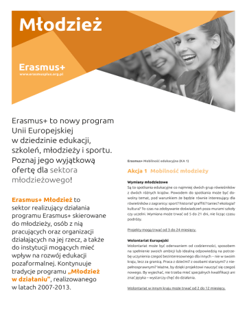 Młodzież Erasmus+ www.erasmusplus.org.pl Erasmus+ to nowy program Unii Europejskiej w dziedzinie edukacji, szkoleń, młodzieży i sportu. Poznaj jego wyjątkową ofertę dla sektora młodzieżowego! Erasmus+ Mobilność edukacyjna (KA 1) Akcja 1 Mobilność młodzieży Wymiany młodzieżowe Są to spotkania edukacyjne co najmniej dwóch grup rówieśników z dwóch różnych krajów. Powodem do spotkania może być do- Erasmus+ Młodzież to sektor realizujący działania programu Erasmus+ skierowane do młodzieży, osób z nią pracujących oraz organizacji działających na jej rzecz, a także do instytucji mogących mieć wpływ na rozwój edukacji pozaformalnej. Kontynuuje tradycje programu „Młodzież w działaniu”, realizowanego w latach 2007-2013. wolny temat, pod warunkiem że będzie równie interesujący dla rówieśników z zagranicy: sport? historia? graffiti? taniec? ekologia? kultura? To czas na zdobywanie doświadczeń poza murami szkoły czy uczelni. Wymiana może trwać od 5 do 21 dni, nie licząc czasu podróży. Projekty mogą trwać od 3 do 24 miesięcy. Wolontariat Europejski Wolontariat może być oderwaniem od codzienności, sposobem na spełnienie swoich ambicji lub idealną odpowiedzią na potrzebę uczynienia czegoś bezinteresownego dla innych – nie w swoim kraju, lecz za granicą. Praca z dziećmi? z osobami starszymi? z niepełnosprawnymi? Ważne, by dzięki projektowi nauczyć się czegoś nowego. By wyjechać, nie trzeba mieć specjalnych kwalifikacji ani znać języka – wystarczy chęć do działania. Wolontariat w innym kraju może trwać od 2 do 12 miesięcy. Erasmus+ Współpraca na rzecz innowacji i dobrych praktyk (KA 2) Erasmus+ Współpraca na rzecz innowacji i dobrych praktyk (KA 2) Akcja 2 Partnerstwa strategiczne Akcja 2 Międzynarodowe inicjatywy młodzieżowe Partnerstwo strategiczne to przemyślana, międzynarodowa To projekty realizowane z myślą o społecznościach lokalnych, współpraca organizacji i instytucji zajmujących się młodzieżą i edu- przygotowane, realizowane i koordynowane przez grupy młodych kacją pozaformalną. Jej celem jest realny, długofalowy wpływ na ludzi z minimum dwóch różnych krajów. sposób i metody pracy z młodzieżą, dzięki której młodzi zyskają większe kompetencje i będą łatwiej odnajdywać się w dorosłym Działania wspierane w ramach programu świecie. To także szansa na rozwój organizacji lub instytucji pracu- Grupy partnerskie w swoich krajach w tym samym czasie realizują jących z młodzieżą i zajmujących się edukacją pozaformalną. działania lokalne o tej samej tematyce, pozostając ze sobą w kontakcie i wymieniając się na bieżąco doświadczeniami. Część działań Działania wspierane w ramach programu może być również realizowana wspólnie w kraju/krajach partne- Współpraca międzynarodowa w celu: wymiany doświadczeń, sto- rów. Taki projekt umożliwia młodym ludziom dzielenie się swoimi sowanych rozwiązań, poznania nowych metod pracy, stworzenia doświadczeniami i umiejętnościami, a także aktywne włączenie programu czy narzędzia do pracy z młodzieżą. Projekt powinien się w życie swoich społeczności. przynieść wymierny efekt, zmianę w miejscu, gdzie żyje, działa i uczy się młody człowiek. Po projekcie musi pozostać coś trwałe- Projekty trwają od 6 do 24 miesięcy. go, coś z czego będą mogły korzystać inne organizacje czy instytucje, np.: program, metoda, scenariusz zajęć, portal, aplikacja czy Kto może uczestniczyć w projekcie? raport. W Projektach strategicznych akcji 2 Erasmus+ Młodzież mogą uczestniczyć organizacje lub instytucje edukacyjne i pracujące z młodzieżą; instruktorzy, wychowawcy, pedagodzy, wolontariusze, Erasmus+ Mobilność edukacyjna (KA 1) Akcja 1 Mobilność osób pracujących z młodzieżą Ta akcja umożliwia rozwój umiejętności i podniesienie kwalifikacji osób, które pracują z młodzieżą. Daje też możliwość wymiany doświadczeń pomiędzy organizacjami i instytucjami, które zajmują się młodzieżą w czasie wolnym od nauki. W ramach programu można uzyskać wsparcie na organizację szkoleń, wizyt studyjnych, seminariów, spotkań oraz staży (trwających od dwóch dni do dwóch miesięcy, z wyłączeniem czasu podróży). Projekty mogą trwać od 3 do 24 miesięcy. Kto może uczestniczyć w projekcie? W Wymianach młodzieżowych: młodzież w wieku 13-30 lat z co najmniej dwóch państw, z których przynajmniej jedno jest krajem biorącym udział w programie. Minimalna liczba uczestników projektu wynosi 16 osób, maksymalna – 60. W Wolontariacie Europejskim: osoby w wieku od 17 do 30 lat. W Mobilności osób pracujących z młodzieżą: osoby pracujące z młodzieżą i działające na jej rzecz (nie ma limitu wieku): instruktorzy, wychowawcy, pedagodzy, wolontariusze, liderzy nieformalnych grup i inicjatyw, opiekunowie świetlic itd. Projekt może być zrealizowany przy udziale minimum 2 instytucji z 2 różnych krajów a udział może wziąć maksymalnie 50 osób. liderzy nieformalnych grup i inicjatyw, opiekunowie świetlic itd.; W Międzynarodowych inicjatywach młodzieżowych może uczestniczyć młodzież w wieku 13-30 lat. Erasmus+ Wsparcie reform w edukacji (KA 3) Akcja 3 Rozwój polityki młodzieżowej Akcja ta ma ułatwiać dialog i budowanie relacji pomiędzy młodymi ludźmi a instytucjami oraz osobami odpowiedzialnymi za politykę dotyczącą młodzieży (np. w obszarze sportu, edukacji i kultury). Działania wspierane w ramach programu Podstawą działań tego sektora jest edukacja pozaformalna, czyli to, czego uczy się młody człowiek w czasie wolnym od obowiązkowej nauki. Akcja 3 programu Erasmus+ Młodzież to między innymi: spotkania, debaty, seminaria, konsultacje oraz warsztaty podejmujące temat polityki i działań realizowanych przez instytucje publiczne Unii Europejskiej wobec młodzieży. Akcja wspiera ponadto działania rozwijające 