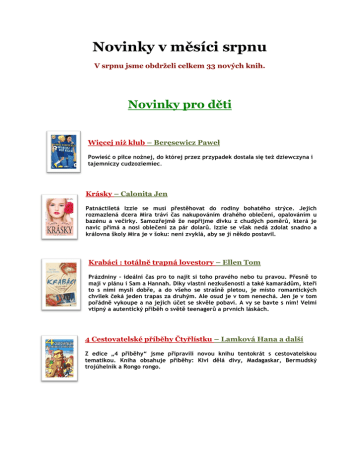 Novinky v měsíci srpnu V srpnu jsme obdrželi celkem 33 nových knih. Novinky pro děti Więcej niż klub – Beręsewicz Paweł Powieść o piłce nożnej, do której przez przypadek dostała się też dziewczyna i tajemniczy cudzoziemiec. Krásky – Calonita Jen Patnáctiletá Izzie se musí přestěhovat do rodiny bohatého strýce. Jejich rozmazlená dcera Mira tráví čas nakupováním drahého oblečení, opalováním u bazénu a večírky. Samozřejmě že nepřijme dívku z chudých poměrů, která je navíc přímá a nosí oblečení za pár dolarů. Izzie se však nedá zdolat snadno a královna školy Mira je v šoku: není zvyklá, aby se jí někdo postavil. Krabáci : totálně trapná lovestory – Ellen Tom Prázdniny – ideální čas pro to najít si toho pravého nebo tu pravou. Přesně to mají v plánu i Sam a Hannah. Díky vlastní nezkušenosti a také kamarádům, kteří to s nimi myslí dobře, a do všeho se strašně pletou, je místo romantických chvilek čeká jeden trapas za druhým. Ale osud je v tom nenechá. Jen je v tom pořádně vykoupe a na jejich účet se skvěle pobaví. A vy se bavte s ním! Velmi vtipný a autentický příběh o světě teenagerů a prvních láskách. 4 Cestovatelské příběhy Čtyřlístku – Lamková Hana a další Z edice „4 příběhy“ jsme připravili novou knihu tentokrát s cestovatelskou tematikou. Kniha obsahuje příběhy: Kivi dělá divy, Madagaskar, Bermudský trojúhelník a Rongo rongo. Party holka @ Tajnosti v dívčí škole – Reid Carmen Dívky čekají zkoušky, a proto není divu, že by se rády odreagovaly na večírku. Ginin nový přítel je možná vynikající tanečník, ale je opravdu tak hodný, jak se zdá? Amy chce najít svoji matku, ale obává se toho, co by mohla zjistit. Jak zvládne Niffy romantický vztah, který začíná být příliš žhavý? A pokud jde o vzornou Min, kamarádky ji snad budou muset odtáhnout ze studovny i přes její odpor. Filipek i szkoła – Strękowska-Zaremba Małgorzata Filipek i jego nieodłączni koledzy z osiedla idą do szkoły. Nowa sytuacja stwarza wiele możliwości. Psocąc i dokazując, każdego dnia poznają życie na własną rękę. Filipek i dziewczyny – Strękowska-Zaremba Małgorzata Filipek, niepoprawny optimista i łobuziak, dowiaduje się, że będzie miał rodzeństwo. Brata powitałby z szeroko otwartymi rakonami, ale co jeśli to będzie … siostra? Przecież każdy szanujący się chłopak wie, że z dziewczynami nie da się normalnie wytrzymać! Zacałują na śmierć, wygadają rodzicom każdą tajemnicę, zamęczą swoim babskimi sprawami. A jak się człowiek – nie daj Boże! – zakocha w takiej jednej – to już amen w pacierzu! Król – Ryrych Katarzyna Patryk po bankructwie firmy ojca i utracie domu ląduje z dnia na dzień w lokalu zastępczym w odrapanym dwupiętrowym bloku. W przeciwieństwie do matki szybko przystosowuje się do życia w „Brooklynie”, jak nazywają blok osiedlowe dzieciaki. Zapomina o dawnym życiu – o jego dobrych stronach, luksusach i znajomych, którzy wraz z tym wszystkim zniknęli. Podczas wakacji na szarym, betonowym podwórku Patryk poznaje Celestyna – bezdomnego mężczyznę, który staje się jego mentorem, od którego uczy się, jak przetrwać. O Stephenie Hawkingu … – Ryrych Katarzyna Piotrek dotąd był po prostu Bratkiem, młodszym bratem swojego brata. To Stefan, unieruchomiony w łóżku przez tajemniczą chorobę, nauczył go wszystkiego, odkrył przed nim świat. Ale teraz coś się zmienia. Bratek zaczyna mieć tajemnice, własne bójki w szkole i przyjaciół. Już nie jest Bratkiem - staje się Piotrkiem. Kimś ważnym, samodzielnie myślącym, niezależnym od mamy i brata. Zadziwiająca jest ta zmiana i…. naprawdę wspaniała! Która to Malala? – Piątkowska Renata Roześmiana, skora do zabawy i śpiewania hitów Justina Biebera – właśnie taką Malalę poznajemy. Jedyne, co wyróżnia dziewczynę spośród przyjaciółek, to to, że nie zasłania twarzy chustą. Ale czy to wystarczający powód, by strzelić nastolatce w twarz? Szybko okazuje się, że Malala to nie zwykła nastolatka, a blogerka, która – opisując sytuację dziewcząt w pakistańskim szkolnictwie – naraziła się talibom. Wzruszająca opowieść o sile, która drzemie w każdym z nas, o tym, że warto walczyć i pomagać słabszym. Novinky pro dospělé Mrtvola v brnění – Bauer Jan Je říjen roku 1306. Na oslavu zvolení nového českého krále Rudolfa Habsburského se na rynku Většího Města pražského koná rytířský turnaj. Jako první se mají utkat přítel a oblíbenec nového krále, pěvec rytířských písní Hartmann z Kuenringu s českým šlechticem Čeňkem z Lipé. K všeobecnému překvapení stačí Čeňkovi lehký úder dřevcem, aby Hartmann spadl ze sedla do prachu kolbiště. K údivu všech přivolaný ranhojič zjišťuje, že je dočista mrtvý. Co horšího, někdo ho předem zabil a do klání mezi šraňky poslal na koni mrtvolu v brnění. Nalehko – Bensenová Clara Svérázná americká dvojice vyráží na neuvěřitelnou cestu. Jednadvacet dní, osm zemí, skoro pět tisíc kilometrů. Žádné plány, žádné hotely a žádná zavazadla. A žádné šaty na převlečení. On má jen to, co se mu vejde do kapes, ona si bere kabelku. Ona je Clara, životní krizí trochu pošramocená mladá dáma, on je Jeff, profesor, který si libuje v šílených oděvech. Poznali se na internetové seznamce. A pak si šli koupit letenku. Když se pak vracejí, ve stejných šatech, v jakých vyjeli, vezou si domů něco víc než suvenýry. Naději. Nebo dokonce lásku? Cizinec z Cornwallu – Fenwick Liz Román o tajemství, jehož odhalení šokuje celý svět! Když je její samotářská babička již neschopná se o sebe postarat, odstěhuje se Gabriella do daleké chaty ve Frenchmen's Creek, která byla babiččiným domovem po celá