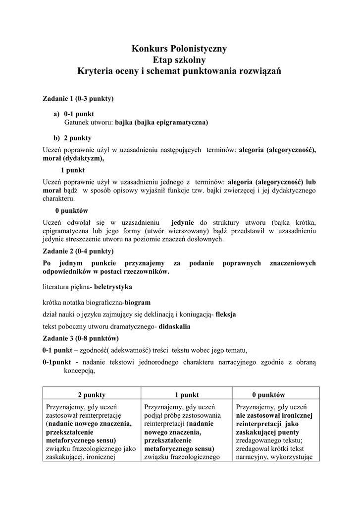 Konkurs Polonistyczny Etap szkolny Kryteria oceny i schemat