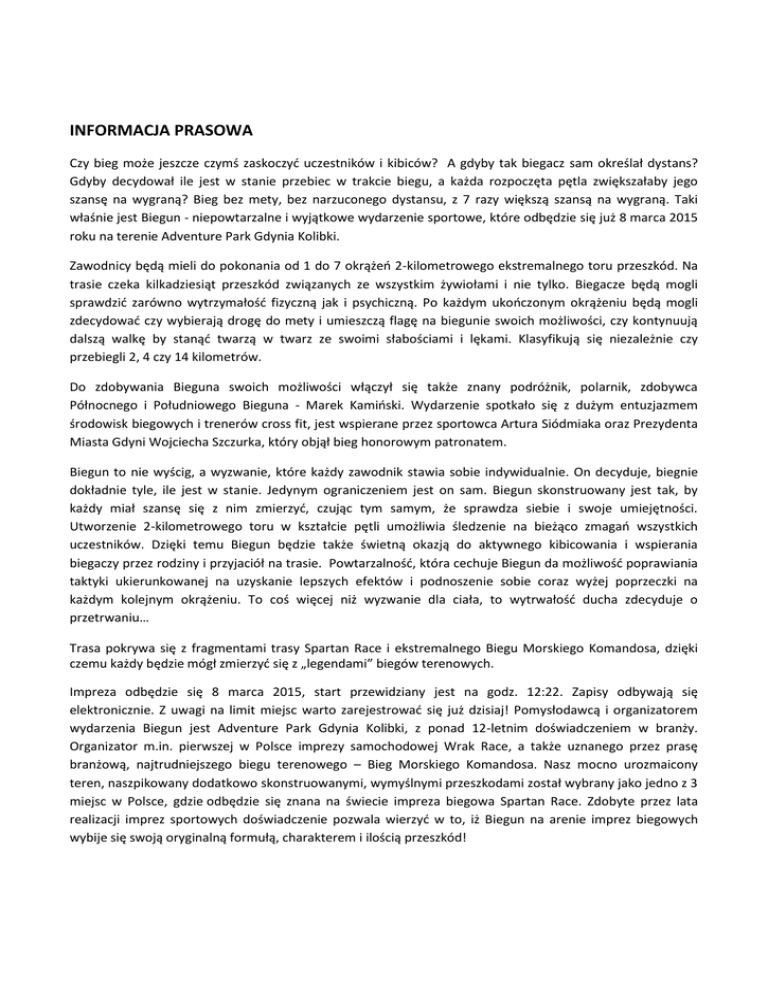 INFORMACJA PRASOWA Czy bieg może jeszcze czymś zaskoczyć uczestników i kibiców? A gdyby tak biegacz sam określał dystans? Gdyby decydował ile jest w stanie przebiec w trakcie biegu, a każda rozpoczęta pętla zwiększałaby jego szansę na wygraną? Bieg bez mety, bez narzuconego dystansu, z 7 razy większą szansą na wygraną. Taki właśnie jest Biegun - niepowtarzalne i wyjątkowe wydarzenie sportowe, które odbędzie się już 8 marca 2015 roku na terenie Adventure Park Gdynia Kolibki. Zawodnicy będą mieli do pokonania od 1 do 7 okrążeń 2-kilometrowego ekstremalnego toru przeszkód. Na trasie czeka kilkadziesiąt przeszkód związanych ze wszystkim żywiołami i nie tylko. Biegacze będą mogli sprawdzić zarówno wytrzymałość fizyczną jak i psychiczną. Po każdym ukończonym okrążeniu będą mogli zdecydować czy wybierają drogę do mety i umieszczą flagę na biegunie swoich możliwości, czy kontynuują dalszą walkę by stanąć twarzą w twarz ze swoimi słabościami i lękami. Klasyfikują się niezależnie czy przebiegli 2, 4 czy 14 kilometrów. Do zdobywania Bieguna swoich możliwości włączył się także znany podróżnik, polarnik, zdobywca Północnego i Południowego Bieguna - Marek Kamiński. Wydarzenie spotkało się z dużym entuzjazmem środowisk biegowych i trenerów cross fit, jest wspierane przez sportowca Artura Siódmiaka oraz Prezydenta Miasta Gdyni Wojciecha Szczurka, który objął bieg honorowym patronatem. Biegun to nie wyścig, a wyzwanie, które każdy zawodnik stawia sobie indywidualnie. On decyduje, biegnie dokładnie tyle, ile jest w stanie. Jedynym ograniczeniem jest on sam. Biegun skonstruowany jest tak, by każdy miał szansę się z nim zmierzyć, czując tym samym, że sprawdza siebie i swoje umiejętności. Utworzenie 2-kilometrowego toru w kształcie pętli umożliwia śledzenie na bieżąco zmagań wszystkich uczestników. Dzięki temu Biegun będzie także świetną okazją do aktywnego kibicowania i wspierania biegaczy przez rodziny i przyjaciół na trasie. Powtarzalność, która cechuje Biegun da możliwość poprawiania taktyki ukierunkowanej na uzyskanie lepszych efektów i podnoszenie sobie coraz wyżej poprzeczki na każdym kolejnym okrążeniu. To coś więcej niż wyzwanie dla ciała, to wytrwałość ducha zdecyduje o przetrwaniu… Trasa pokrywa się z fragmentami trasy Spartan Race i ekstremalnego Biegu Morskiego Komandosa, dzięki czemu każdy będzie mógł zmierzyć się z „legendami” biegów terenowych. Impreza odbędzie się 8 marca 2015, start przewidziany jest na godz. 12:22. Zapisy odbywają się elektronicznie. Z uwagi na limit miejsc warto zarejestrować się już dzisiaj! Pomysłodawcą i organizatorem wydarzenia Biegun jest Adventure Park Gdynia Kolibki, z ponad 12-letnim doświadczeniem w branży. Organizator m.in. pierwszej w Polsce imprezy samochodowej Wrak Race, a także uznanego przez prasę branżową, najtrudniejszego biegu terenowego – Bieg Morskiego Komandosa. Nasz mocno urozmaicony teren, naszpikowany dodatkowo skonstruowanymi, wymyślnymi przeszkodami został wybrany jako jedno z 3 miejsc w Polsce, gdzie odbędzie się znana na świecie impreza biegowa Spartan Race. Zdobyte przez lata realizacji imprez sportowych doświadczenie pozwala wierzyć w to, iż Biegun na arenie imprez biegowych wybije się swoją oryginalną formułą, charakterem i ilością przeszkód! Adventure Park Gdynia Kolibki 81-553 Gdynia, ul. Bernadowska 1; tel. 600 263 500, [email protected] www.adventurepark.pl