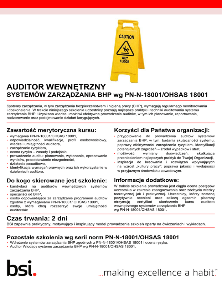 AUDITOR WEWNĘTRZNY SYSTEMÓW ZARZĄDZANIA BHP wg PN-N-18001/OHSAS 18001 Systemy zarządzania, w tym zarządzania bezpieczeństwem i higieną pracy (BHP), wymagają regularnego monitorowania i doskonalenia. W trakcie niniejszego szkolenia uczestnicy poznają najlepsze praktyki i techniki auditowania systemu zarządzania BHP. Uzyskana wiedza umożliwi efektywne prowadzenie auditów, w tym ich planowanie, raportowanie, nadzorowanie oraz podejmowanie działań korygujących. Zawartość merytoryczna kursu: Korzyści dla Państwa organizacji: • wymagania PN-N-18001/OHSAS 18001, • odpowiedzialność, kwalifikacje, profil osobowościowy, • przygotowanie wiedza i umiejętności auditora, • zarządzanie ryzykiem, • ocena ryzyka – zasady i podejście, • prowadzenie auditu: planowanie, wykonanie, opracowanie wyników, przedstawienie niezgodności, • działania poauditowe, • identyfikacja wymagań prawnych oraz ich wykorzystanie w działaniach auditora, do prowadzenia auditów systemów zarządzania BHP, w tym: badania skuteczności systemu, poprawy efektywności zarządzania ryzykiem, identyfikacji potencjalnych zagrożeń – źródeł wypadków i strat, • możliwość wymiany doświadczeń, skutkująca przeniesieniem najlepszych praktyk do Twojej Organizacji, • inspiracja do kreowania i rozwiązań wpływających na wzrost „kultury pracy”: poprawa jakości i wydajności w przyjaznym środowisku zawodowym . Do kogo skierowane jest szkolenie: Informacje dodatkowe: na auditorów wewnętrznych systemów zarządzania BHP, • specjaliści od BHP, • osoby odpowiadające za zarządzanie programem auditów zgodnie z wymaganiami PN-N-18001/ OHSAS 18001, • osoby, które chcą rozszerzyć swoje umiejętności auditorskie. W trakcie szkolenia prowadzona jest ciągła ocena postępów uczestnika w zakresie zaangażowania oraz zdobycia wiedzy teoretycznej jak i praktycznej. Uczestnicy, którzy zostaną pozytywnie ocenieni oraz zaliczą egzamin pisemny otrzymują certyfikat ukończenia kursu auditora wewnętrznego systemów zarządzania BHP wg PN-N-18001/OHSAS 18001. • kandydaci Czas trwania: 2 dni BSI zapewnia praktyczny, motywujący i inspirujący model prowadzenia szkoleń oparty na ćwiczeniach i wykładach . Pozostałe szkolenia wg serii norm PN-N-18001/OHSAS 18001 • Wdrożenie systemów zarządzania BHP zgodnych z PN-N-18001/OHSAS 18001 i ocena ryzyka. • Auditor Wiodący systemu zarządzania BHP wg PN-N-18001/OHSAS 18001. SYSTEM ZARZĄDZANIA BHP wg PN-N-18001/OHSAS 18001 Chroń swoich pracowników i reputację z OHSAS 18001. Pewność, że zdrowie i bezpieczeństwo pracowników w miejscu pracy powinno być priorytetem każdej odpowiedzialnej organizacji. Nasze doświadczenie stawia nas w odpowiedniej pozycji do opracowywania rozwoju systemu bezpieczeństwa i higieny pracy, które pomoże Państwu zredukować ryzyko, przy jednoczesnej ochronie siły roboczej, reputacji i marki. Każdego roku, miliony pracowników globalnie doznaje urazów, lub traci życie. Aby redukować ryzyko występowania tych incydentów, organizacje wszystkich rozmiarów i sektorów powinny wdrożyć wydajny system zarządzania. OHSAS 18001 jest odpowiedni dla organizacji, które chcą spełnić wymagania i procedury prawne dotyczące zarządzania bezpieczeństwem i higieną pracy. Przyjmując postawę identyfikacji ryzyka w dokumentacji, będziesz w stanie zdecydować, czego potrzebuje Twoja organizacja. Klienci BSI, którzy uzyskali certyfikację OHSAS 18001, raportują największe korzyści w obszarach: