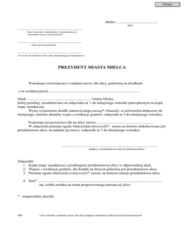 Drukuj Mielec ............................................. /data/ ...................................................................... /imię i nazwisko wnioskodawcy /wnioskodawców/ ewentualnie nazwa osoby prawnej*/ ..................................................................... /adres do korespondencji/ ..................................................................... /nr tel. do wnioskodawcy lub osoby reprezentującej wnioskodawcę/ PREZYDENT MIASTA MIELCA Wnioskuję (wnioskujemy) o nadanie nazwy dla ulicy, położonej na działkach o nr ewidencyjnych: ..............................................................................................., obręb - ................................................................... Gmina Mielec, której przebieg przedstawiono na załączniku nr 1 do niniejszego wniosku sporządzonym na kopii mapy zasadniczej. Wyżej wymienione działki stanowią moją (naszą)* własność, co potwierdza dołączony do niniejszego wniosku aktualny wypis z ewidencji gruntów /załącznik nr 2 do niniejszego wniosku/. Proponuję (proponujemy) dla tej ulicy nazwę: ............................................................ . W załączeniu pisemna zgoda właściciela(właścicieli)*, terenu na którym zlokalizowana jest przedmiotowa ulica, na nadanie jej nazwy /załącznik nr 3 do niniejszego wniosku/. ........................................................................................................ /podpisy wnioskodawców lub ich pełnomocników/ Załączniki: 1. Kopia mapy zasadniczej z przebiegiem przedmiotowej ulicy w odpowiedniej skali, 2. Wypisy z ewidencji gruntów, dla działek na których położona jest przedmiotowa ulica, 3. Pisemna zgoda właściciela (właścicieli)*, terenu, na którym istnieje przedmiotowa ulica. 4. Inne* ...................................................................................................................................... /np. krótka notatka na temat proponowanego patrona tej ulicy/ * - niepotrzebne skreślić. MW wzór wniosku o nadanie nazwy dla ulicy będącej własnością osób fizycznych lub prawnych