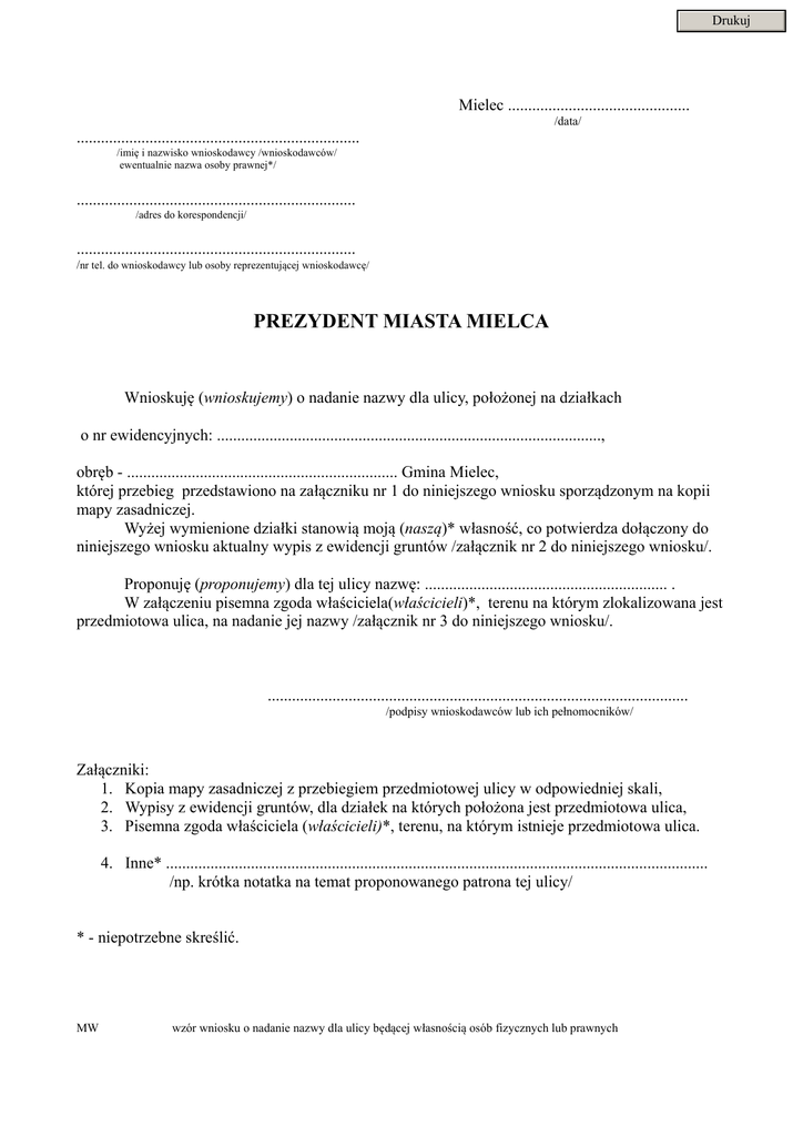 wzór wniosku o nadanie nazwy ulicy będącej własnością osób