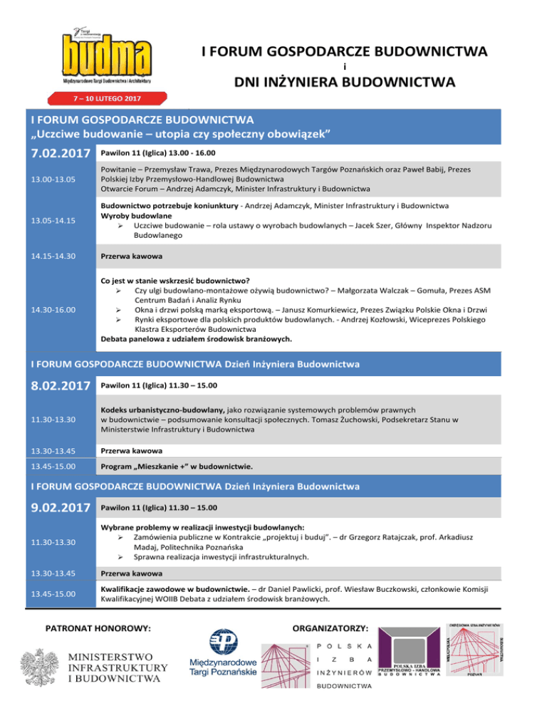 I FORUM GOSPODARCZE BUDOWNICTWA i DNI INŻYNIERA BUDOWNICTWA I FORUM GOSPODARCZE BUDOWNICTWA „Uczciwe budowanie – utopia czy społeczny obowiązek” 7.02.2017 Pawilon 11 (Iglica) 13.00 - 16.00 13.00-13.05 Powitanie – Przemysław Trawa, Prezes Międzynarodowych Targów Poznańskich oraz Paweł Babij, Prezes Polskiej Izby Przemysłowo-Handlowej Budownictwa Otwarcie Forum – Andrzej Adamczyk, Minister Infrastruktury i Budownictwa 13.05-14.15 Budownictwo potrzebuje koniunktury - Andrzej Adamczyk, Minister Infrastruktury i Budownictwa Wyroby budowlane Uczciwe budowanie – rola ustawy o wyrobach budowlanych – Jacek Szer, Główny Inspektor Nadzoru Budowlanego 14.15-14.30 Przerwa kawowa 14.30-16.00 Co jest w stanie wskrzesić budownictwo? Czy ulgi budowlano-montażowe ożywią budownictwo? – Małgorzata Walczak – Gomuła, Prezes ASM Centrum Badań i Analiz Rynku Okna i drzwi polską marką eksportową. – Janusz Komurkiewicz, Prezes Związku Polskie Okna i Drzwi Rynki eksportowe dla polskich produktów budowlanych. - Andrzej Kozłowski, Wiceprezes Polskiego Klastra Eksporterów Budownictwa Debata panelowa z udziałem środowisk branżowych. I FORUM GOSPODARCZE BUDOWNICTWA Dzień Inżyniera Budownictwa 8.02.2017 Pawilon 11 (Iglica) 11.30 – 15.00 11.30-13.30 Kodeks urbanistyczno-budowlany, jako rozwiązanie systemowych problemów prawnych w budownictwie – podsumowanie konsultacji społecznych. Tomasz Żuchowski, Podsekretarz Stanu w Ministerstwie Infrastruktury i Budownictwa 13.30-13.45 Przerwa kawowa 13.45-15.00 Program „Mieszkanie +” w budownictwie. I FORUM GOSPODARCZE BUDOWNICTWA Dzień Inżyniera Budownictwa 9.02.2017 Pawilon 11 (Iglica) 11.30 – 15.00 11.30-13.30 Wybrane problemy w realizacji inwestycji budowlanych: Zamówienia publiczne w Kontrakcie „projektuj i buduj”. – dr Grzegorz Ratajczak, prof. Arkadiusz Madaj, Politechnika Poznańska Sprawna realizacja inwestycji infrastrukturalnych. 13.30-13.45 Przerwa kawowa 13.45-15.00 Kwalifikacje zawodowe w budownictwie. – dr Daniel Pawlicki, prof. Wiesław Buczkowski, członkowie Komisji Kwalifikacyjnej WOIIB Debata z udziałem środowisk branżowych. PATRONAT HONOROWY: ORGANIZATORZY:
