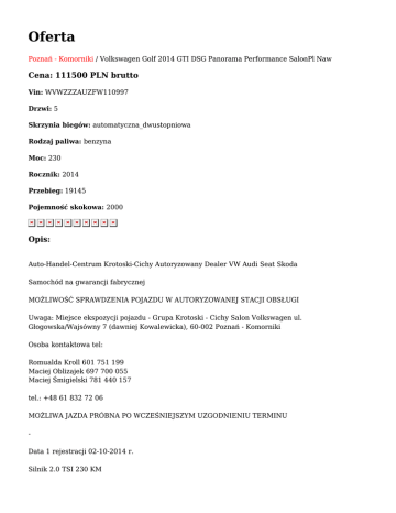Oferta Poznań - Komorniki / Volkswagen Golf 2014 GTI DSG Panorama Performance SalonPl Naw Cena: 111500 PLN brutto Vin: WVWZZZAUZFW110997 Drzwi: 5 Skrzynia biegów: automatyczna_dwustopniowa Rodzaj paliwa: benzyna Moc: 230 Rocznik: 2014 Przebieg: 19145 Pojemność skokowa: 2000 Opis: Auto-Handel-Centrum Krotoski-Cichy Autoryzowany Dealer VW Audi Seat Skoda Samochód na gwarancji fabrycznej MOŻLIWOŚĆ SPRAWDZENIA POJAZDU W AUTORYZOWANEJ STACJI OBSŁUGI Uwaga: Miejsce ekspozycji pojazdu - Grupa Krotoski - Cichy Salon Volkswagen ul. Głogowska/Wajsówny 7 (dawniej Kowalewicka), 60-002 Poznań - Komorniki Osoba kontaktowa tel: Romualda Kroll 601 751 199 Maciej Oblizajek 697 700 055 Maciej Śmigielski 781 440 157 tel.: +48 61 832 72 06 MOŻLIWA JAZDA PRÓBNA PO WCZEŚNIEJSZYM UZGODNIENIU TERMINU Data 1 rejestracji 02-10-2014 r. Silnik 2.0 TSI 230 KM Skrzynia automatyczna DSG 6-biegowa Cena katalogowa samochodu nowego: 153 940 zł! Wersja wyposażenia: GTI Wyposażenie dodatkowe obejmuje: System bezkluczykowego dostępu i uruchamiania pojazdu Keyless Access Dodatkowo przyciemniane szyby boczne i szyba tylna Aktywny system ochrony pasażerów "PreCrash" System dźwięku - "Dynaudio Excite" sound system (400 Watt) Instalacja telefonu Premium Kamera cofania "Rear Assist" Adaptacyjna regulacja zawieszenia "DCC" Klimatyzacja "Climatronic" 4 obręcze ze stopu metali lekkich "Austin" 7J x 18 Pakiet "Czujnik deszczu" /automatycznie przyciemniane lusterko wsteczne Panoramiczny, szklany dach Reflektory bi-ksenonowe ze światłami do jazdy dziennej w technologii LED Autoalarm z niezależnym zasilaniem (Back-up-Horn), funkcją dozoru wnętrza i czujni-kiem przechyłu Czujniki parkowania z przodu i z tyłu z wizualizacją na ekranie radia Pakiet "Zimowy" - podgrzewane przednie siedzenia, spryskiwacze reflektorów, podgrze-wane dysze spryskiwaczy szyby przedniej System nawigacji satelitarnej "Discover Pro" Podana cena brutto - wystawiamy fakturę VAT 23% Dla Firm możliwość odliczenia podatku VAT Oferujemy kompleksową obsługę sprzedaży ratalnej na bardzo dogodnych warunkach - w celu bliższego zapoznania się z aktualną ofertą finansowania prosimy o kontakt : Maciej Oblizajek 697-700-055. Oferujemy ubezpieczenia samochodowe z wiodących na rynku ubezpieczalni - możliwość zakupu pakietu ubezpieczeniowego na miejscu. Oferujemy możliwość jazdy próbnej przed zakupem oraz usługę inspekcji pojazdu w autoryzowanym serwisie Skoda. Przyjmujemy również w rozliczeniu każdy pojazd. Godziny otwarcia: pon - pt 9.00 - 19.00 sob 9.00 - 14.00 Uwaga: Miejsce ekspozycji pojazdu - Grupa Krotoski - Cichy Salon Volkswagen ul. Głogowska/Wajsówny 7 (dawniej Kowalewicka), 60-002 Poznań - Komorniki Osoba kontaktowa tel: Romualda Kroll 601 751 199 Maciej Oblizajek 697 700 055 Maciej Śmigielski 781 440 157 tel.: +48 61 832 72 06 Ogłoszenie ma charakter informacyjny i stanowi zaproszenie do zawarcia umowy (art. 71 Kodeksu cywilnego); nie stanowi natomiast oferty handlowej w rozumieniu art. 66 § 1 Kodeksu cywilnego. W celu sprawdzenia zgodności oferty oraz uzyskania wszelkich informacji prosimy kontaktować się z handlowcem d.s. samochodów używanych. i540678582i Auto możesz zobaczyć: ul. Głogowska/Wajsówny 7 (dawniej Kowalewicka) 60-002 Poznań tel: 61 832 72 05 Romualda Kroll GSM: 601-751-199 e-mail: [email protected] Maciej Oblizajek GSM: 697-700-055 e-mail: [email protected] Maciej Śmigielski GSM: 781-440-157 e-mail: [email protected]