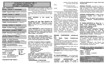XXVIISUNDAY IN ORDINARY TIME- A XXVII NIEDZIELA ZWYKŁA -CYKL A OCTOBER 2 –PAŻDZIERNIK 2005 Matthew’s point in today’s Gospel is evident: since MASS INTENTIONS Monday – October 3 - Poniedziałek 8:00AM + Zygmunt Kaplan ( aniv.)( G. Wrotkowska) Tuesday – October 4 – Wtorek 8: 00PM + Cecylia Dygas ( Dominic Cylwa and family) Wednesday – October 5 – Środa 7:00PM + Franciszek Wolanski ( I. Wolanska ) Thursday – October 6 – Czwartek 8:00AM - For Mark and Heyd – 10 anniversary ( Parents and sister ) FIRST FRIDAY – October 7 – Piątek 8:00AM – Blessings for Mary and Larry Kehoe ( Children ) 7:00 PM +Eugenia Garczyńska ( Helena Dobrzańska ) Saturday - October 8 – Sobota 8:00AM + Fr. Stefan Kaczmarek 5:00 PM + Jan Helinski ( 27 anniv.) ( Children ) Sunday – October 9 - Niedziela 9:30AM – For all parishioners 11:00AM +Bolesław Buszyński ( Estate ) 7:00PM - MINISTRY OF THE WORD – LEKTORZY: October 8/9 2005 5:00PM – L. Fawcett 9:30AM – G. Wolfe 11:00AM – Ania Antcxzak Ania i Marlena Diecioł 7:00PM- Suzanne Comartin THOUGHTS FOR TODAY…. Israel rejected Jesus as Messiah, the Kingdom of God will be handed over to the gentiles. God’s word today may be: God’s grace is offered to everyone. Do not disappoint this gracious Giver. Make certain that God will not have to reject you. ------------------------------------------------------------- PRAY ROSARY October. in the month of ALLIANCE OF THE TWO HEARTS OF JESUS AND MARY – Rearation prayer Vigil will be held in our church on the First Friday, October 7/8. “COR’ WEEKEND for youth is November 4,5 and 6-th. It involves you in a new, exciting and challenging approach to your Catholic faith and daily living. For more information call Fred & Virgi- nia Eade – tel. 674-5110. NATIONAL LIFE CHAIN SUNDAY, October 2, 2005 from 2:00 to 3:00 PM in Chatham at corner St.Clair Street and Grand Ave. Prayer service in the Pines parking lot at 1:45PM. LETTERS TO BISHOP RONALD FABBRO. Many of you would like to write a letter to the Bishop of the Diocese of London and express their concerns and opinions on the closing of some parishes and churches.Here is the address: The Most Reverend Bishop Ronald P. Fabbro 1070 Waterloo Street London, Ontario N6A 3Y2 ( Personal and Confidential ) HAM AND TURKEY BINGO at St. Francis Xavier Hall, Canal Street,West, TILBURY, will be held on Sunday, October 2, 2005. Everyone welcome. Parish 150-th Committee is the host of that event. ROZWAŻANIE LITURGICZNE. Jedną z najbardziej niewiary- godnych rzeczy, jaka zdarzyła się w życiu Jezusa, było sobotę 22 pażdziernika br. O godz. 19:30 w Roy Thomson Hall. cenie Go przez tylu ludzi. A przecież przyszedł do SZKOŁA POLSKA rozpoczęła już zajęcia w odrzuswoich Chciał im wskazać drogę do wiecznego szcęścia.Oni jedna szukali doczesnego. I chyba dlatego Go odrzucili. Nie tylko Jezus był odrzucony. W Starym Testa- mencie tylu proroków zostało odrzuconych! Dlaczeg tak się stało? Wiele może być powodów do tego. Jeden wydaje się być słuszny i prawdziwy. Jest nim sama p r a w d a , która może dotknąć człowieka. Prawda Boża jest zawsze wymagająca. Zasługuje jadnak na uwagę i odpowiedż. Tą odpowiedzią jest zmiana życia i dostosowanie się do Bożych wymagań. Jeżeli prawda Boża uderza w nasze błędy i grzeszne postępki, wtedy zaczynamy się bronić przed nią albo nawet ją odrzucać. I w tedy dokonuje się tragiczna pomyłka; następuje odrzuce- nie samego Boga. O tej tragicznej pomyłce, której każdy z nas moe się dopuścić, mówia nam dzisiej- sze Czytania – pierwsze i trzecie – i dają nam poważne ostrzeżenia. ---------------------------------------------------- MIESIĄC PAŻDZIERNIK poświęcony jest Czci Matki Bożej Rożańcowej. Odmawiajmy tę modlitwę wspólnie w rodzinach albo prywatnie o pokój w świecie, zwycięstwo dobra i prawdy oraz o nawrócenie bezbożnych i grzeszników. Nabożeństwo Różańcowe w kościele będziemy mieć w piątki na zakończenie adoracji o godz. 6:40 i w ś rody po Mszy świętej. CAŁONOCNA ADORACJA WYNAGRA DZAJĄCA będzie w naszym kościele w I Piątek, tj. 7/8 pażdziernika. W I PIĄTEK MIESIĄCA - rano od godz.9:30 odwiedzanie chorych. Spowiedż – od godz, 18:00 KONCERT WDZIĘCZNOŚCI dla upamiętnienia Papieża Jana Pawła II organizuje „Studio Młodych” w Toronto w Klubie Polsko Kanadyjskim. Zajęcia odbywają się w piątki od godziny 5 do 7 wieczór. Zachęcamy rodziców, aby zapisali swoje dzieci na lekcje języka i kultury polskiej. Niech wiedzą z jakiego kraju się wywodzą, jak bogata jest historia i kultura polska. ZABAWA DOŻYNKOWA w Klubie Polsko- Kanadyjskim odbędzie się w sobotę 15 pażdziernika. KOLACJA o godz. 7:00. BILETY są do nabycia u Prezesa i członków Zarządu.Zapraszamy wszystkich! W KAŻDĄ NIEDZIELĘ po Mszy św. o godz. 11.00 odmawiamy różaniec o zacho-wanie naszej parafii. KWIATY DO KOŚCIO£A… Można przynosić w różnych intencjach i na życzenie ogłosimy w biuletynie ofiarodawcę i intencje. Potrzebna jest koordynacja, aby kwiaty były przynoszone każdego tygodnia. Prosimy w tej sprawie porozumiewać się z Paniami: B. Debicką (tel.683-2062) lub Z. Koziołek – ( tel. 351-6160 ). SERDECZNE PODZIĘKOWANIA wszystkim za udział w pogrzebie męża Bronsiława Nalewayek, za modlitwy i kwiaty; szczególne dzięki Ks. Piotrowi, ks. Stanisławowi, Siostrze Maris, Ben Kaminskiemu, Katie i Antoniemu Jedlińskiemu, Tom Peseski and Staff,Pall Beares, Carolyn and Veronica - składa Louise Nalewayek. God bless you! (NACZYNIA po ks. Tadeuszu są do odebrania !) USHER’S CAPTAINS – KOLEKTORZY OCTOBER 8/9, 2005 5:00pm. - C. Bechard 9:30am. - D. Decola 11:00am. – K. Dusik – J. kaminski 7:00p.m. - J. Quirion SUNDAY’S COLLECTION Sunday Collecti o n - $ 1,5 2 7 . 2 0 Building Fund - $ 105. 0 0 Seminary of the Soc.of Chr.- $ 1,12 5 . 1 8 GOD BLESS YOU - BÓG ZAP£AĆ !