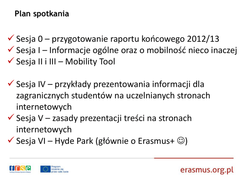 Plan spotkania Sesja 0 – przygotowanie raportu końcowego 2012/13 Sesja I – Informacje ogólne oraz o mobilność nieco inaczej Sesja II i III – Mobility Tool Sesja IV – przykłady prezentowania informacji dla zagranicznych studentów na uczelnianych stronach internetowych Sesja V – zasady prezentacji treści na stronach internetowych Sesja VI – Hyde Park (głównie o Erasmus+ ) Sesja I Informacje ogólne Warszawa-Miedzeszyn, 22-23 października 2013 r. Zmiany organizacyjne w FRSE Dyrektor Generalny FRSE Mirosław Marczewski Z-ca Dyrektora Generalnego, Dyrektor programu „Młodzież w działaniu”, Dyrektor programu LLP (Comenius) Tomasz Bratek Dyrektor Programu LLP (Leonardo da Vinci i Grundtvig) Dyrektor Programu LLP (Erasmus) i eTwinning Marcin Rolnik dr Tomasz Szymczak Erasmus 2011/12 – podstawowe dane statystyczne SMS – wyjazdy studentów na studia Zrealizowano 12.106 wyjazdów (+4,6%) Średnia długość pobytu 5,93 miesiąca Średnia wysokość miesięcznego stypendium 396 € Wykorzystano ok. 28,5 mln € Dofinansowanie z innych źródeł 2,7 % budżetu Erasmusa (ok. 0,8 mln €) Skala wyjazdów od 1 do 1076 10 pierwszych uczelni zrealizowało 43% wszystkich wyjazdów 54 uczelni zrealizowało od 1 do 5 wyjazdów Erasmus 2011/12 – podstawowe dane statystyczne SMP – wyjazdy studentów na praktyki Zrealizowano 3.209 wyjazdów (+20,5%) Średnia długość pobytu 3,29 miesiąca Średnia wysokość miesięcznego stypendium 443 € Wykorzystano ok. 4,68 mln € Dofinansowanie z innych źródeł 2,97 % budżetu Erasmusa (ok. 0,13 mln €) Skala wyjazdów od 1 do 272 10 pierwszych uczelni zrealizowało 40% wszystkich wyjazdów 67 uczelni zrealizowało od 1 do 5 wyjazdów Erasmus 2011/12 – podstawowe dane statystyczne STA – wyjazdy nauczycieli w celu prowadzenia zajęć dydaktycznych Zrealizowano 3.976 wyjazdów (+18%) oraz 46 przyjazdy przedstawicieli zagranicznych przedsiębiorstw (+ 42%) Średnia długość pobytu 6,14 dnia Średnia wysokość miesięcznego stypendium 757 € Wykorzystano ok. 3,042 mln € Dofinansowanie z innych źródeł 9,38 % budżetu Erasmusa (ok. 0,28 mln €) Skala wyjazdów od 1 do 228 10 pierwszych uczelni zrealizowało 36 % wszystkich wyjazdów 101 uczelni zrealizowało od 1 do 5 wyjazdów Erasmus 2011/12 – podstawowe dane statystyczne STT – wyjazdy pracowników w celach szkoleniowych Zrealizowano 2.318 wyjazdów (+26%) Średnia długość pobytu 6,19 dnia Średnia wysokość miesięcznego stypendium 815 € Wykorzystano ok. 1,88 mln € Dofinansowanie z innych źródeł 8,63 % budżetu Erasmusa (ok. 0,16 mln €) Skala wyjazdów od 1 do 160 10 pierwszych uczelni zrealizowało 40 % wszystkich wyjazdów 104 uczelni zrealizowało od 1 do 5 wyjazdów Erasmus 2011/12 - wykorzystane fundusze w mln euro 0,8 0,13 0,09 4,9 3,6 Mobilność studentów Mobilność pracowników uczelni Organizacja mobilności 33,1 Projekty typu kursy intensywne Intensywne kursy jezykowe EILC Wizyty przygotowawcze Wyjazdy studentów 2011/12 – kraje docelowe 2 721 2 228 1 326 1 253 1 176 801 Hiszpania Niemcy Włochy Francja Portugalia Wielka Brytania 1. 2. 3. 4. 5. 6. Mobilność studentów – Polska Praktyki Erasmusa (wprowadzone w roku 2007/08) Rok Liczba wyjazdów polskich studentów na praktyki 2007/08 2008/09 2009/10 2010/11 2011/12 Ogółem 975 1618 2408 2662 3209 10 872 Dokąd wyjeżdża na praktyki najwięcej polskich studentów? Popularne kraje docelowe w latach 2007 - 2012 1935 1904 1111 1088 802 Hiszpania Niemcy 1. 2. Grecja 3. 685 Wielka Włochy Francja Brytania 4. 5. 6. Mobilność studentów – przyjazdy do Polski Ogółem w latach 1998 – 2012 przyjechało do Polski ponad 45 tys. zagranicznych studentów Erasmusa. Od 1998 roku liczba przyjazdów wzrosła 41-krotnie. Wybrane lata 1998/99 2004/05 2007/08 2009/10 2010/11 2011/12 Ogółem 1998-2012 Liczba przyjazdów zagranicznych studentów (studia i praktyki) 220 2332 4446 6070 7583 8972 45 624 Mobilność studentów – przyjazdy do Polski Skąd przyjechało najwięcej stypendystów Erasmusa? 2495 Przyjazdy w roku 2011/12 1965 Przyjazdy w latach 1998/99 – 2011/12 Hiszpania Turcja Niemcy 1. 2. 3. Francja Portugalia Włochy 4. 5. 6. Czechy Węgry 167 Włochy 3081 168 Francja 3879 455 Portugalia 5508 743 Niemcy 6579 756 Turcja 7023 829 Hiszpania 8813 1. 2. 3. 4. 5. 6. 7. 8. 1095 1016 Czechy Belgia 7. 8. Mobilność pracowników uczelni - Polska Popularne kraje docelowe w roku 2011/12 811 Kraje, do których wyjechało najwięcej pracowników polskich uczelni w roku 2011/12 790 530 520 446 Hiszpania Niemcy Włochy Czechy Słowacja 414 Portugalia