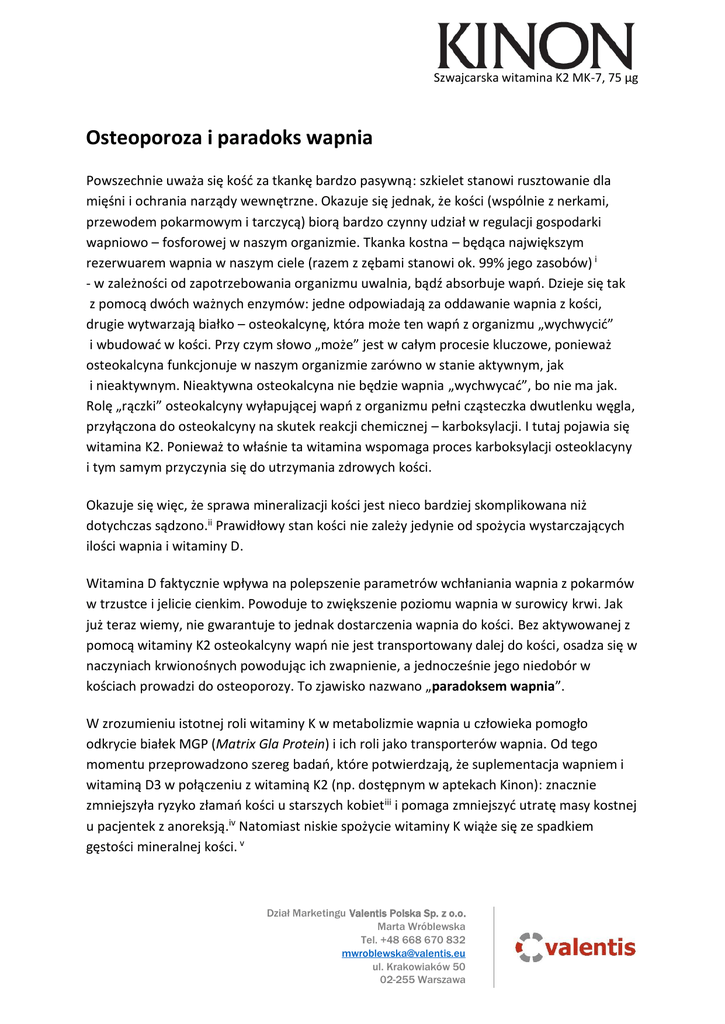 Szwajcarska witamina K2 MK-7, 75 µg Osteoporoza i paradoks wapnia Powszechnie uważa się kość za tkankę bardzo pasywną: szkielet stanowi rusztowanie dla mięśni i ochrania narządy wewnętrzne. Okazuje się jednak, że kości (wspólnie z nerkami, przewodem pokarmowym i tarczycą) biorą bardzo czynny udział w regulacji gospodarki wapniowo – fosforowej w naszym organizmie. Tkanka kostna – będąca największym rezerwuarem wapnia w naszym ciele (razem z zębami stanowi ok. 99% jego zasobów) i - w zależności od zapotrzebowania organizmu uwalnia, bądź absorbuje wapń. Dzieje się tak z pomocą dwóch ważnych enzymów: jedne odpowiadają za oddawanie wapnia z kości, drugie wytwarzają białko – osteokalcynę, która może ten wapń z organizmu „wychwycić” i wbudować w kości. Przy czym słowo „może” jest w całym procesie kluczowe, ponieważ osteokalcyna funkcjonuje w naszym organizmie zarówno w stanie aktywnym, jak i nieaktywnym. Nieaktywna osteokalcyna nie będzie wapnia „wychwycać”, bo nie ma jak. Rolę „rączki” osteokalcyny wyłapującej wapń z organizmu pełni cząsteczka dwutlenku węgla, przyłączona do osteokalcyny na skutek reakcji chemicznej – karboksylacji. I tutaj pojawia się witamina K2. Ponieważ to właśnie ta witamina wspomaga proces karboksylacji osteoklacyny i tym samym przyczynia się do utrzymania zdrowych kości. Okazuje się więc, że sprawa mineralizacji kości jest nieco bardziej skomplikowana niż dotychczas sądzono.ii Prawidłowy stan kości nie zależy jedynie od spożycia wystarczających ilości wapnia i witaminy D. Witamina D faktycznie wpływa na polepszenie parametrów wchłaniania wapnia z pokarmów w trzustce i jelicie cienkim. Powoduje to zwiększenie poziomu wapnia w surowicy krwi. Jak już teraz wiemy, nie gwarantuje to jednak dostarczenia wapnia do kości. Bez aktywowanej z pomocą witaminy K2 osteokalcyny wapń nie jest transportowany dalej do kości, osadza się w naczyniach krwionośnych powodując ich zwapnienie, a jednocześnie jego niedobór w kościach prowadzi do osteoporozy. To zjawisko nazwano „paradoksem wapnia”. W zrozumieniu istotnej roli witaminy K w metabolizmie wapnia u człowieka pomogło odkrycie białek MGP (Matrix Gla Protein) i ich roli jako transporterów wapnia. Od tego momentu przeprowadzono szereg badań, które potwierdzają, że suplementacja wapniem i witaminą D3 w połączeniu z witaminą K2 (np. dostępnym w aptekach Kinon): znacznie zmniejszyła ryzyko złamań kości u starszych kobietiii i pomaga zmniejszyć utratę masy kostnej u pacjentek z anoreksją.iv Natomiast niskie spożycie witaminy K wiąże się ze spadkiem gęstości mineralnej kości. v Dział Marketingu Valentis Polska Sp. z o.o. Marta Wróblewska Tel. +48 668 670 832 [email protected] ul. Krakowiaków 50 02-255 Warszawa Szwajcarska witamina K2 MK-7, 75 µg BIOGRAFIA 1. 2. i mgr inż. Beata Przygoda, Wapń, http://dieta.mp.pl/zasady/show.html?id=73823 Finkelstein Joel S, M.D. Calcium plus vitamin D for postmenopausal women – bone appétit? New England J. Med., 2006; 354(10):1102. 3. iii Sato Y, Kanoko T, Satoh K, Iwamoto J, Menatetrenon and Vitamin D2 with calcium supplements prevent nonvertebral fracture in elderly women with Alzheimer’s disease. Bone. 2005; 36: 61-68. 4. iv Iketani T, Kiriike N, Stein M B, i inni, Effect of menatetrenone (vitamin K2) treatment on bone loss in patients with anorexia nervosa. Psychiatry Res. 2003;117: 259–269. 5. v Booth SL, Broe KE, Gagnon DR, i inni. Vitamin K intake and bone mineral density in women and men. Am J Clin Nutr. 2003; 77:512-6. ii Dział Marketingu Valentis Polska Sp. z o.o. Marta Wróblewska Tel. +48 668 670 832 [email protected] ul. Krakowiaków 50 02-255 Warszawa