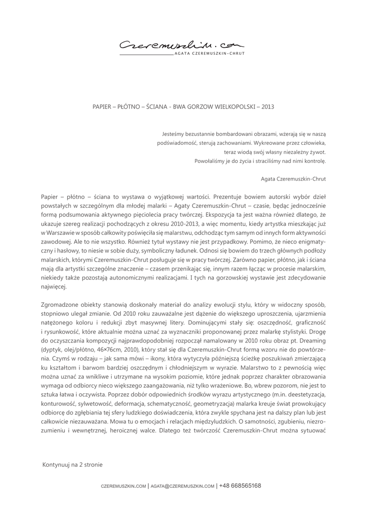 AGATA CZEREMUSZKIN-CHRUT krzywe PAPIER – PŁÓTNO – ŚCIANA - BWA GORZOW WIELKOPOLSKI – 2013 Jesteśmy bezustannie bombardowani obrazami, wżerają się w naszą podświadomość, sterują zachowaniami. Wykreowane przez człowieka, teraz wiodą swój własny niezależny żywot. Powołaliśmy je do życia i straciliśmy nad nimi kontrolę. Agata Czeremuszkin-Chrut Papier – płótno – ściana to wystawa o wyjątkowej wartości. Prezentuje bowiem autorski wybór dzieł powstałych w szczególnym dla młodej malarki – Agaty Czeremuszkin-Chrut – czasie, będąc jednocześnie formą podsumowania aktywnego pięciolecia pracy twórczej. Ekspozycja ta jest ważna również dlatego, że ukazuje szereg realizacji pochodzących z okresu 2010-2013, a więc momentu, kiedy artystka mieszkając już w Warszawie w sposób całkowity poświęciła się malarstwu, odchodząc tym samym od innych form aktywności zawodowej. Ale to nie wszystko. Również tytuł wystawy nie jest przypadkowy. Pomimo, że nieco enigmatyczny i hasłowy, to niesie w sobie duży, symboliczny ładunek. Odnosi się bowiem do trzech głównych podłoży malarskich, którymi Czeremuszkin-Chrut posługuje się w pracy twórczej. Zarówno papier, płótno, jak i ściana mają dla artystki szczególne znaczenie – czasem przenikając się, innym razem łącząc w procesie malarskim, niekiedy także pozostają autonomicznymi realizacjami. I tych na gorzowskiej wystawie jest zdecydowanie najwięcej. Zgromadzone obiekty stanowią doskonały materiał do analizy ewolucji stylu, który w widoczny sposób, stopniowo ulegał zmianie. Od 2010 roku zauważalne jest dążenie do większego uproszczenia, ujarzmienia natężonego koloru i redukcji zbyt masywnej litery. Dominującymi stały się: oszczędność, graficzność i rysunkowość, które aktualnie można uznać za wyznaczniki proponowanej przez malarkę stylistyki. Drogę do oczyszczania kompozycji najprawdopodobniej rozpoczął namalowany w 2010 roku obraz pt. Dreaming (dyptyk, olej/płótno, 46×76cm, 2010), który stał się dla Czeremuszkin-Chrut formą wzoru nie do powtórzenia. Czymś w rodzaju – jak sama mówi – ikony, która wytyczyła późniejszą ścieżkę poszukiwań zmierzającą ku kształtom i barwom bardziej oszczędnym i chłodniejszym w wyrazie. Malarstwo to z pewnością więc można uznać za wnikliwe i utrzymane na wysokim poziomie, które jednak poprzez charakter obrazowania wymaga od odbiorcy nieco większego zaangażowania, niż tylko wrażeniowe. Bo, wbrew pozorom, nie jest to sztuka łatwa i oczywista. Poprzez dobór odpowiednich środków wyrazu artystycznego (m.in. deestetyzacja, konturowość, sylwetowość, deformacja, schematyczność, geometryzacja) malarka kreuje świat prowokujący odbiorcę do zgłębiania tej sfery ludzkiego doświadczenia, która zwykle spychana jest na dalszy plan lub jest całkowicie niezauważana. Mowa tu o emocjach i relacjach międzyludzkich. O samotności, zgubieniu, niezrozumieniu i wewnętrznej, heroicznej walce. Dlatego też twórczość Czeremuszkin-Chrut można sytuować Kontynuuj na 2 stronie czeremuszkin.com | [email protected] | +48 668565168 AGATA CZEREMUSZKIN-CHRUT w obszarze sztuki neofiguratywnej, której podstawowe założenia zostały przetworzone nakrzywe indywidualny, autorski język wypowiedzi malarskiej. Agata Czeremuszkin-Chrut maluje cyklami, które – mniej, lub bardziej rozbudowane – układają się w logiczną pod względem stylistyczno-formalnym całość, doskonale ukazując w ten sposób nurtujące artystkę problemy. A są to zagadnienia związane przede wszystkim z człowiekiem – jego życiem, wyobcowaniem, emocjami i anonimowością. Są to również wszelkie procesy biologiczne, cielesność i energia, które przekształcane są w zapis malarski, ale nie celowy i zaplanowany, a podświadomy, zmysłowy i intuicyjny. Sztuka Agaty Czeremuszkin-Chrut nie jest jednak autobiograficzna. Jak sama zaznacza: Malując, opieram się głównie na materiale fotograficznym, począwszy od świetnych artystycznych aktów, po całkiem amatorskie migawki z telefonu komórkowego czy kadry z filmów. Inspiracji szukam w Internecie, gazetach, na ulicach. W najróżniejszych miejscach, sytuacjach i okolicznościach zdarza mi się zobaczyć coś, co zapisuje się w pamięci. Później te skrawki obrazów staram się odtwarzać w swoich pracach. Jedną z bardziej rozbudowanych serii jest cykl pt. Łóżka, który poświęcony został motywowi człowieka pogrążonego we śnie. Motyw ten nie jest tu najważniejszy, stanowiąc jedynie pretekst do eksperymentu malarskiego, który dla malarki jest istotnym czynnikiem konstytuującym akt twórczy. Dzieje się tak, gdyż – jak twierdzi – eksperymentowanie aktywizuje myślenie i pozwala wyjść poza własne ograniczenia i utarte ścieżki. Czasami przez przypadek można uzyskać dużo więcej, niżby się osiągnęło świadomie.2 I być może dlatego cykl pt. Łóżka nie jest jednorodny. Składa się bowiem z obrazów różniących się od siebie – zarówno pod względem formatu, stylisty- ki, jak i tematyki, a jedynym spajającym je elementem jest – mniej, lub bardziej dosłowny – motyw łóżka. Opierając się na znalezionych fotografiach, artystka przedstawia tu głównie ludzi anonimowych, którzy pozbawieni cech indywidualnych, poddani zostali zabiegowi uniwersalizacji. Jest jednak mały wyjątek. To prace inspirowane powszechnie znanymi fotografiami sław – m.in. Yoko Ono i Johna Lennona, Paul’a Newman’a i Joanne Woodward czy Kate Moss i Johnny’ego Depp’a – które intuicyjnie rozpoznajemy. Jednak pomimo oczywistych nawiązań kompozycyjnych, nie od- najdziemy tu bezpośrednich odwzorowań, a swobodną, ekspresyjną interpretację, której bliżej jest do sztuki nieprzedstawiającej, niż realistycznej. Warto jednak zauwa- żyć, że w niektórych obrazach, takich jak np. Lucian&Kate ( olej/płótno, 150×180, 2012) czy Johnny 
