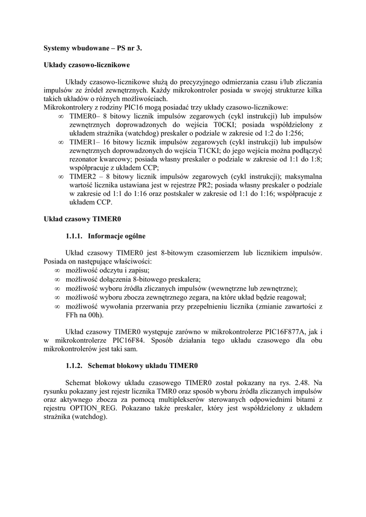 Systemy wbudowane – PS nr 3. Układy czasowo-licznikowe Układy czasowo-licznikowe służą do precyzyjnego odmierzania czasu i/lub zliczania impulsów ze źródeł zewnętrznych. Każdy mikrokontroler posiada w swojej strukturze kilka takich układów o różnych możliwościach. Mikrokontrolery z rodziny PIC16 mogą posiadać trzy układy czasowo-licznikowe: • TIMER0– 8 bitowy licznik impulsów zegarowych (cykl instrukcji) lub impulsów zewnętrznych doprowadzonych do wejścia T0CKI; posiada współdzielony z układem strażnika (watchdog) preskaler o podziale w zakresie od 1:2 do 1:256; • TIMER1– 16 bitowy licznik impulsów zegarowych (cykl instrukcji) lub impulsów zewnętrznych doprowadzonych do wejścia T1CKI; do jego wejścia można podłączyć rezonator kwarcowy; posiada własny preskaler o podziale w zakresie od 1:1 do 1:8; współpracuje z układem CCP; • TIMER2 – 8 bitowy licznik impulsów zegarowych (cykl instrukcji); maksymalna wartość licznika ustawiana jest w rejestrze PR2; posiada własny preskaler o podziale w zakresie od 1:1 do 1:16 oraz postskaler w zakresie od 1:1 do 1:16; współpracuje z układem CCP. Układ czasowy TIMER0 1.1.1. Informacje ogólne Układ czasowy TIMER0 jest 8-bitowym czasomierzem lub licznikiem impulsów. Posiada on następujące właściwości: • możliwość odczytu i zapisu; • możliwość dołączenia 8-bitowego preskalera; • możliwość wyboru źródła zliczanych impulsów (wewnętrzne lub zewnętrzne); • możliwość wyboru zbocza zewnętrznego zegara, na które układ będzie reagował; • możliwość wywołania przerwania przy przepełnieniu licznika (zmianie zawartości z FFh na 00h). Układ czasowy TIMER0 występuje zarówno w mikrokontrolerze PIC16F877A, jak i w mikrokontrolerze PIC16F84. Sposób działania tego układu czasowego dla obu mikrokontrolerów jest taki sam. 1.1.2. Schemat blokowy układu TIMER0 Schemat blokowy układu czasowego TIMER0 został pokazany na rys. 2.48. Na rysunku pokazany jest rejestr licznika TMR0 oraz sposób wyboru źródła zliczanych impulsów oraz aktywnego zbocza za pomocą multiplekserów sterowanych odpowiednimi bitami z rejestru OPTION_REG. Pokazano także preskaler, który jest współdzielony z układem strażnika (watchdog). Rys. 2.48. Schemat blokowy układu czasowego TIMER0 z preskalerem Kiedy preskaler jest niewykorzystywany, wejście zegara zewnętrznego jest tożsame z wyjściem preskalera. Synchronizacja sygnału z wejścia T0CKI z zegarem wewnętrznym odbywa się za pomocą próbkowania wyjścia preskalera w cyklach Q2 i Q4 zegara wewnętrznego. Dlatego niezbędne jest to, aby sygnał z wejścia T0CKI miał poziom wysoki przynajmniej przez czas dwóch okresów oscylatora (oraz krótkie opóźnienie wynoszące 20 ns) oraz poziom niski także przynajmniej przez czas równy dwóm okresom oscylatora (z opóźnieniem 20 ns). Kiedy preskaler jest używany, częstotliwość sygnału zegara zewnętrznego jest dzielona przez szeregowy licznik asynchroniczny i na wyjściu preskalera otrzymujemy przebieg symetryczny. Z tego powodu przy określaniu wymagań próbkowania należy wziąć pod uwagę ów szeregowy licznik asynchroniczny. Niezbędne jest, aby sygnał na wejściu T0CKI miał okres przynajmniej równy czterem okresom sygnału oscylatora (plus krótkie opóźnienie wynoszące 40 ns). Z powodu synchronizacji sygnału wejściowego z wewnętrznym zegarem powstaje małe opóźnienie pomiędzy zboczem sygnału z wejścia T0CKI a momentem inkrementacji rejestru TMR0. Sposób zliczania impulsów zewnętrznych pokazano na rys. 2.49. Rys. 2.49 Zliczanie impulsów zewnętrznych w układzie czasowym TIMER0 Układ czasowy TIMER0 ma możliwość generacji przerwania w momencie przepełnienia licznika. Przepełnienie licznika skutkuje ustawieniem bitu T0IF w rejestrze INTCON na jedynkę. Przerwanie to może zostać zamaskowane poprzez wyzerowanie bitu T0IE w rejestrze INTCON. Bit T0IF powinien zostać wyzerowany programowo w procedurze obsługi przerwania przed ponownym włączeniem przerwania od układu TIMER0. Układ czasowy TIMER0 nie jest zdolny do wybudzenia mikrokontrolera ze stanu uśpienia. Układ czasowy TIMER0 posiada możliwość dołączenia wewnętrznego 8-bitowego preskalera, który jest jednocześnie postskalerem dla układu licznika nadzorcy (watchdog). Użycie preskalera z układem TIMER0 powoduje, że nie jest on dostępny dla licznika nadzorcy i odwrotnie. Wybór układu, z którym połączony jest preskaler jest dokonywany za pomocą bitu PSA w rejestrze OPTION_REG. Jeżeli bit PSA jest ustawiony na jedynkę – preskaler jest dołączony do układu strażnika (WDT), a jeśli jest wyzerowany – do układu TIMER0. Współczynnik podziału preskalera jest ustawiany za pomocą bitów PS2:PS0 w rejestrze OPTION_REG. Sposób ustalania współczynnika podziału pokazano w tab. 2.12. Kiedy preskaler jest dołączony do układu TIMER0, wszystkie instrukcje modyfikujące rejestr TMR0 zerują preskaler. Kiedy preskaler jest dołączony do licznika nadzorcy instrukcja CLRWDT zerująca licznik nadzorcy – zeruje także preskaler. Do preskalera nie można zapisywać żadnych danych ani ich odczytywać. 1.1.3. Rejestry TMR0 i OPTION_REG Rejestr TMR0 jest głównym rejestrem układu TIMER0. Do tego rejestru zapisuje się wartość od której licznik ma rozpocząć zliczanie impulsów. Przepełnienie rejestru TMR0 powoduje wywołanie przerwania oraz ustawienie bitu T0IF na jedynkę. Rejestr OPTION_REG służy głównie do ustawiania opcji układu czasowego TIMER0. Struktura rejestru OPTION_REG została pokazana na rys. 2.50 Rys. 2.50. Struktura rejestru OPTION_REG Poniżej przedstawiono opis poszczególnych bitów rejestru OPTION_REG służących do konfiguracji układu TIMER0: • • • • T0CS – wybór źródła impulsów, które będzie zliczał Timer0; gdy T0CS = 1 źródłem impulsów jest wyprowadzenie T0CKI, dla T0CS = 0 impulsy pochodzą od zegara systemowego; T