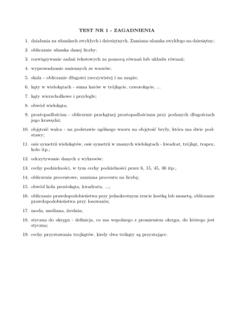 TEST NR 1 - ZAGADNIENIA 1. działania na ułamkach zwykłych i