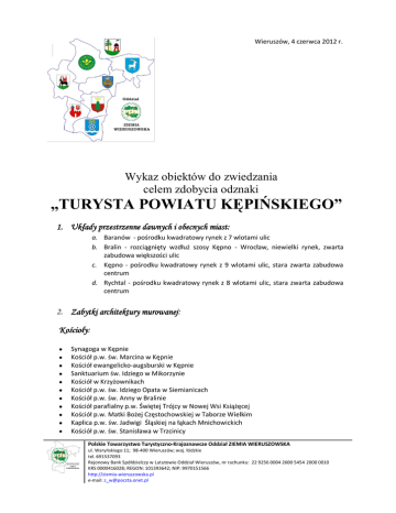Wieruszów, 4 czerwca 2012 r. Wykaz obiektów do zwiedzania celem zdobycia odznaki ,,TURYSTA POWIATU KĘPIŃSKIEGO” 1. Układy przestrzenne dawnych i obecnych miast: a. Baranów - pośrodku kwadratowy rynek z 7 wlotami ulic b. Bralin - rozciągnięty wzdłuż szosy Kępno - Wrocław, niewielki rynek, zwarta zabudowa większości ulic c. Kępno - pośrodku kwadratowy rynek z 9 wlotami ulic, stara zwarta zabudowa centrum d. Rychtal - pośrodku kwadratowy rynek z 8 wlotami ulic, stara zwarta zabudowa centrum 2. Zabytki architektury murowanej: Kościoły: Synagoga w Kępnie Kościół p.w. św. Marcina w Kępnie Kościół ewangelicko-augsburski w Kępnie Sanktuarium św. Idziego w Mikorzynie Kościół w Krzyżownikach Kościół p.w. św. Idziego Opata w Siemianicach Kościół p.w. św. Anny w Bralinie Kościół parafialny p.w. Świętej Trójcy w Nowej Wsi Książęcej Kościół p.w. Matki Bożej Częstochowskiej w Taborze Wielkim Kaplica p.w. św. Jadwigi Śląskiej na łąkach Mnichowickich Kościół p.w. św. Stanisława w Trzcinicy Polskie Towarzystwo Turystyczno-Krajoznawcze Oddział ZIEMIA WIERUSZOWSKA ul. Waryńskiego 11; 98-400 Wieruszów; woj. łódzkie tel. 691537093 Rejonowy Bank Spółdzielczy w Lututowie Oddział Wieruszów, nr rachunku: 22 9256 0004 2600 5454 2000 0010 KRS 0000416028; REGON: 101393642; NIP: 9970151566 http://ziemia-wieruszowska.pl e-mail: [email protected] Pałace i dworki: Pałac Feliksa Wężyka w Mroczeniu Pałac Szembeków w Siemianicach Pałac Mańkowskich w Grębaninie Pałac w Laskach z 1908 r. Pałac w Słupi pod Kępnem Pałac w Skoroszowie Pałac w Pomianach z 1890 r. Dworek w Nosalach z 1803 r. Dworek w Domaninie Dworek w Mikorzynie Dworek w Ustroniu - dawny pałacyk myśliwski z 1877 r. Dworek w Wielkim Buczku Donaborów - dwór z zamkiem z pocz. XIX w., park koniec XIX w. Drożki - dwór i park z I poł. XIX w. Łęka Opatowska - dwór (obecnie szkoła) park z 2 poł. XIX w. Mikorzyn - dwór z 1786 r., park, ogrodzenie Perzów - pałac z II poł. XIX w. Rzetnia - dwór i park z 1910 r. Stogniew - budynek mieszkalny z przełomu XIX/XX w. Teklin - dwór, park z 1870 r. Trzcinica - dwór z 1880 r. Wesoła - dworek Szembeków z pocz. XX w. Wielki Buczek - dwór i park 3. Zabytki architektury murowanej – kaplice o o o o 4. Bandlów – p.w. Św. Jadwigi XIX/XX w. Czermin - p.w. Św. Józefa koniec XIX w. (dawny zbór Baptystów) Mnichowice - p.w. Św. Jadwigi 1890-91 – 1.5 km od wsi Raków - p.w. NBP Częstochowskiej – neoromańska z 1863 r. Zabytki budownictwa drewnianego - kościoły: o o o o o o o o o o o o o św. Rocha w Proszowie Kościół p.w. św. Wawrzyńca i Andrzeja w Baranowie kościół Narodzenia Najświętszej Marii Panny "Na Pólku" w Bralinie Kościół p.w. św. Filipa i Jakuba Apostołów w miejscowości Koza Wielka Kościół p.w. św. Andrzeja w Słupi pod Bralinem Kościół p.w. Wniebowzięcia Matki Boskiej w Laskach Kościół p.w. NMP Niepokalanie Poczętej w Grębaninie Kościół WNMP i św. Mikołaja w Kierznie Kościół p.w. Jadwigi Śląskiej - Olszowa Kościół p.w. Katarzyny Aleksandryjskiej w Świbie Kościół p.w. Filipa i Jakuba Apostołów w Kozie Wielkiej Kościół p.w. Jana Nepomucena w Drożkach Kościół p.w. Jana Nepomucena w Wielkim Buczku Polskie Towarzystwo Turystyczno-Krajoznawcze Oddział ZIEMIA WIERUSZOWSKA ul. Waryńskiego 11; 98-400 Wieruszów; woj. łódzkie tel. 691537093 Rejonowy Bank Spółdzielczy w Lututowie Oddział Wieruszów, nr rachunku: 22 9256 0004 2600 5454 2000 0010 KRS 0000416028; REGON: 101393642; NIP: 9970151566 http://ziemia-wieruszowska.pl e-mail: [email protected] 5. Muzea: Muzeum Ziemi Kępińskiej im. Tadeusza, Piotra Potworowskiego w Kępnie, Izba Pamięci Wsi Raków. 6. Miejsca pamięci i cmentarze: Remiszówka - zbiorowy grób konfederatów barskich, Siemianice - tablica umieszczona na elewacji frontowej kościoła, Opatów - obelisk - cmentarz parafialny Poległym za Wolność 1918 - 1920, Korzeń - pomnik upamiętniający bitwę, rozegraną w czasie powstania wielkopolskiego 19.02.1919 r., Mnichowice - obelisk ku pamięci Antoniego Gabriela, Nowa Wieś Książęca - obelisk ku pamięci Jana Nowaka - obrońcy Poczty Gdańskiej w 1939 r. Lipnik - obelisk upamiętniający śmierć Ks. Prałata Jana Ćwiejkowskiego. Czermin - dawny cmentarz Baptystów koniec XIX w. Darnowiec - groby żołnierzy armii napoleońskiej ( 2.5 km od wsi na południe w lesie) Grębanin - cmentarz przykościelny – grób rotmistrza Wojska Polskiego Gabriela Hawryło Holoubka zginął w 1588 r. pod Byczyną Kępno - cmentarz katolicki zał. w XIX w. - grób z pomnikiem 5 żołnierzy poległych w latach 1920-22 Mielęcin - dawny cmentarz ewangelicki XIX w. i grobowiec na wzgórzu Weroniki Masłowskiej Mikorzyn - cmentarz - mogiła 4 żołnierzy WP poległych 1 IX 1939 r., obelisk upamiętniający ofiary II wojny światowej Myjomice - grób Andrzeja Kurzawy i Stanisława Mulczyńskiego uczestników Powstania Wielkopolskiego Olszowa - grób gen Chrzanowskiego uczestnika Powstania Listopadowego Osiny - dom nr 59 - miejsce pochowania w 1812r. żołnierzy napoleońskich Słupia pod Kępnem - cmentarz - grób Franciszka Hełki ofiary obozu w Oświęcimiu, Franciszka Skąpskiego uczestnika Powstania Wielkopolskiego Tabor Stary - cmentarz, zwany także husyckim - około 4 km od Taboru Wielkiego przy drodze do leśniczówki Lipnik. Znajdują się tam groby dwóch pastorów, głaz pomnik upamiętniający wieś Stary Tabor istniejącą w latach 1775-1885) 7. Obiekty turystyczne: Grodzisko średniowieczne, tzw. "Kopiec" w Kępnie unikalny dwupoziomowy dworzec kolejowy w Kępnie z krzyżowym usytuowaniem peronów (jeden z dwu tego rodzaju obiektów w Polsce) Kępno - ratusz miejski z 1846 roku Kępno domy mieszczańskie z II poł. XVIII i XIX w. Kapliczka św. Jadwigi wśród łąk pod Krzyżownikami Polskie Towarzystwo Turystyczno-Krajoznawcze Oddział ZIEMIA WIERUSZOWSKA ul. Waryńskiego 11; 98-400 